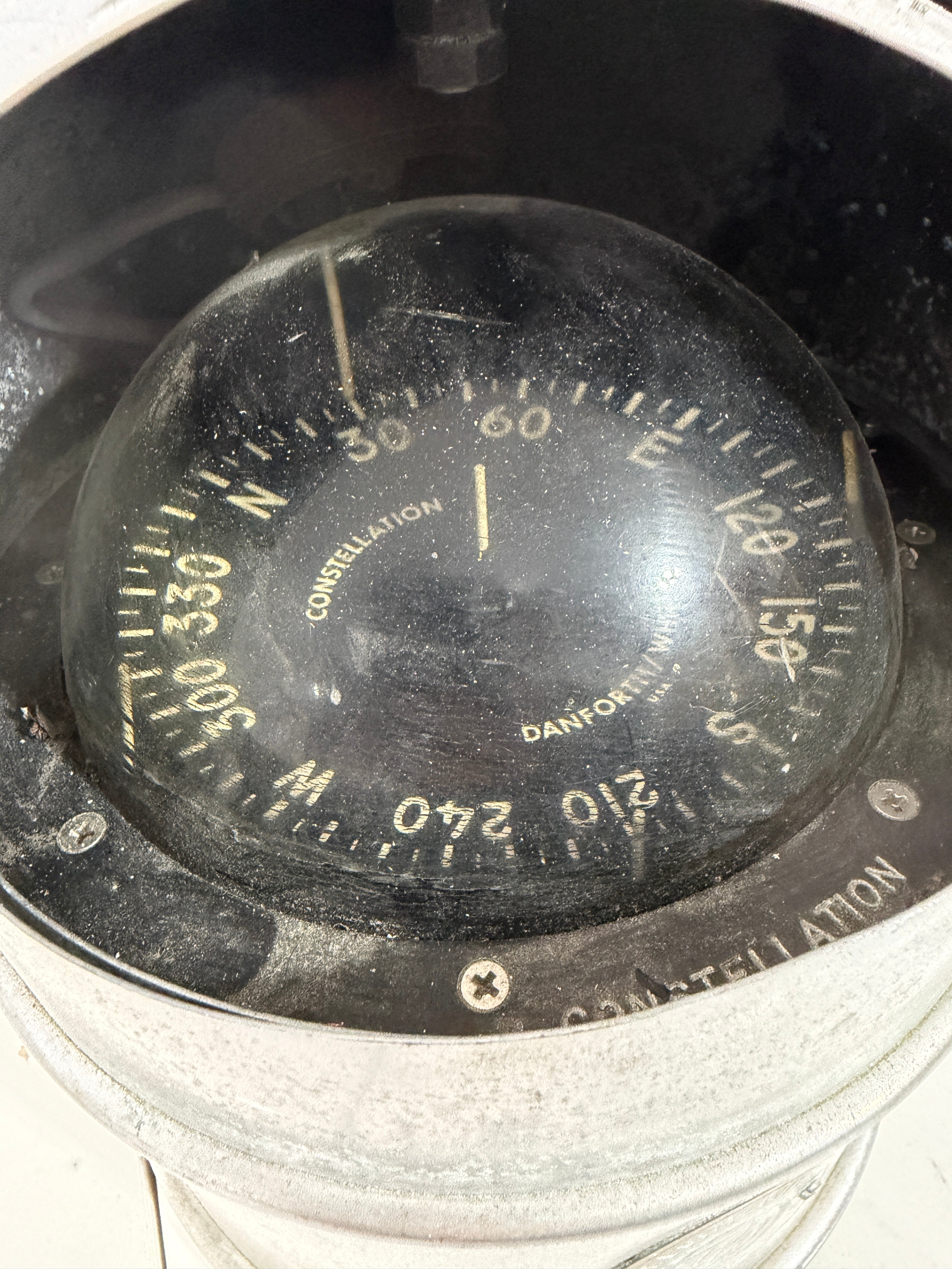 This compass and housing is in great condition. It was removed off an allied Seabreeze 33. The compass is a danforth white constellation. The housing is chromed bronze. Does have some denting and pitting to it. The screen cover moves well. The base is 7" diameter and the 4 bolt mounting area is 3 3/8" apart. It stands 8 1/2" total height. Will not separate.