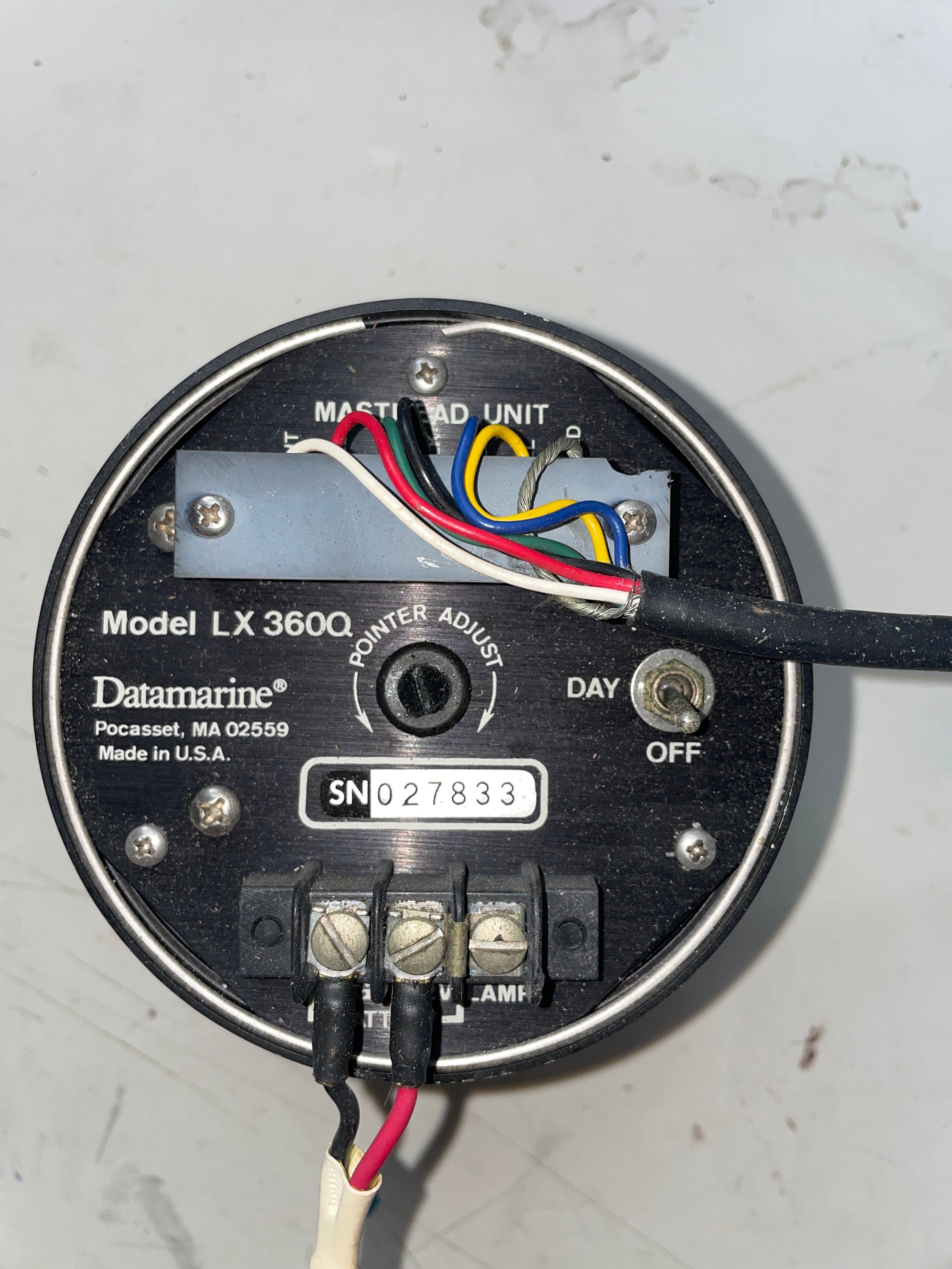 This datamarine wind mast head unit instrument is in great condition. Incredibly clean looking unit. It is model LX 360Q. SN: 027833. It is 5” surface diameter. Comes with the protective cover.