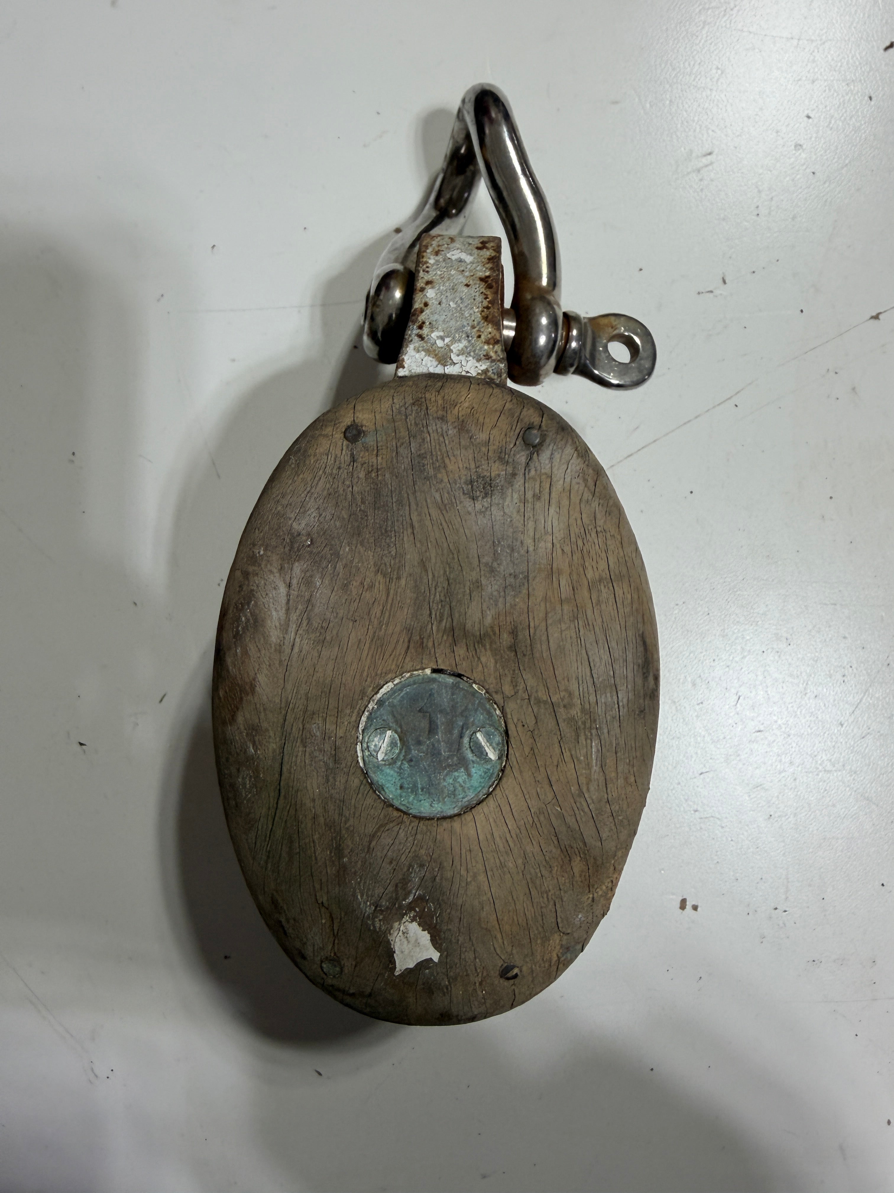 Overall solid condition for the wood. Galvanized fitting is rusted but solid. Comes with a Stainless steel twisted shackle. The sheaves are solid bronze - 2 1/4" and fit MAX 7/16" line.