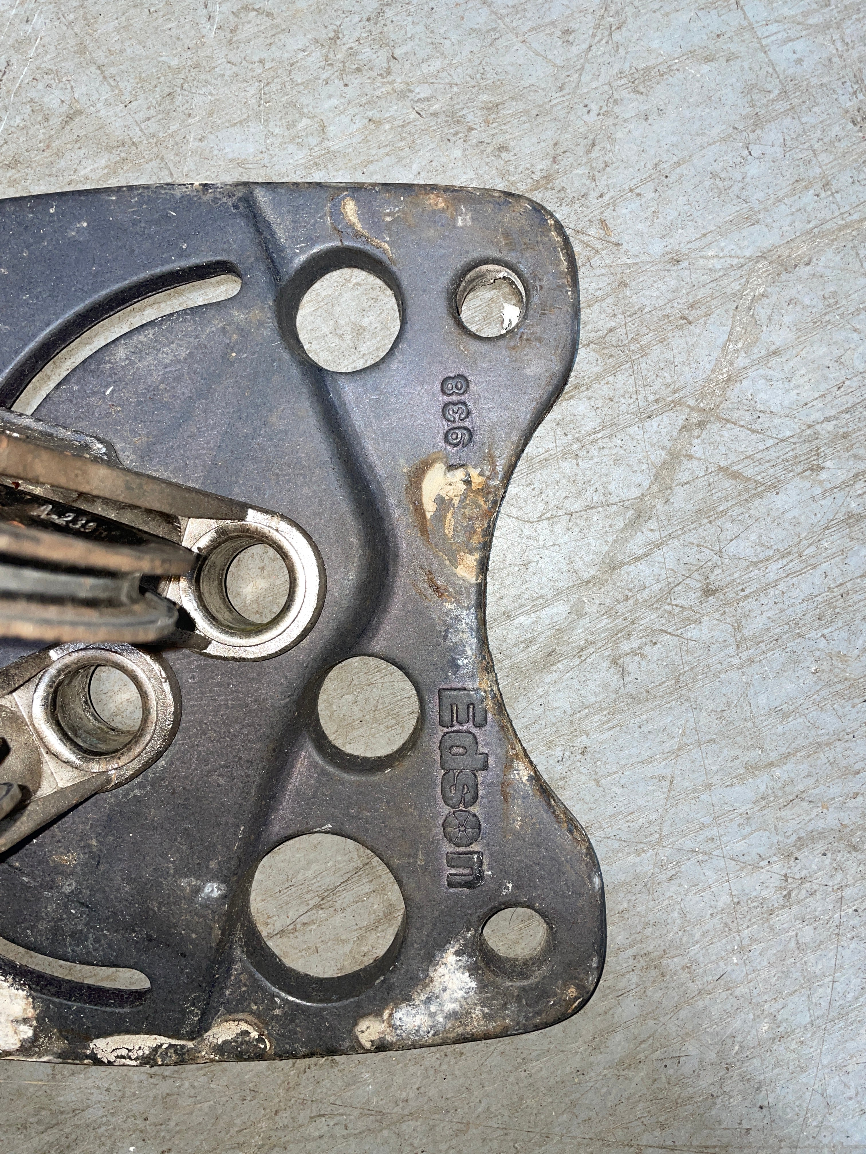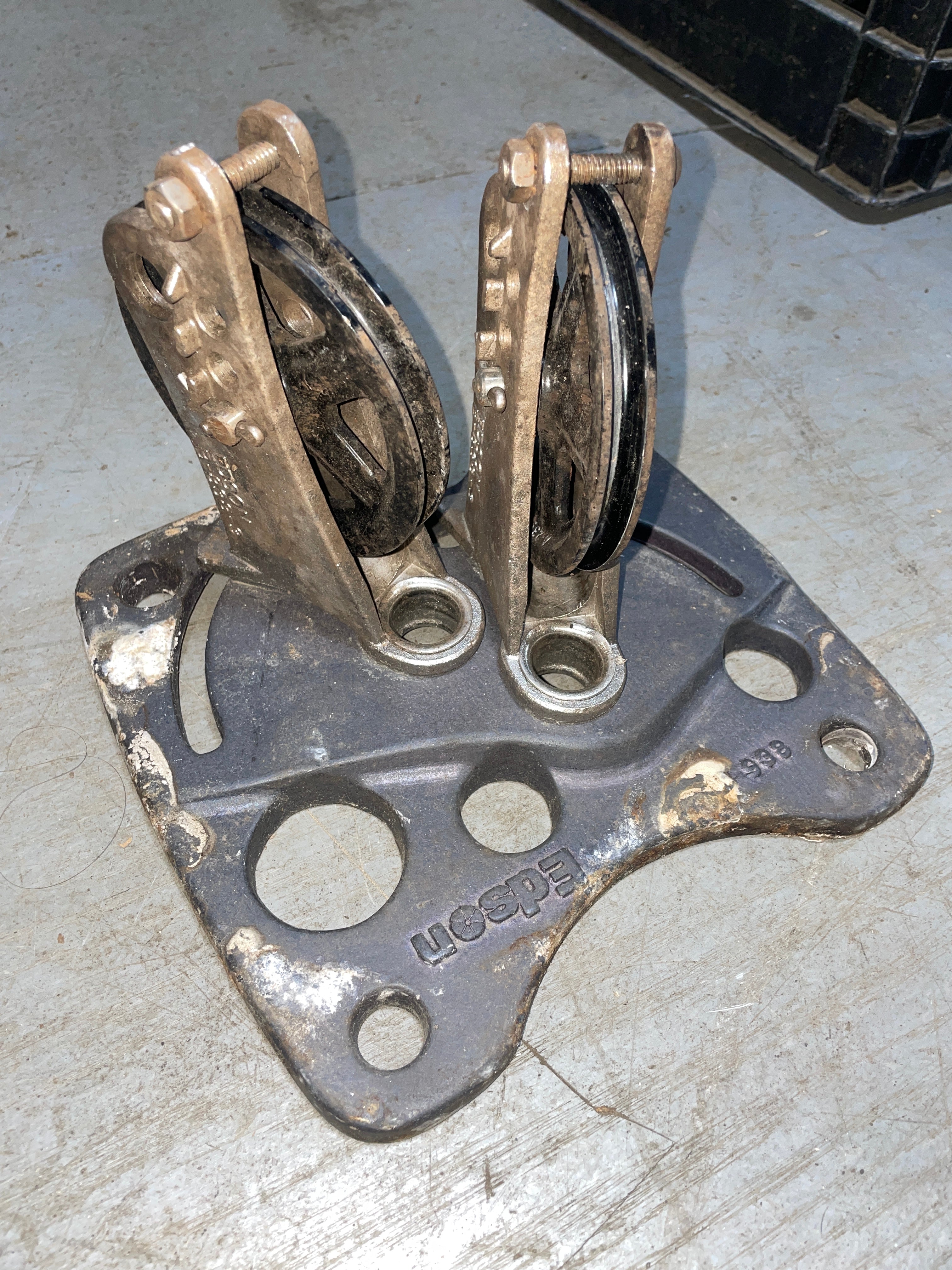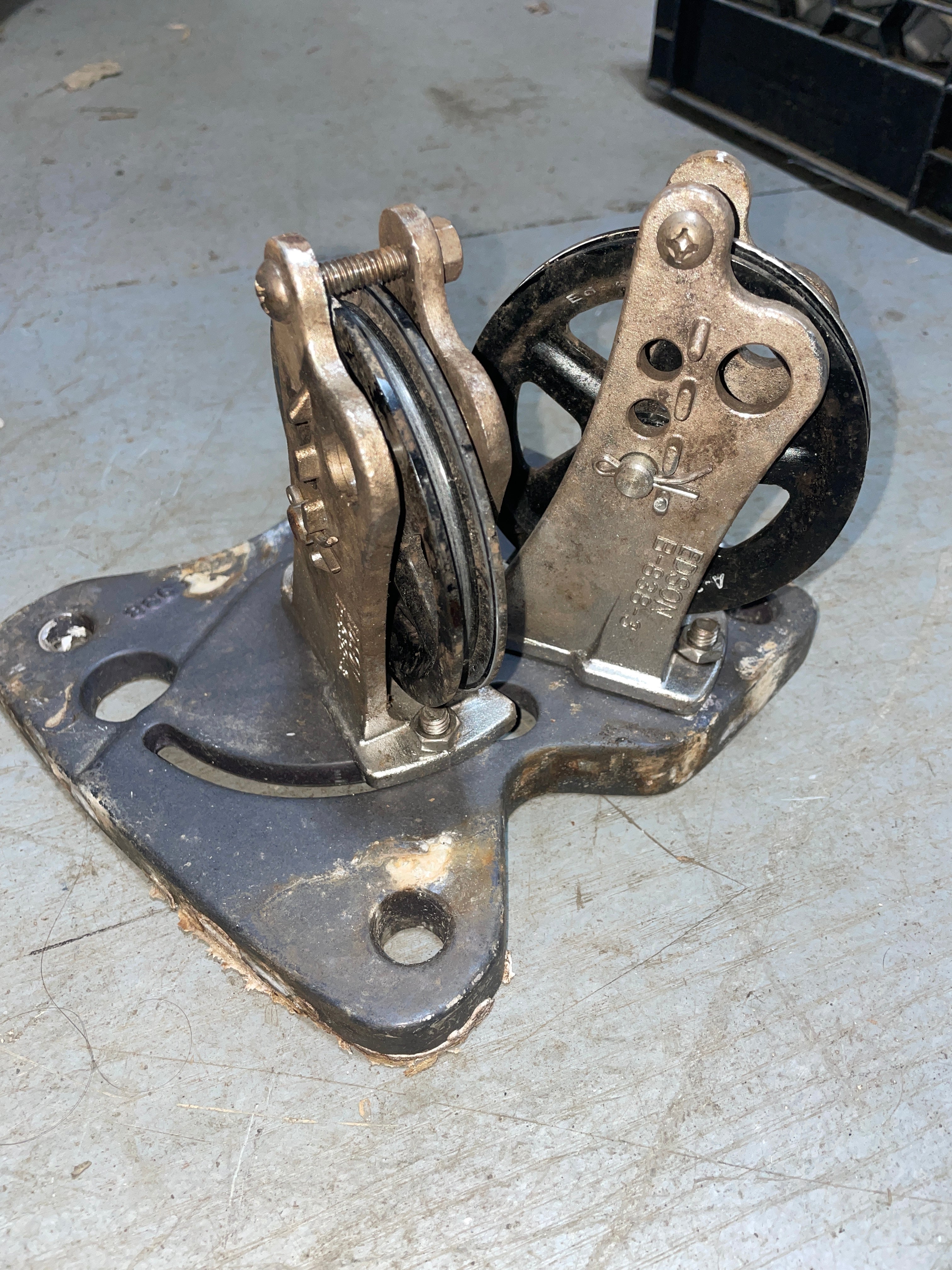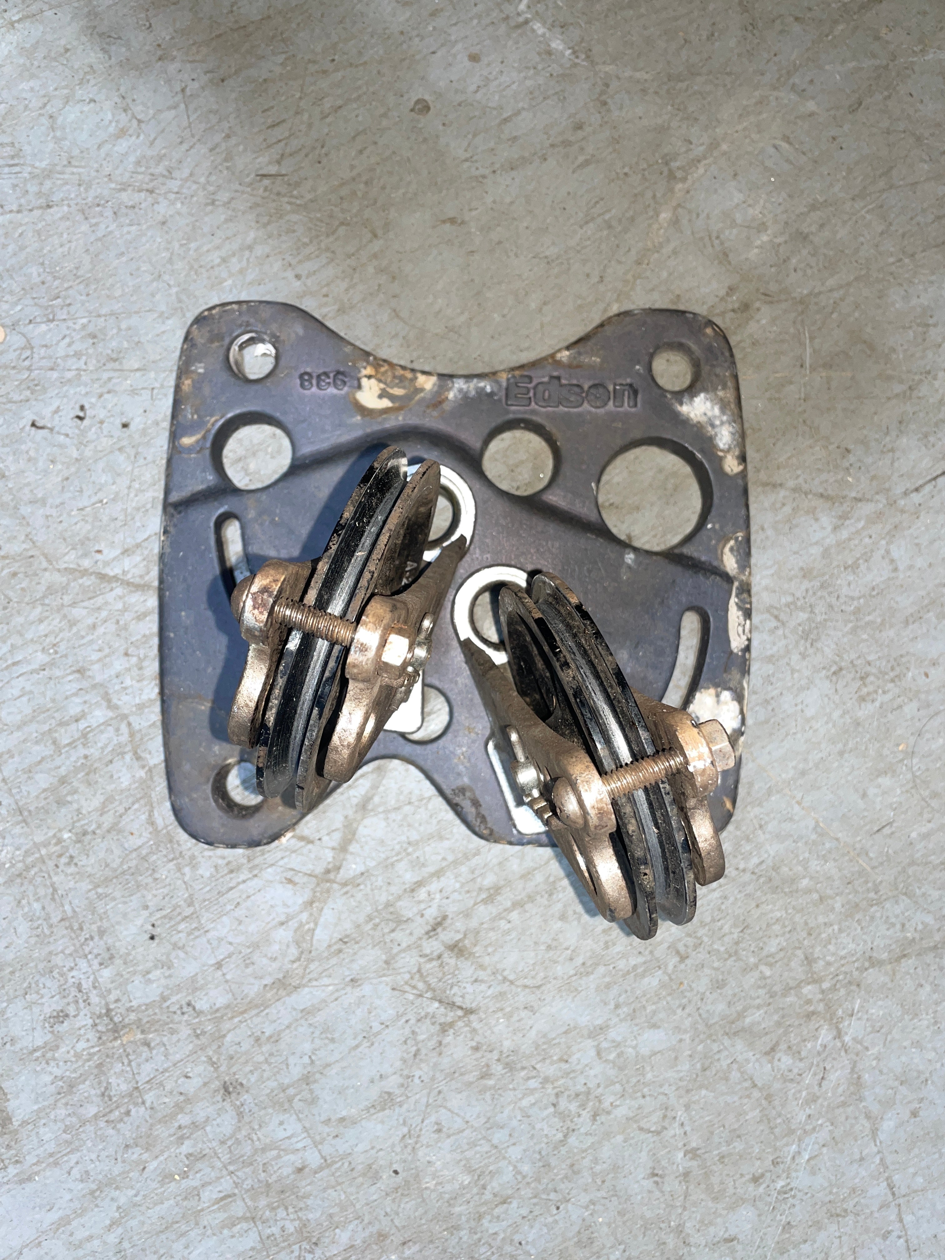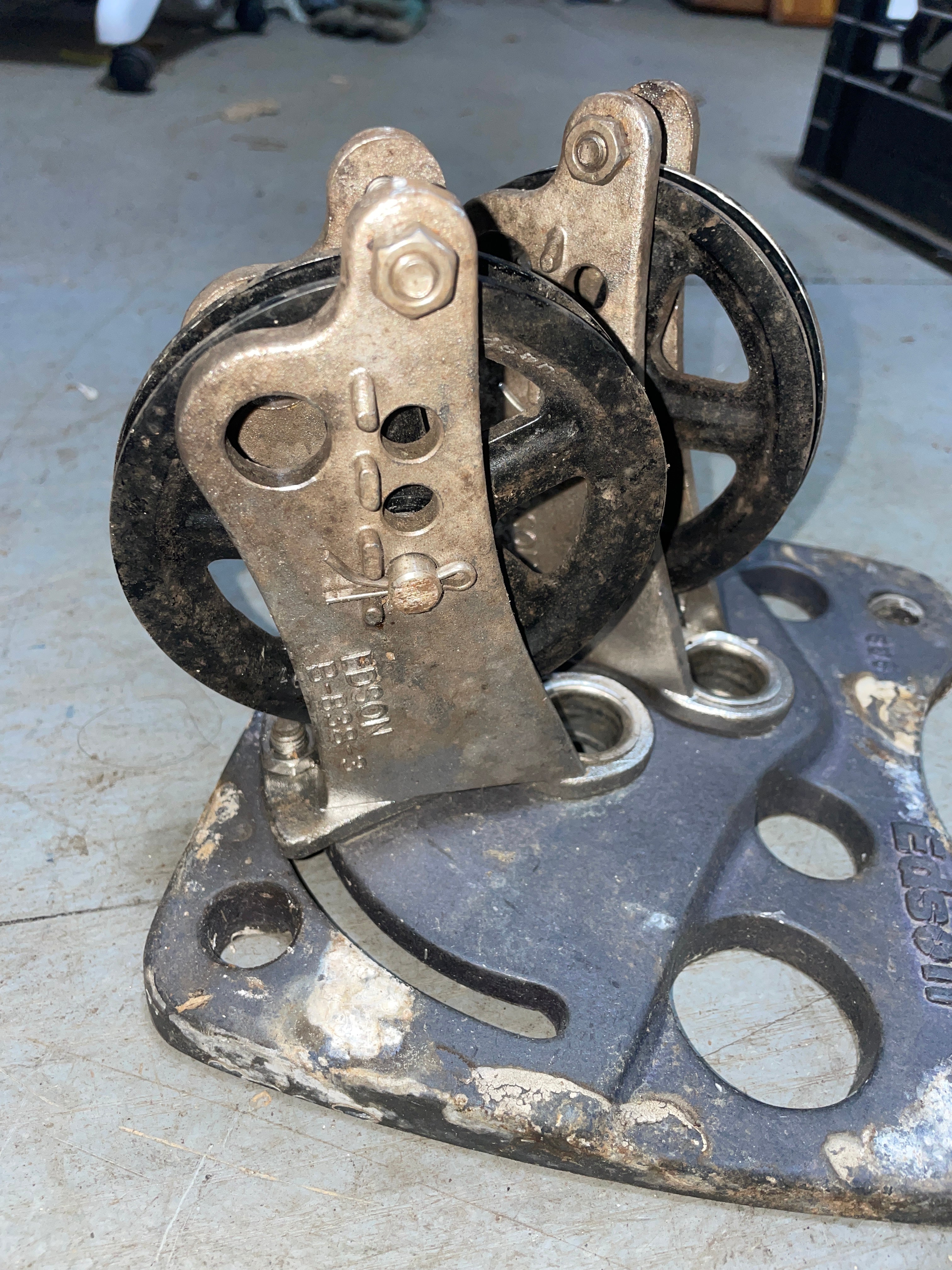 Great condition, this pair of Edson aluminum steering pulley system are 4” diameter and model A-2397. The pulley mounts are Edson B-838-3 and the mounting base is model B-938. The pulleys take MAX 1/4” diameter wire. The base is roughly 8 3/8” long x 7 3/4” wide. This is an all aluminum system so it is very light weight. The pulleys are the adjustable kind. There is a 4 bolt pattern that is ^’ long x 6” wide. Takes a 9/16” bolt.