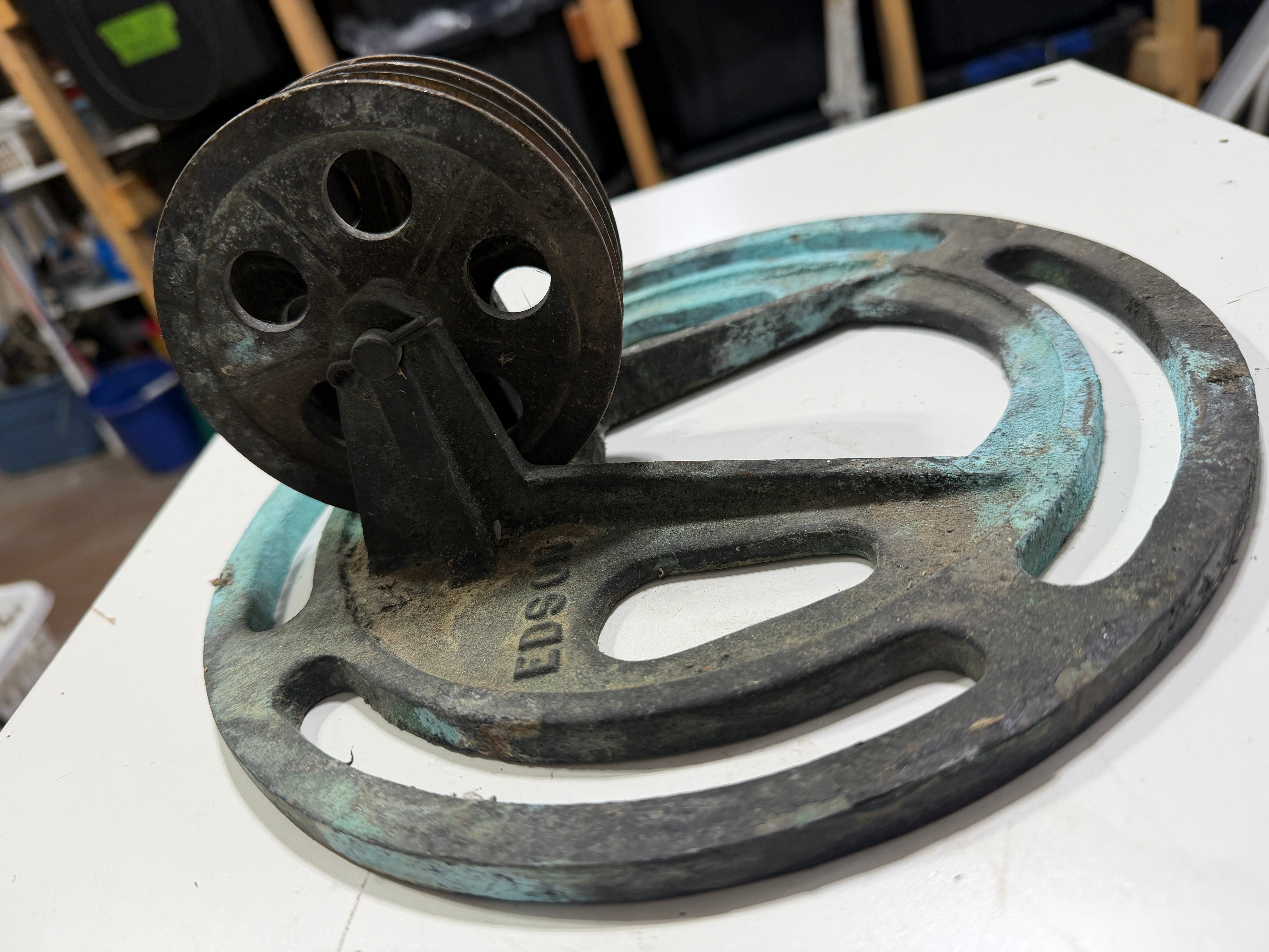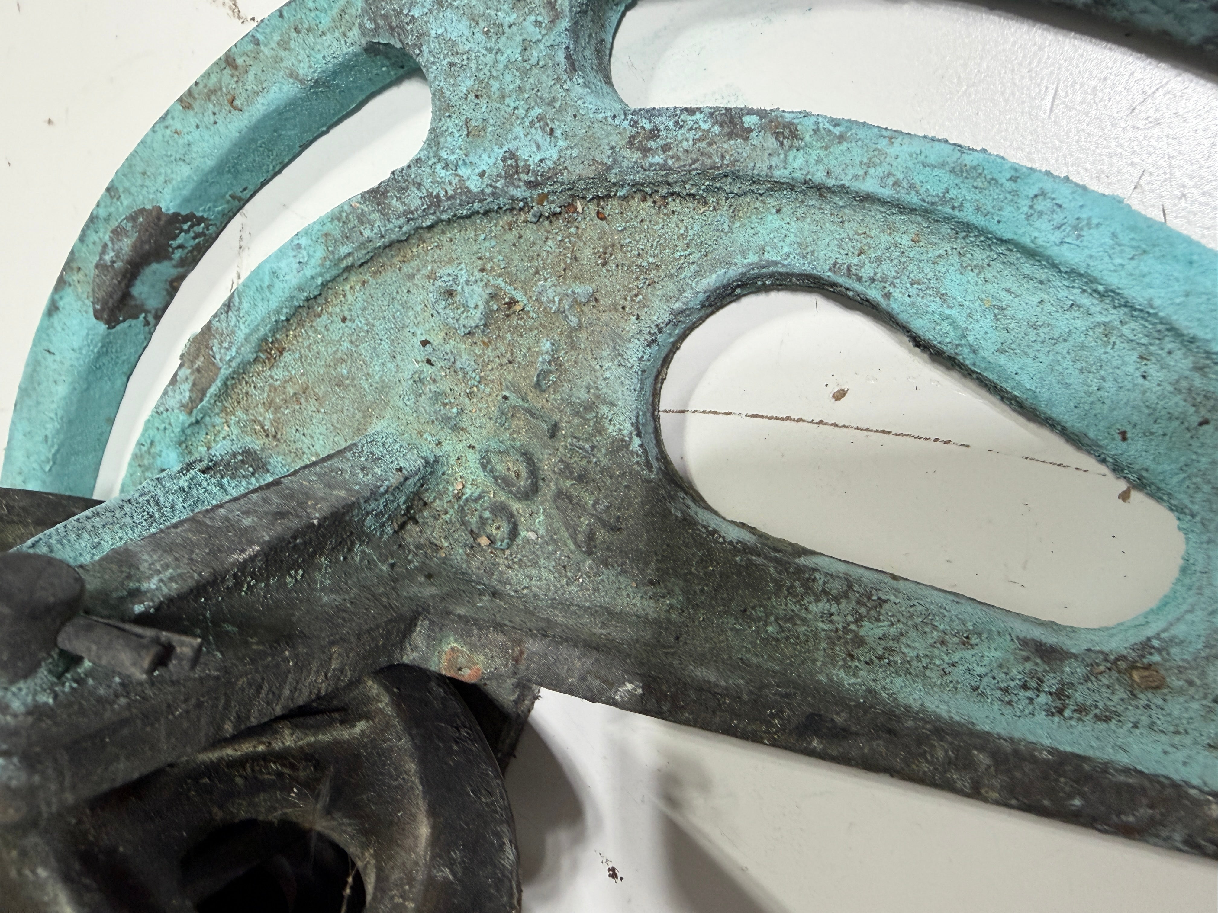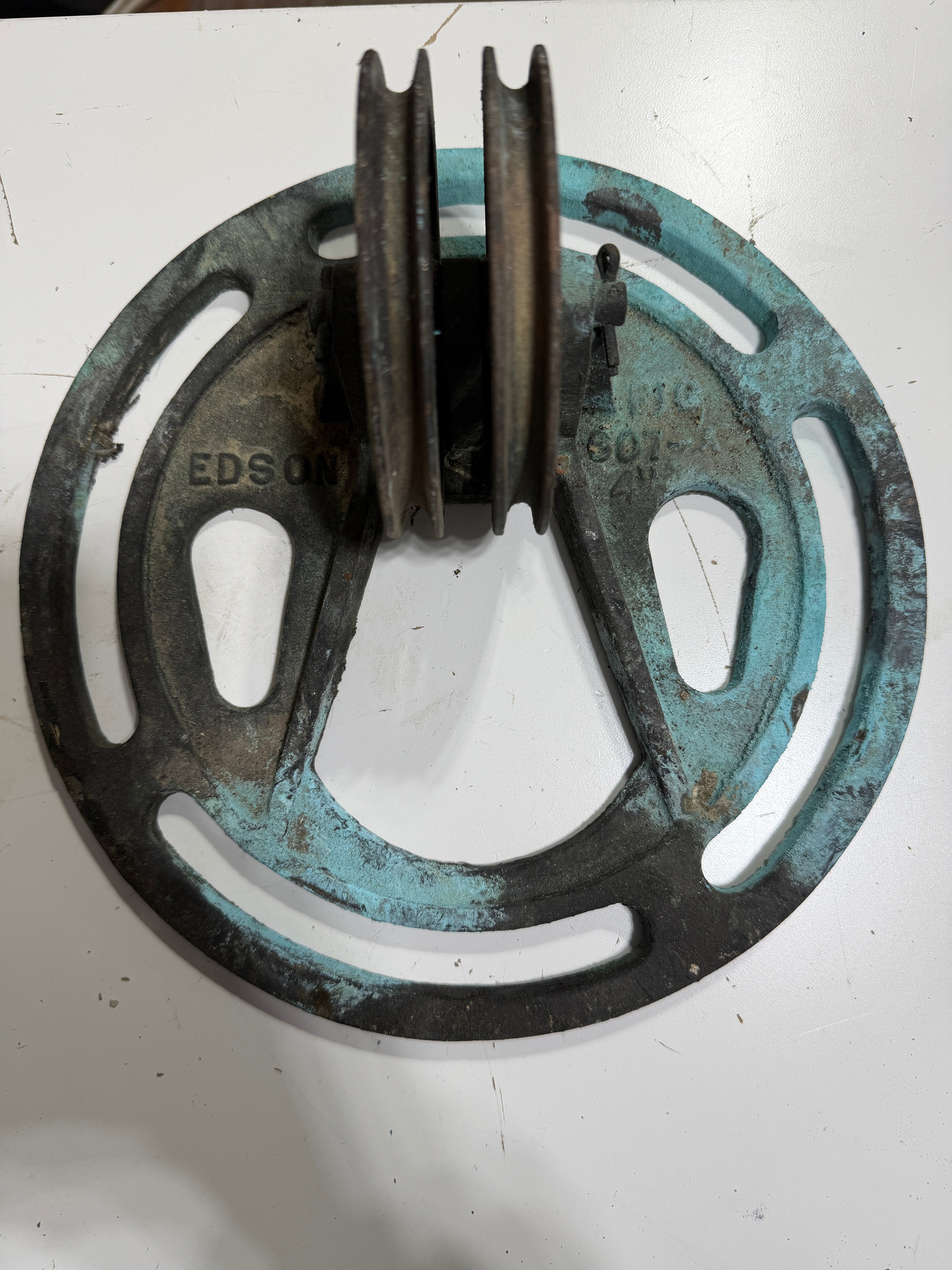This solid bronze idler steering pedestal pulley is in great condition. The pulleys are 4” diameter and can fit up to 1/4” cable. The pulleys have a few little dings in them but doesnt effect its working condition. The base plate is 10 1/4” diameter.