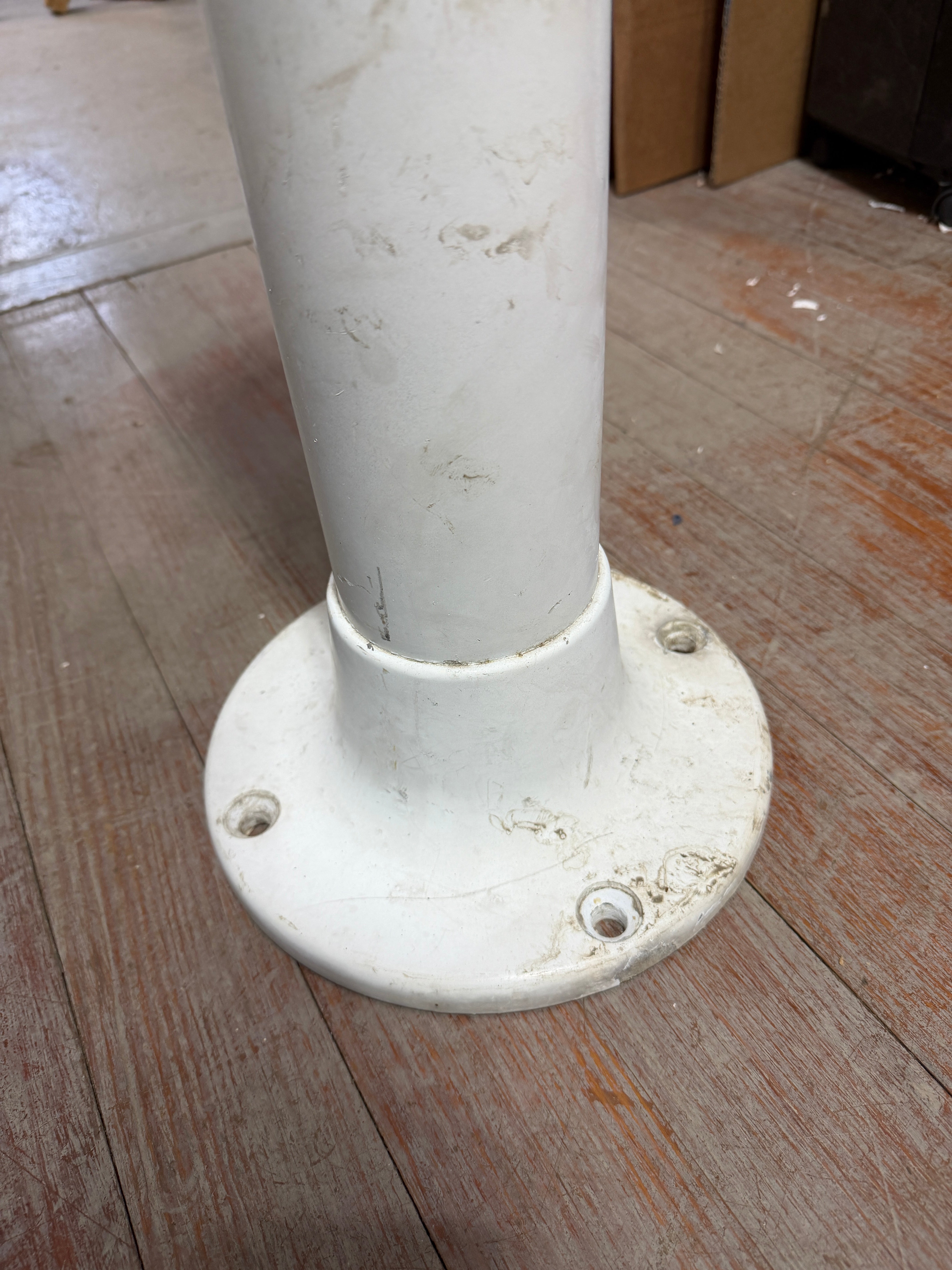 Good condition edson pedestal. This one is 30" tall. The base is 10" diameter and the 4 bolt holes are 6" apart even. The pedestal top is 6 7/8" diameter. The shaft is 1" diameter. Has a few holes in it from previous attachments.