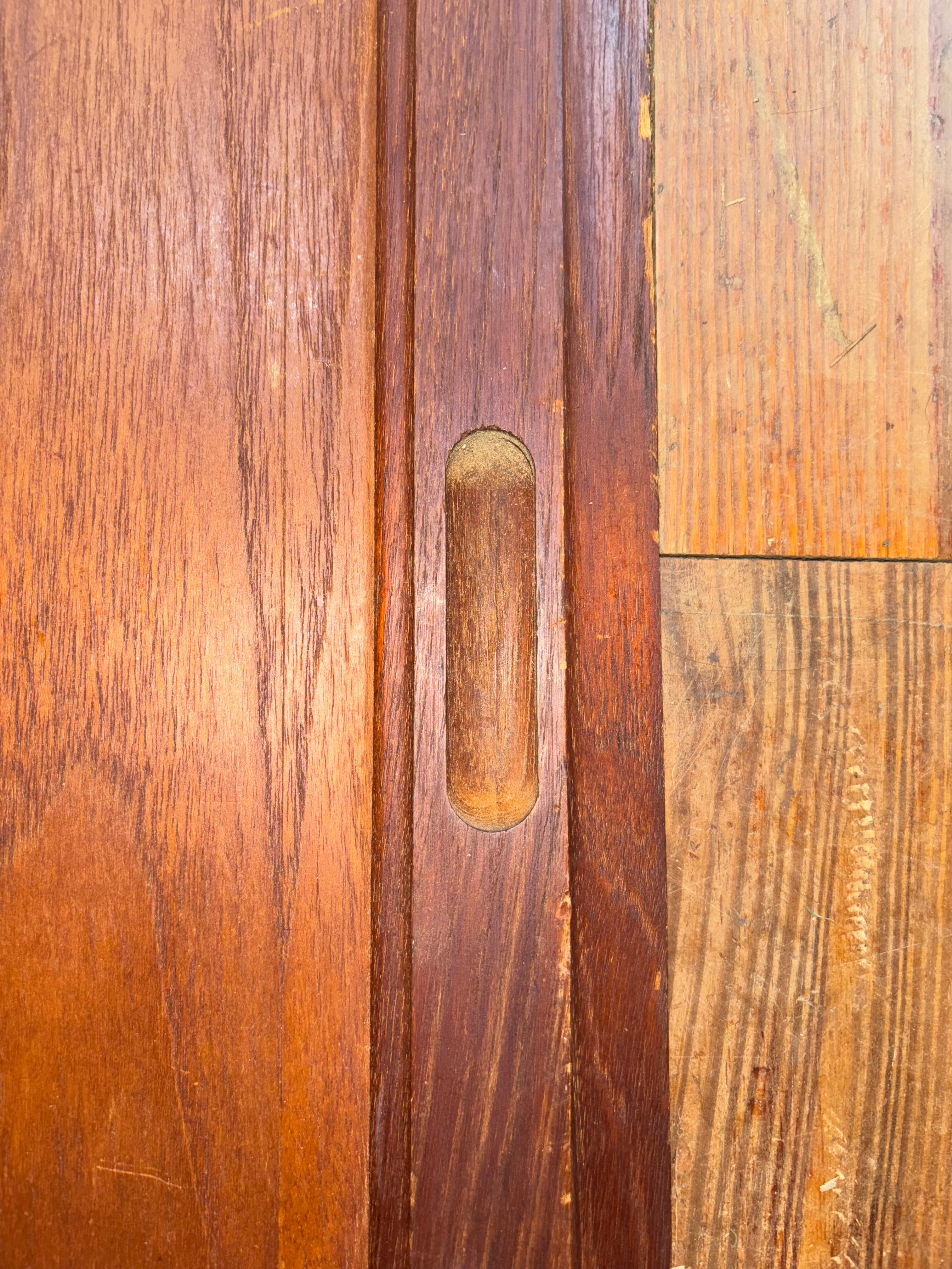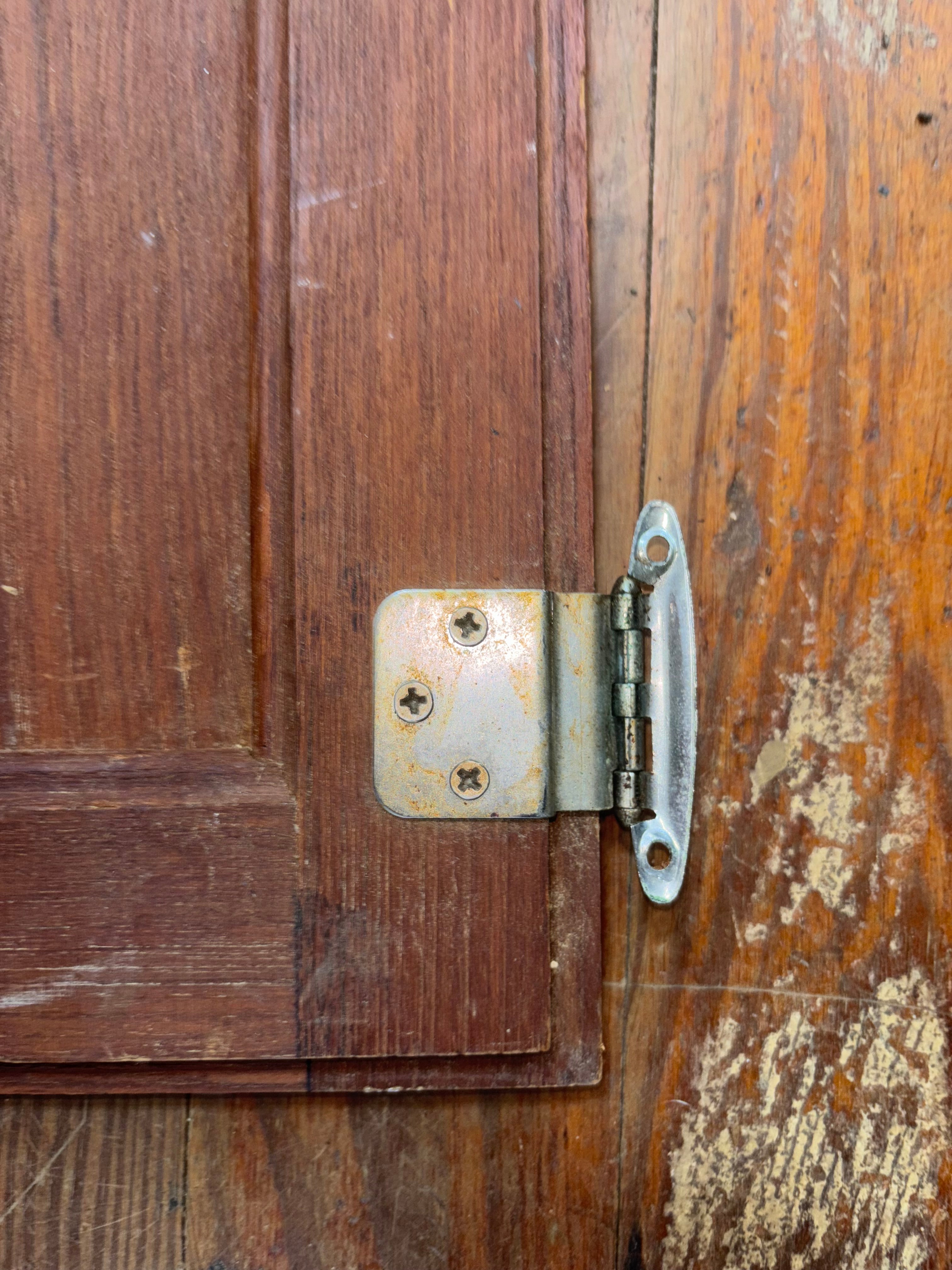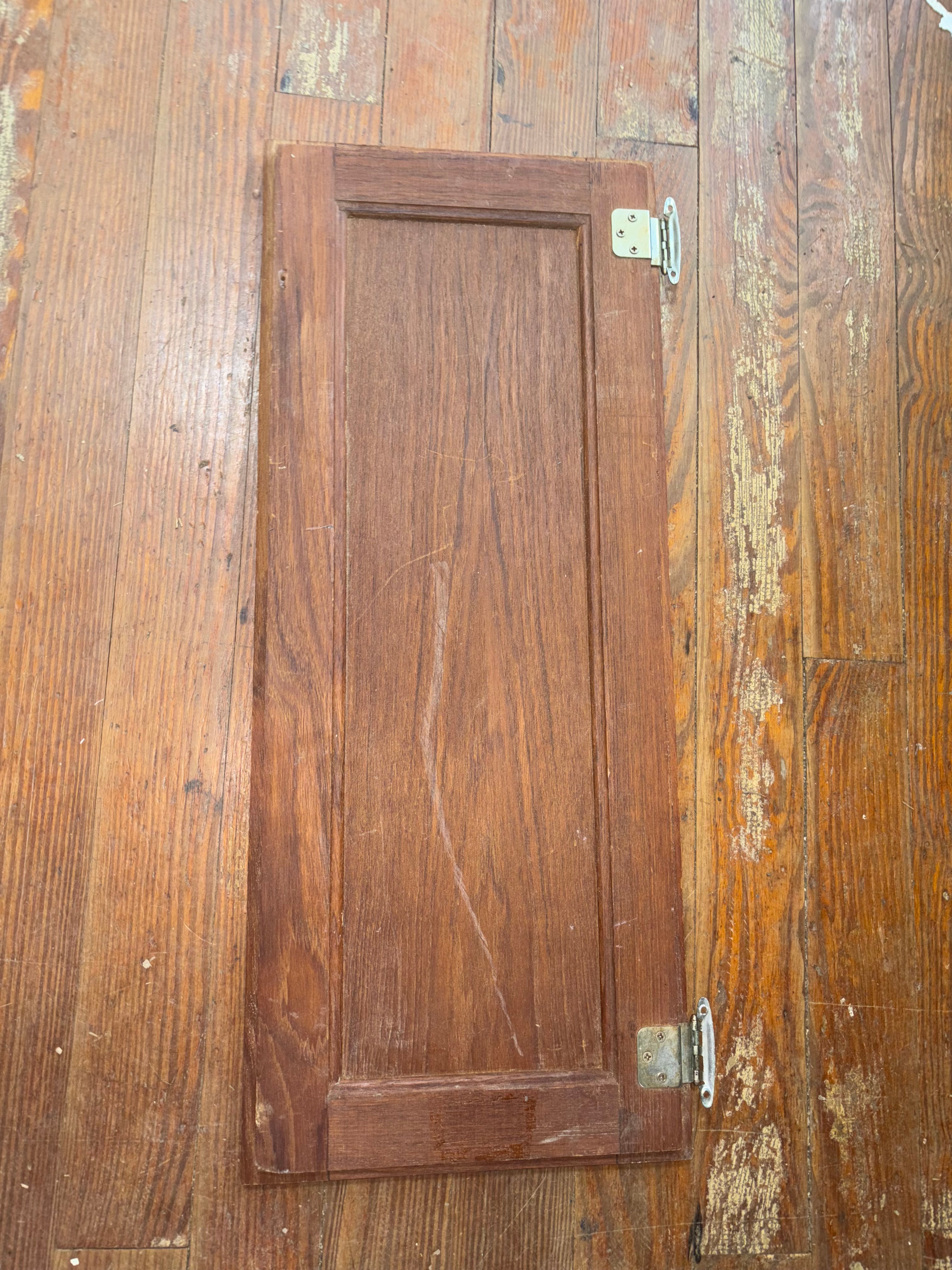 This interior cabinet door was removed off an Ericson 29 sailboat. It is overall good condition, although the hinges are stiff moving. Has usual scratching. The inside diameter of the door is 27 3/4" long x 11 1/8" wide. The outside diameter of the door is 28 1/2" long x 11 1/5" wide.