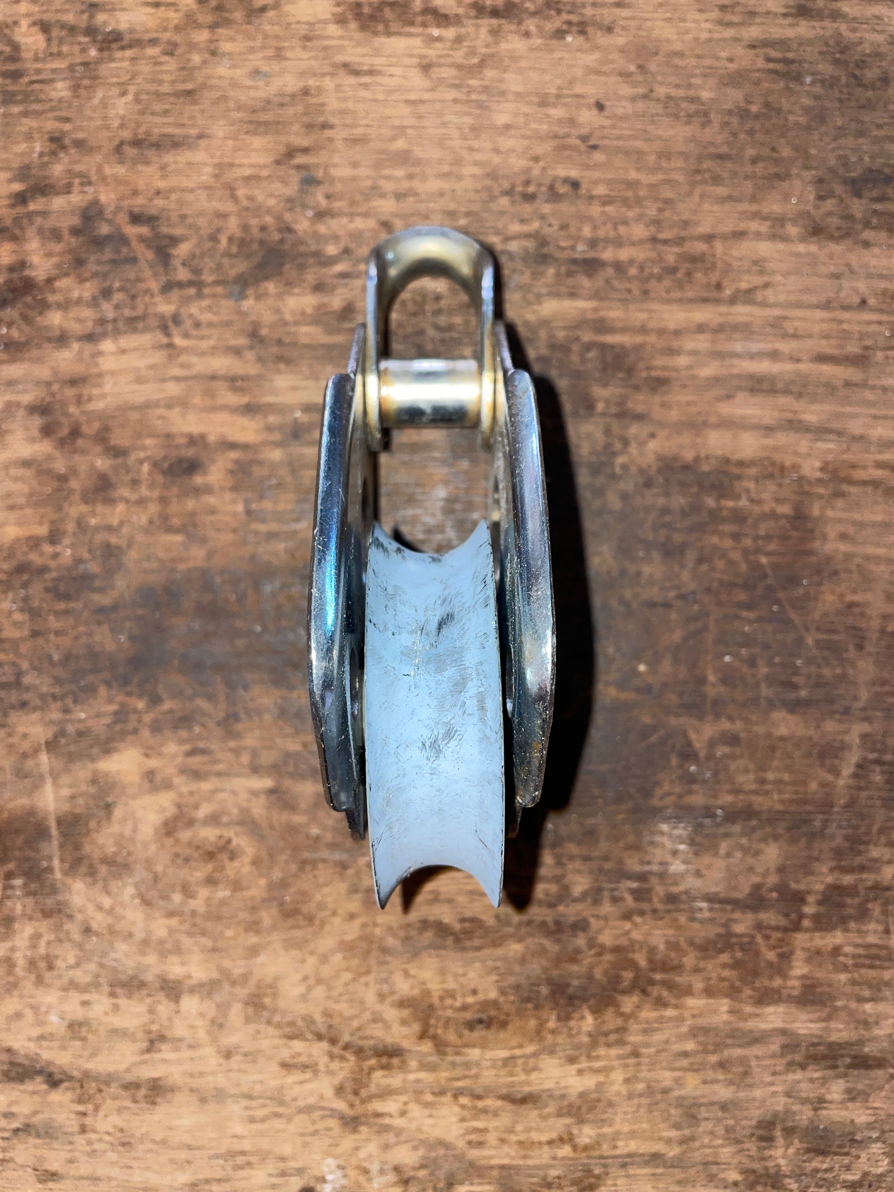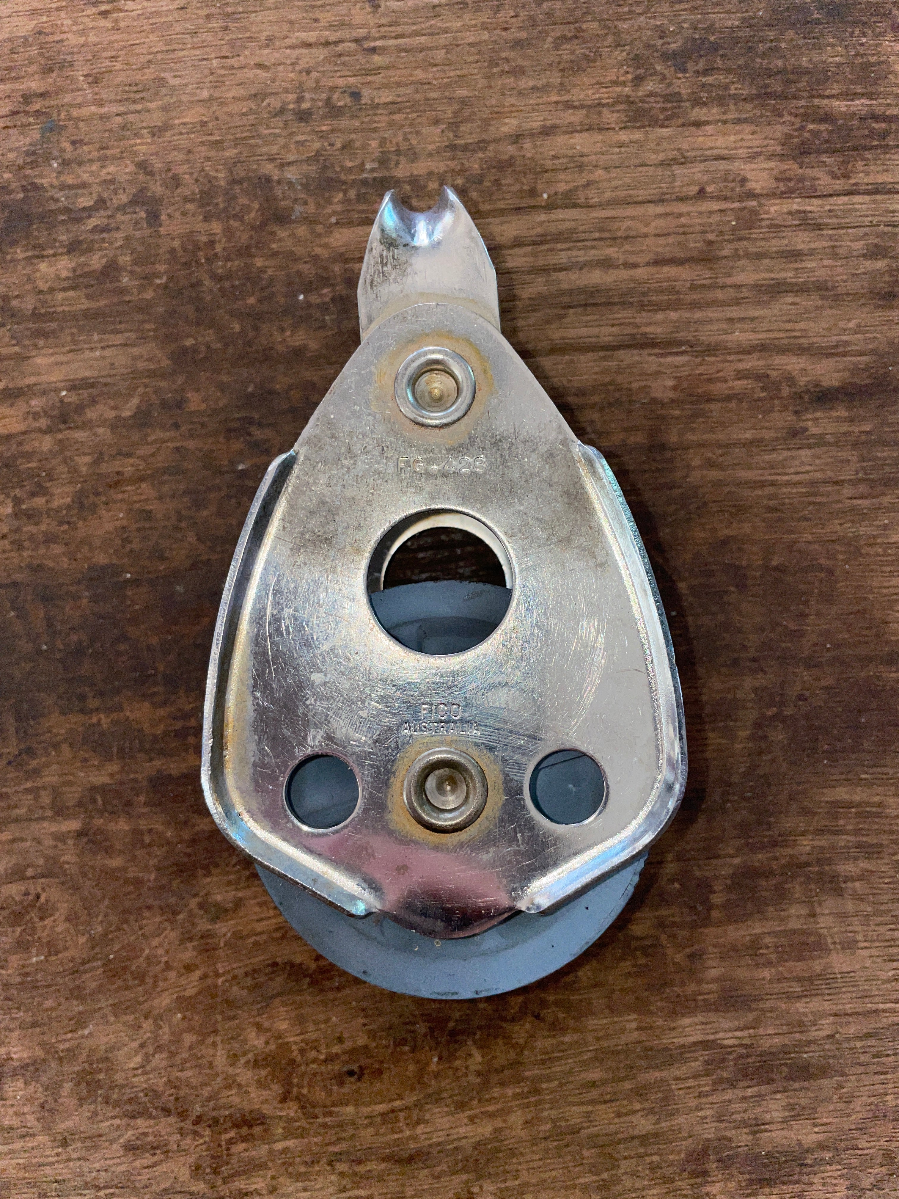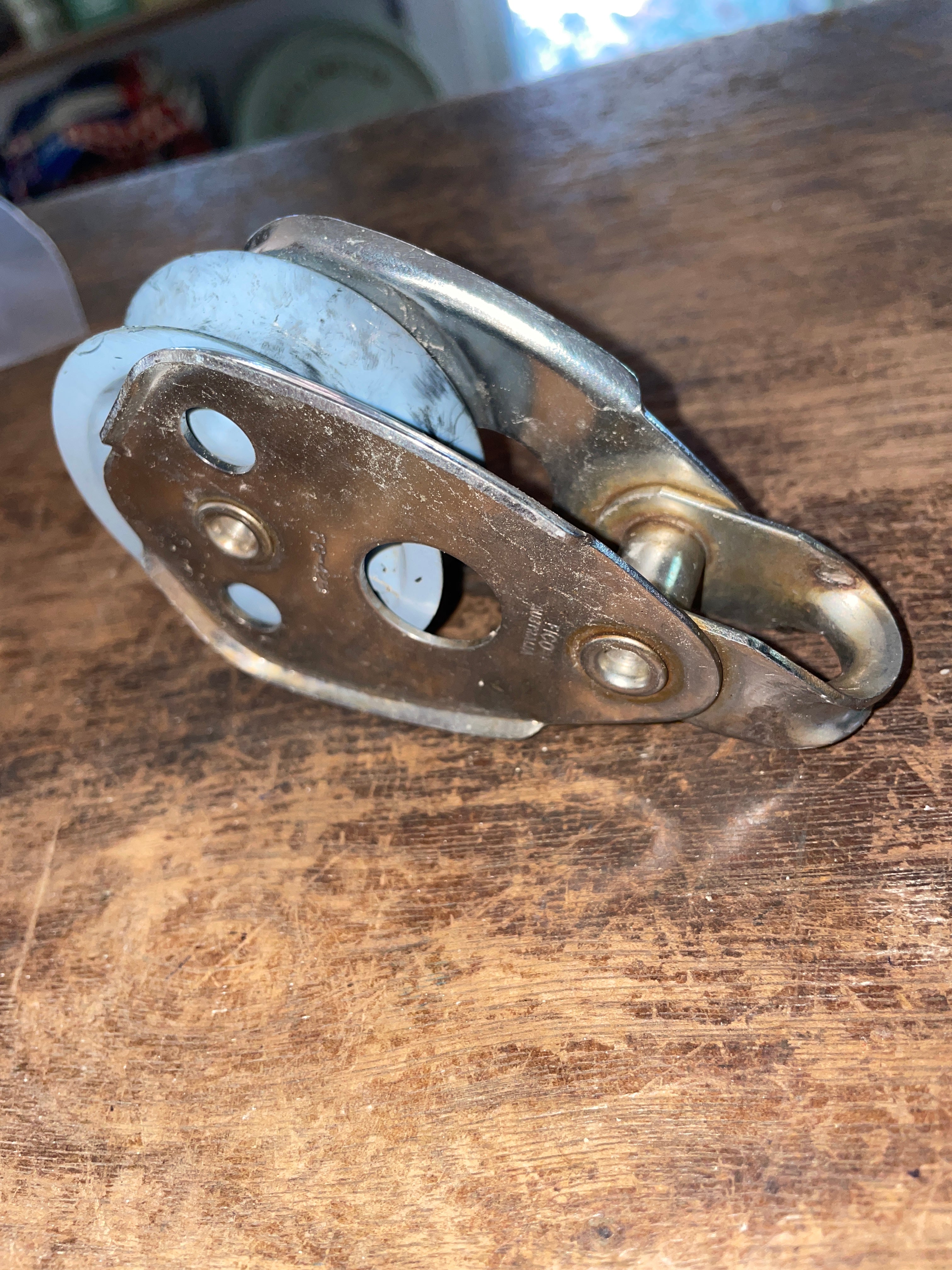 This Fico single block is in fair condition. The sheave is 2 1/4” and can fit up to 5/8” line diameter. It is a fixed block. Has obvious signs of wear from use. Total length of block is 4 1/2” long.