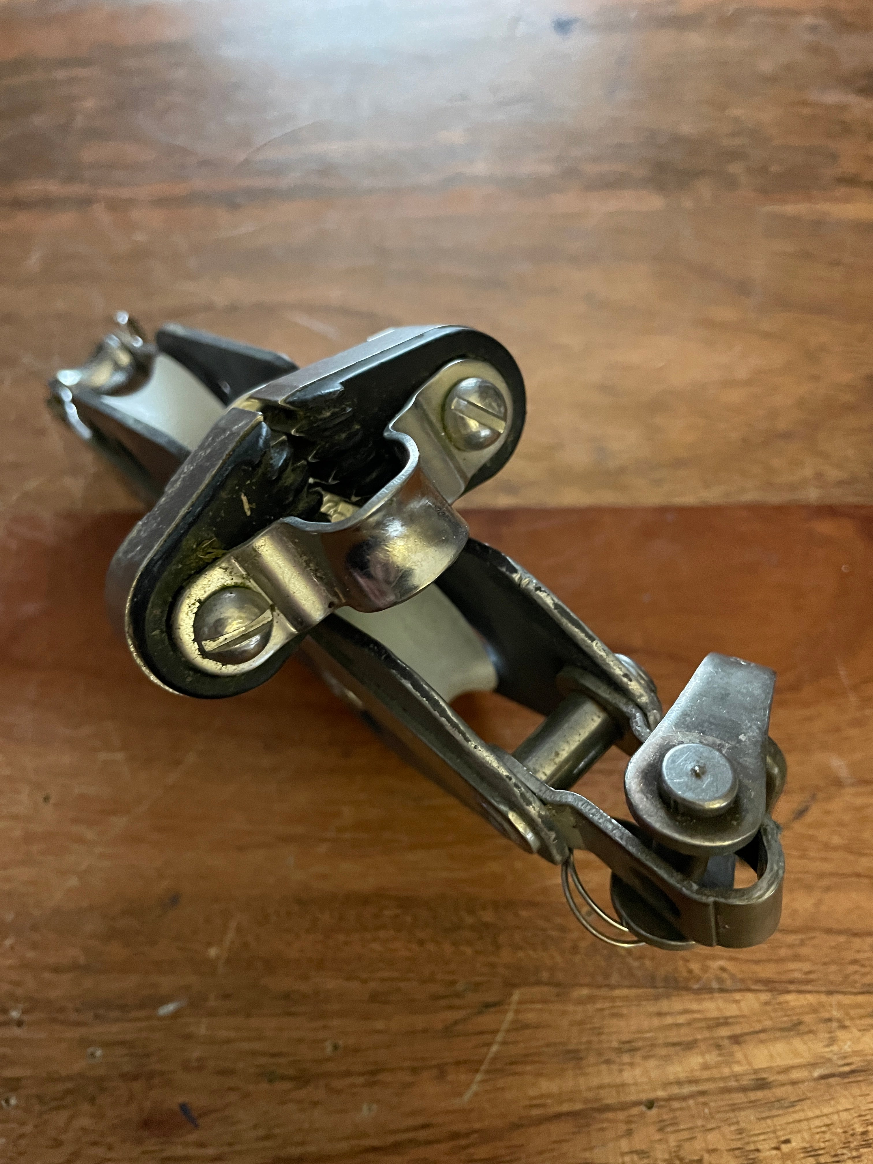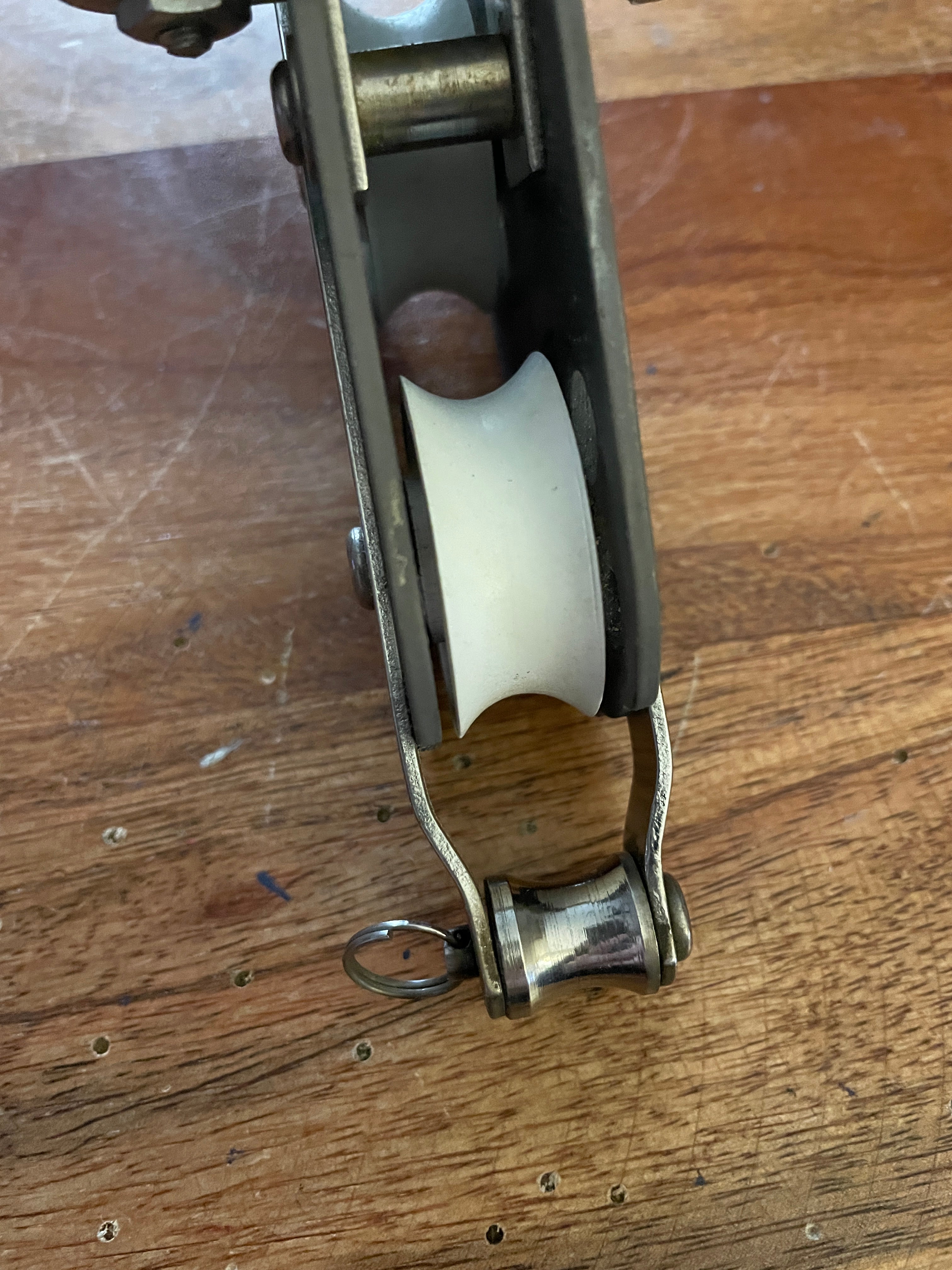 This fixed Schaefer fiddle block is in great condition. The blocks 2 sheaves are both 1 1/2” diameter and they fit MAX 3/8” line diameter. The Beckett at the base is stainless and rolls smoothly. The cam cleat works as should. Included are 2 smaller shackles. Total length of this block is 6 1/4”.