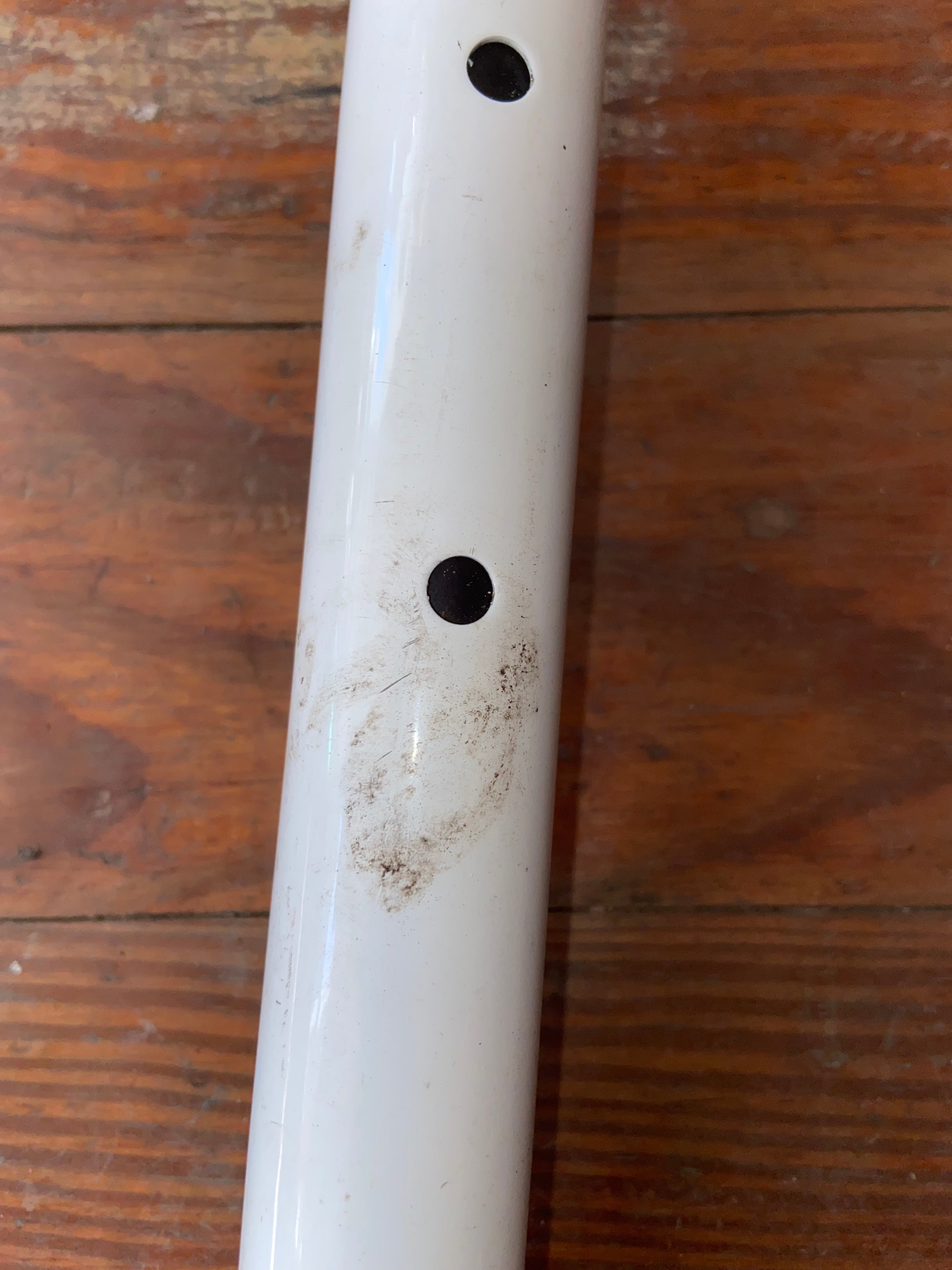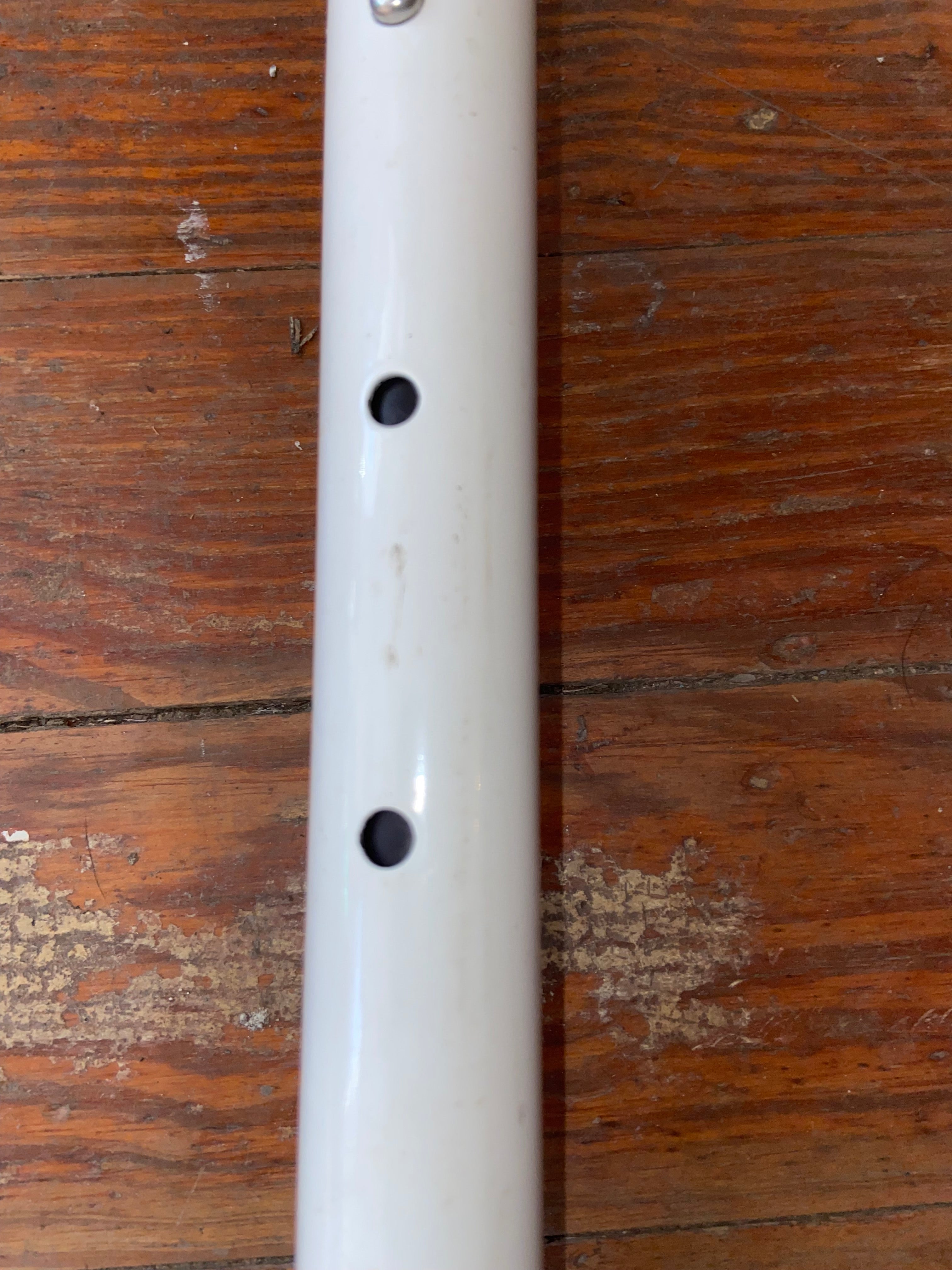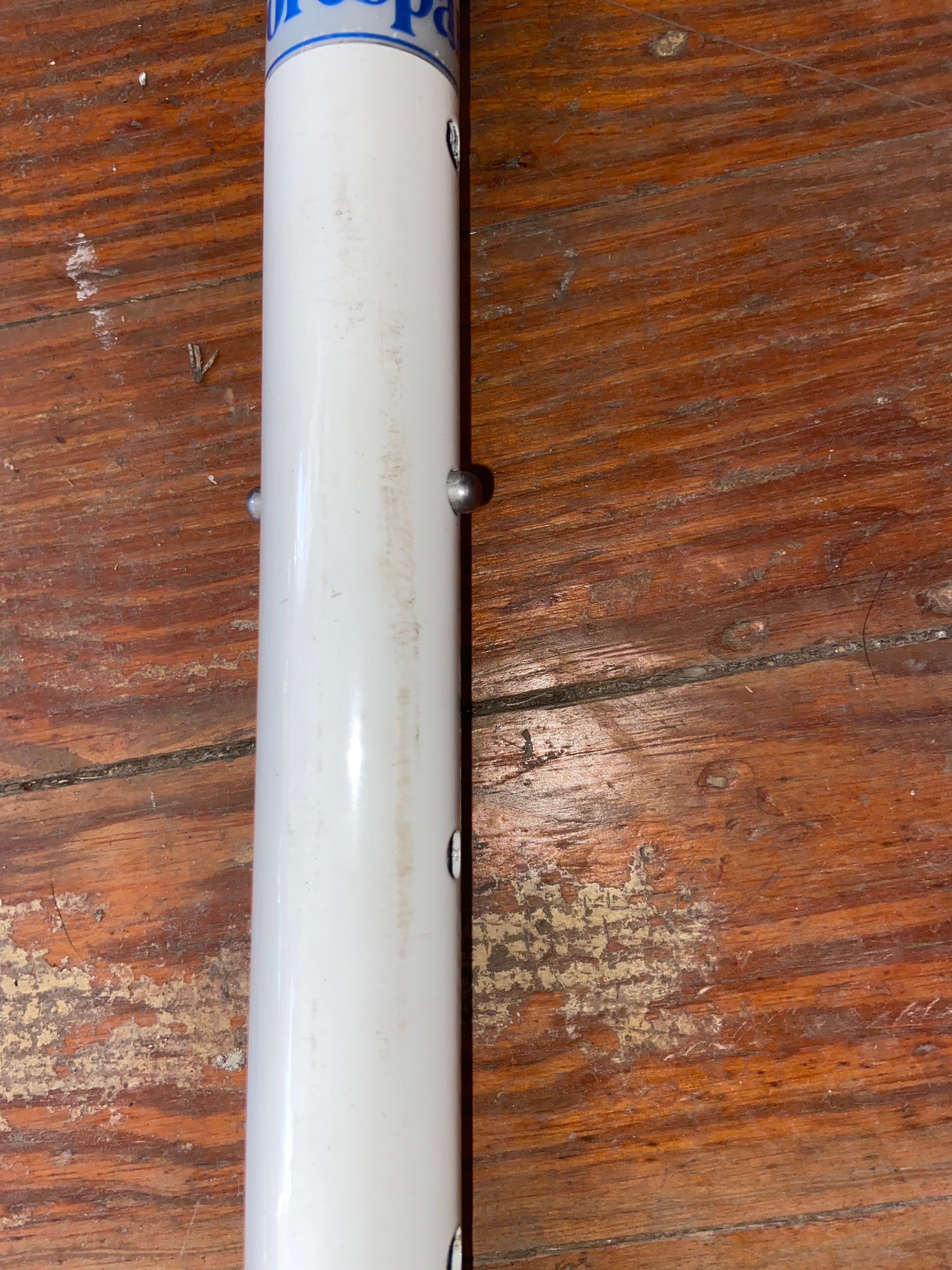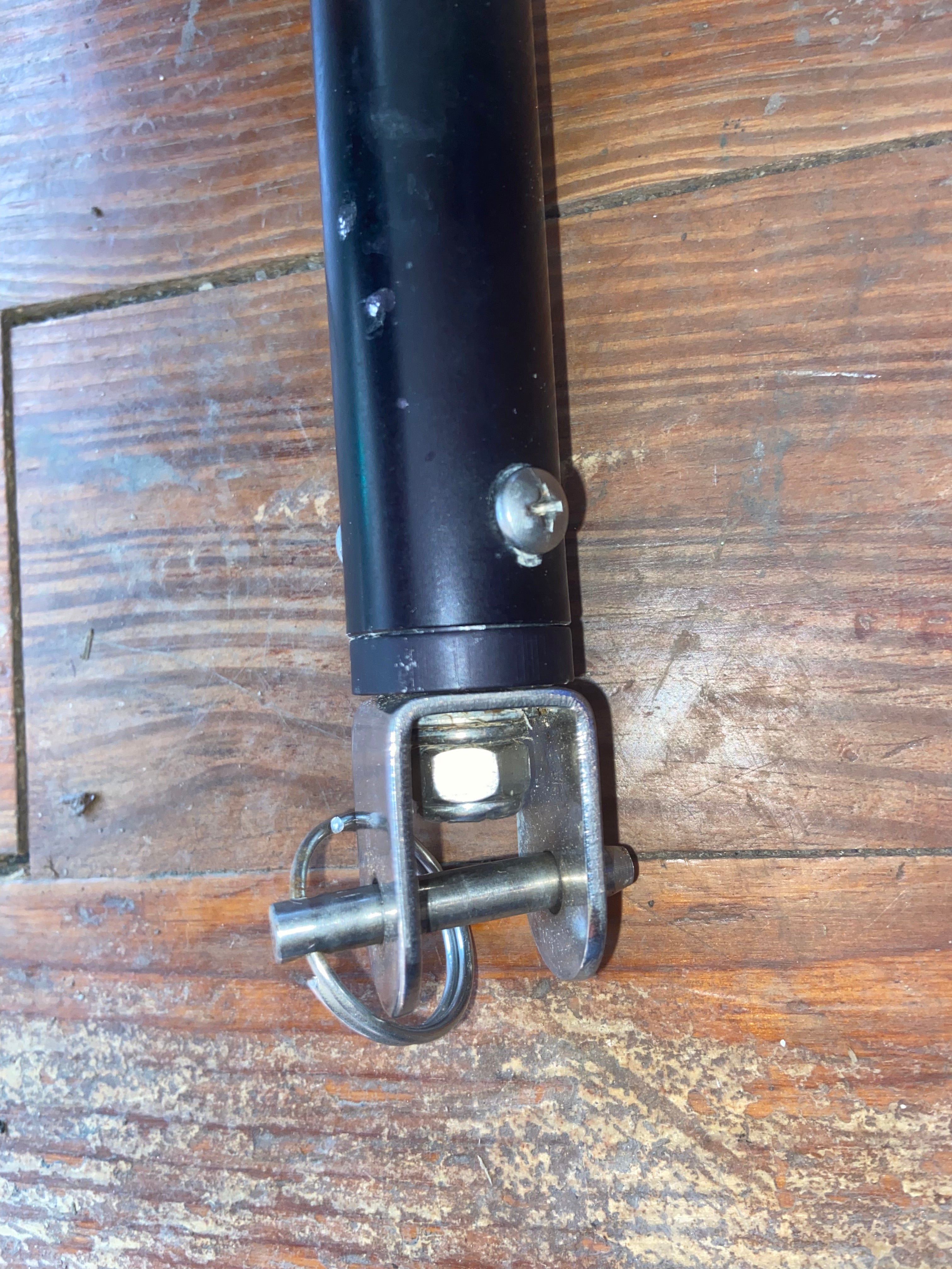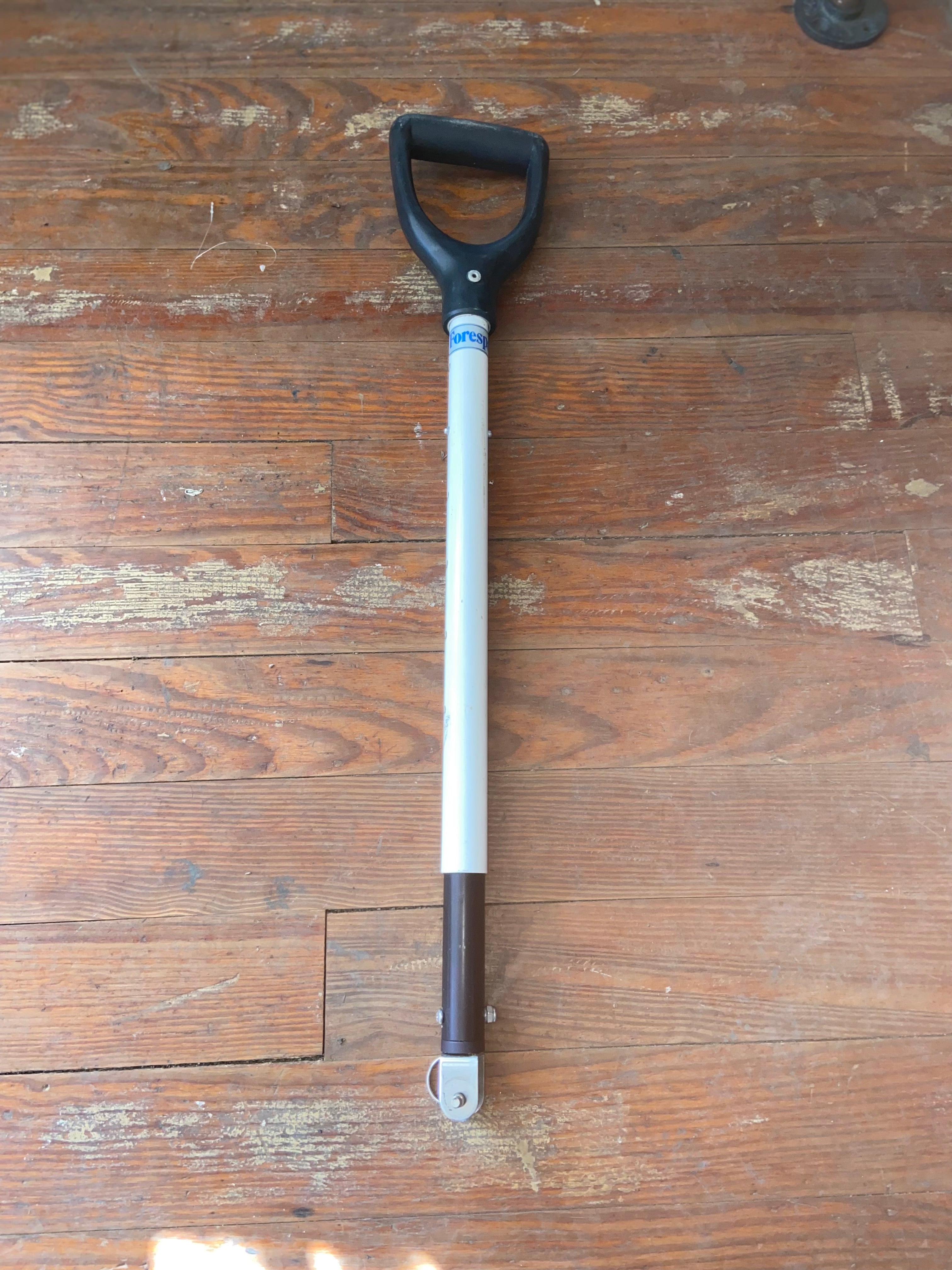 This forespar adjustable tiller handle is in good condition. The bottom with the pin has a 11/16” width. Fully extended it is 3’ long. When not extended it is 26’ long. Does have some scuffs but thing crazy would probably clean up nicely.