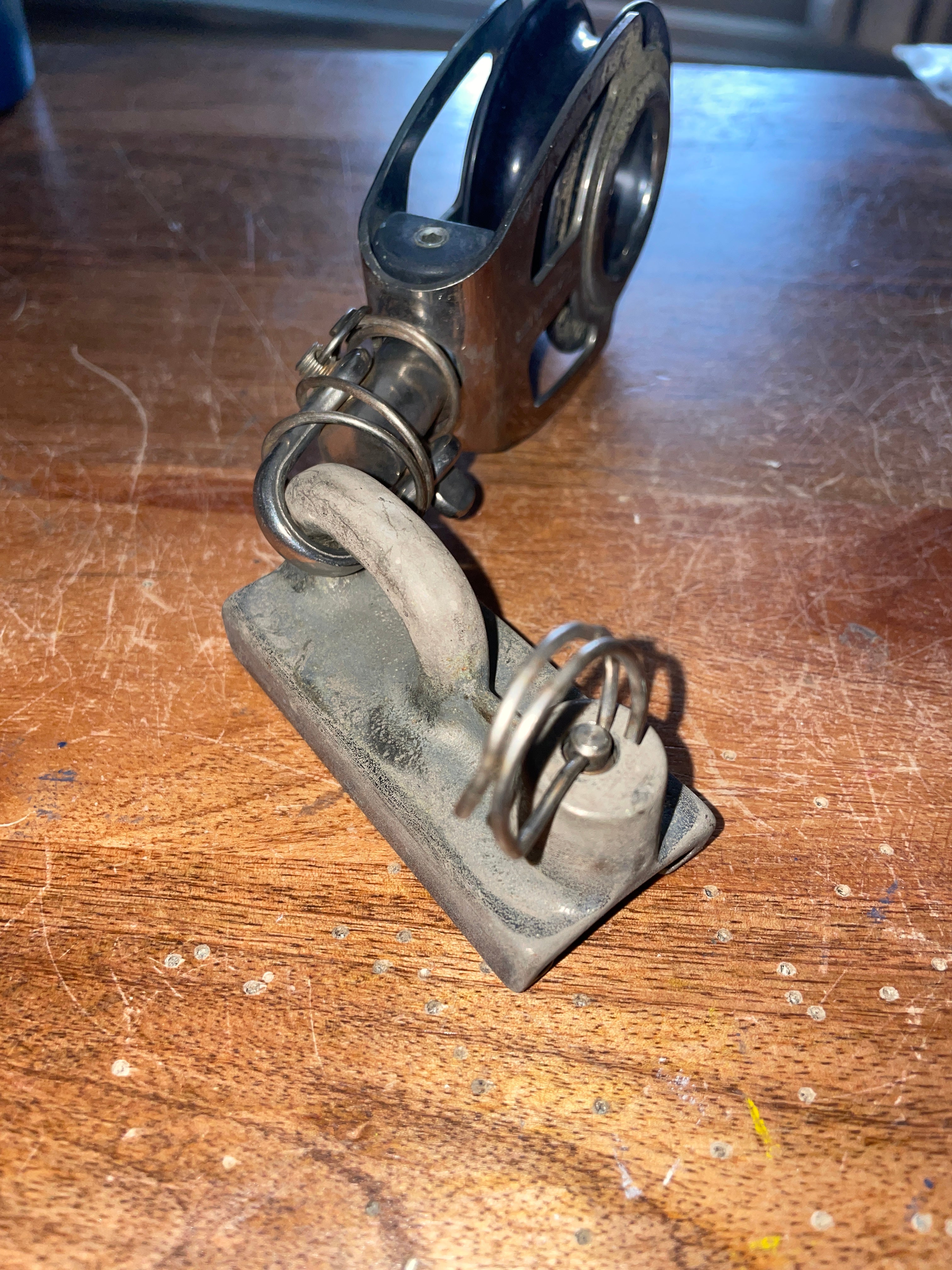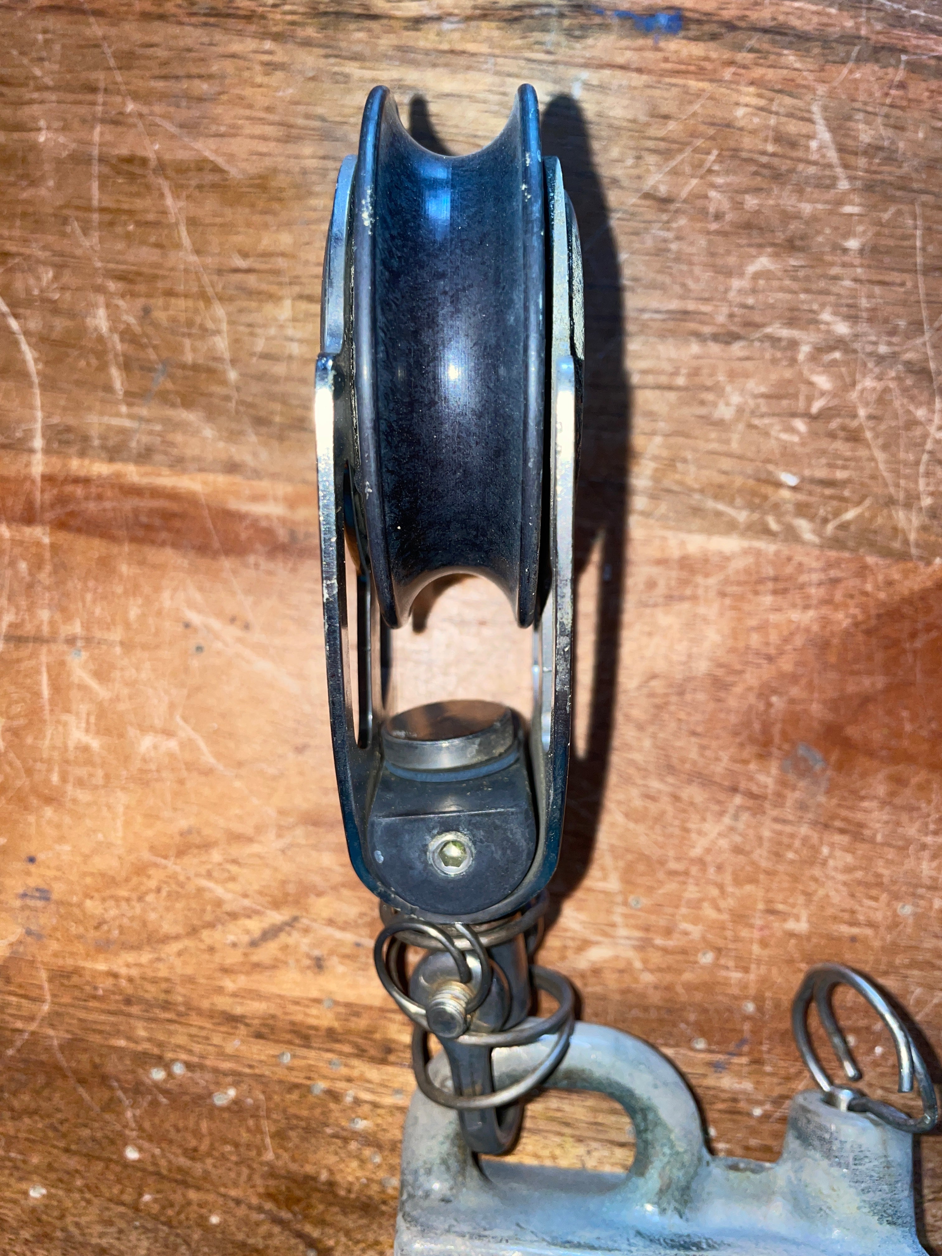 This garhauer single sheave block is in good condition. The block has a 2 5/8” sheave and can fit MAX 1/2” line diameter. The block itself is 5 3/4” total length. Comes on a bronze track car that fits a 1” track. Sits lose on the car (moves all around).