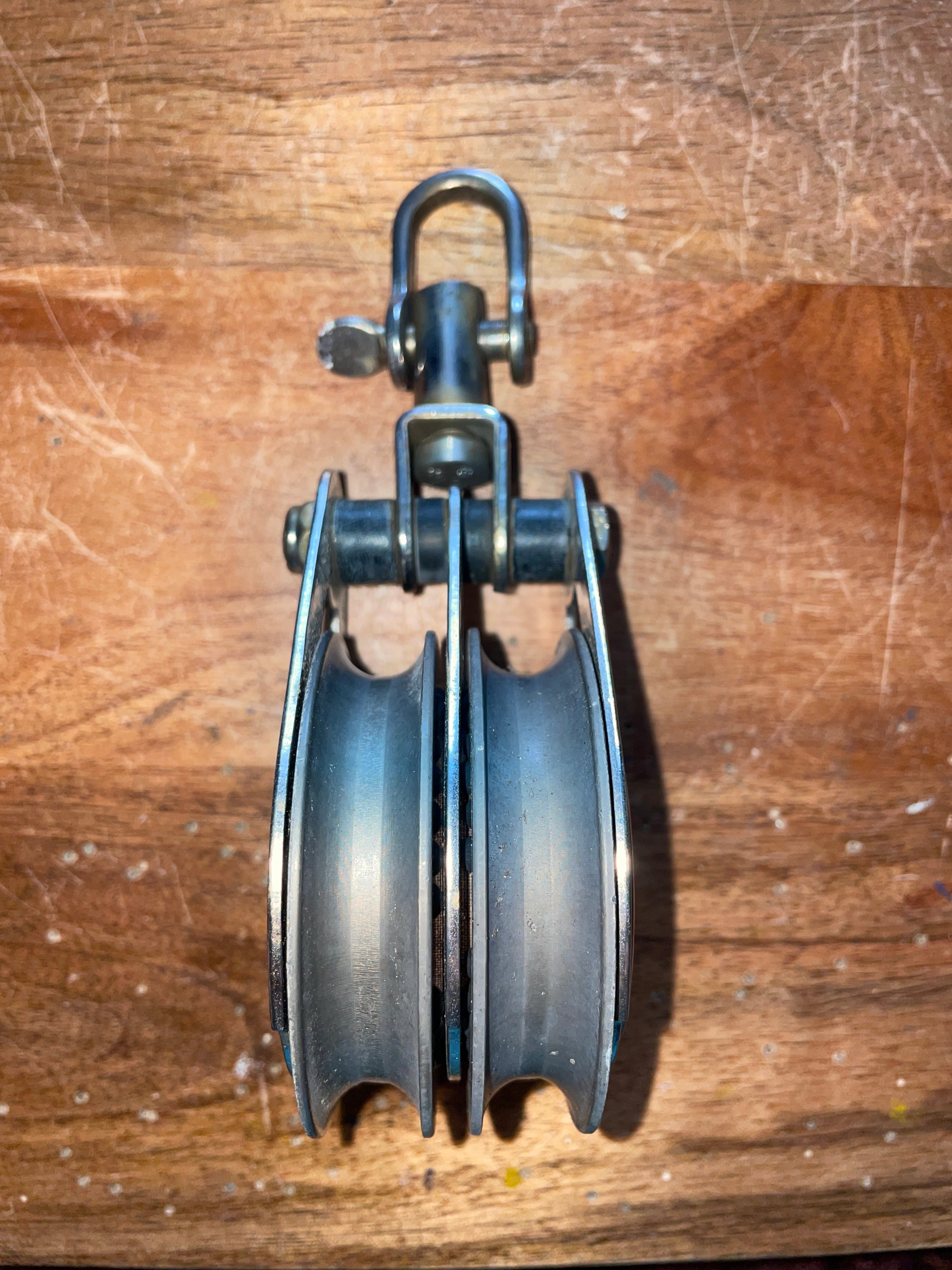 This garhauer double block is in great condition. It is a swivel block with attached shackle. The shackle has a 5/8” width. The block has 2 sheaves, each are 2 5/8” diameter. They fit MAX 7/16” line diameter. Width across both the sheaves is 1 5/8”. This block is 5 3/4” total length (including the shackle).