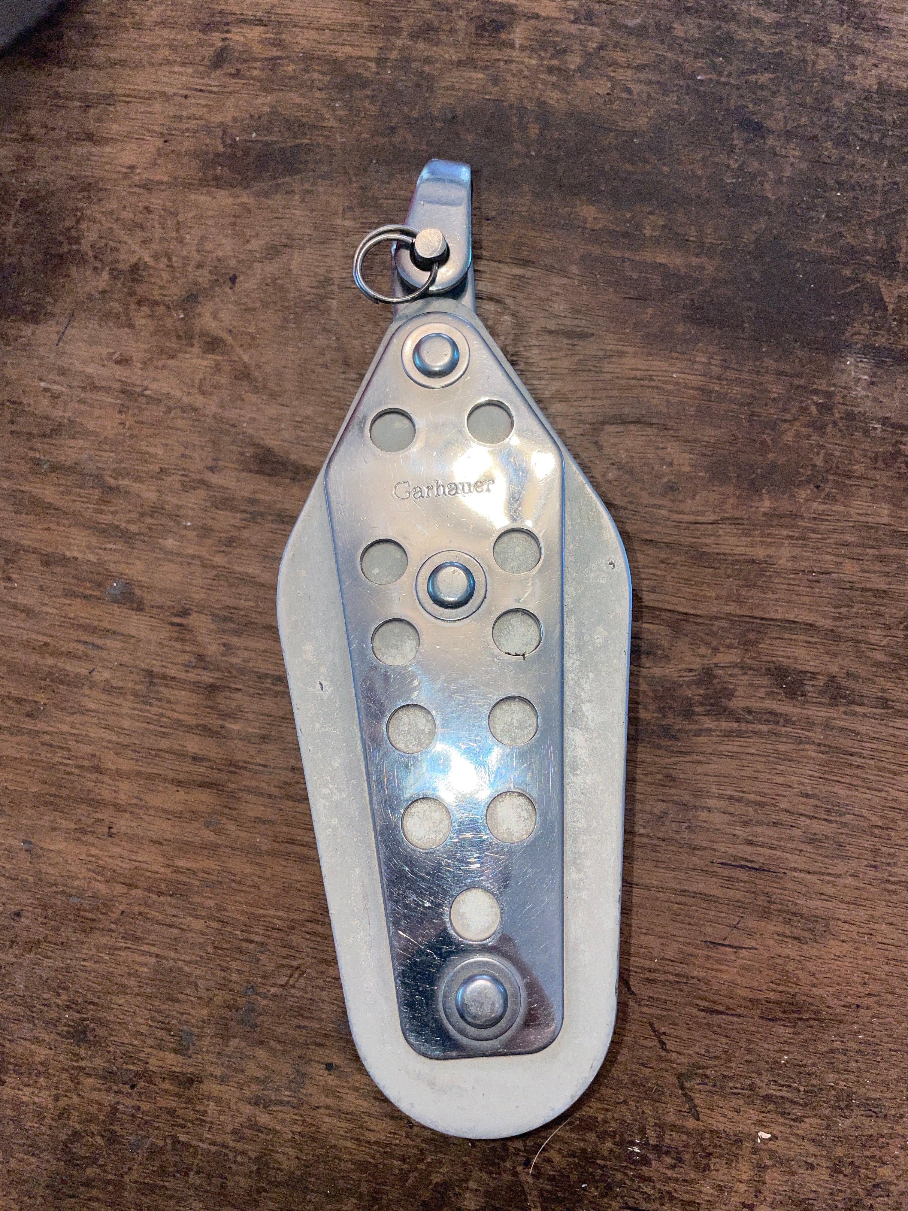 This garhauer fixed block is in great condition. The top sheave is 2 1/2” Sheave and the bottom sheave is 1 1/4”. They fit 7/16” Line diameter. Comes with shackle that has a 3/4” width. Total length of block is 7”.