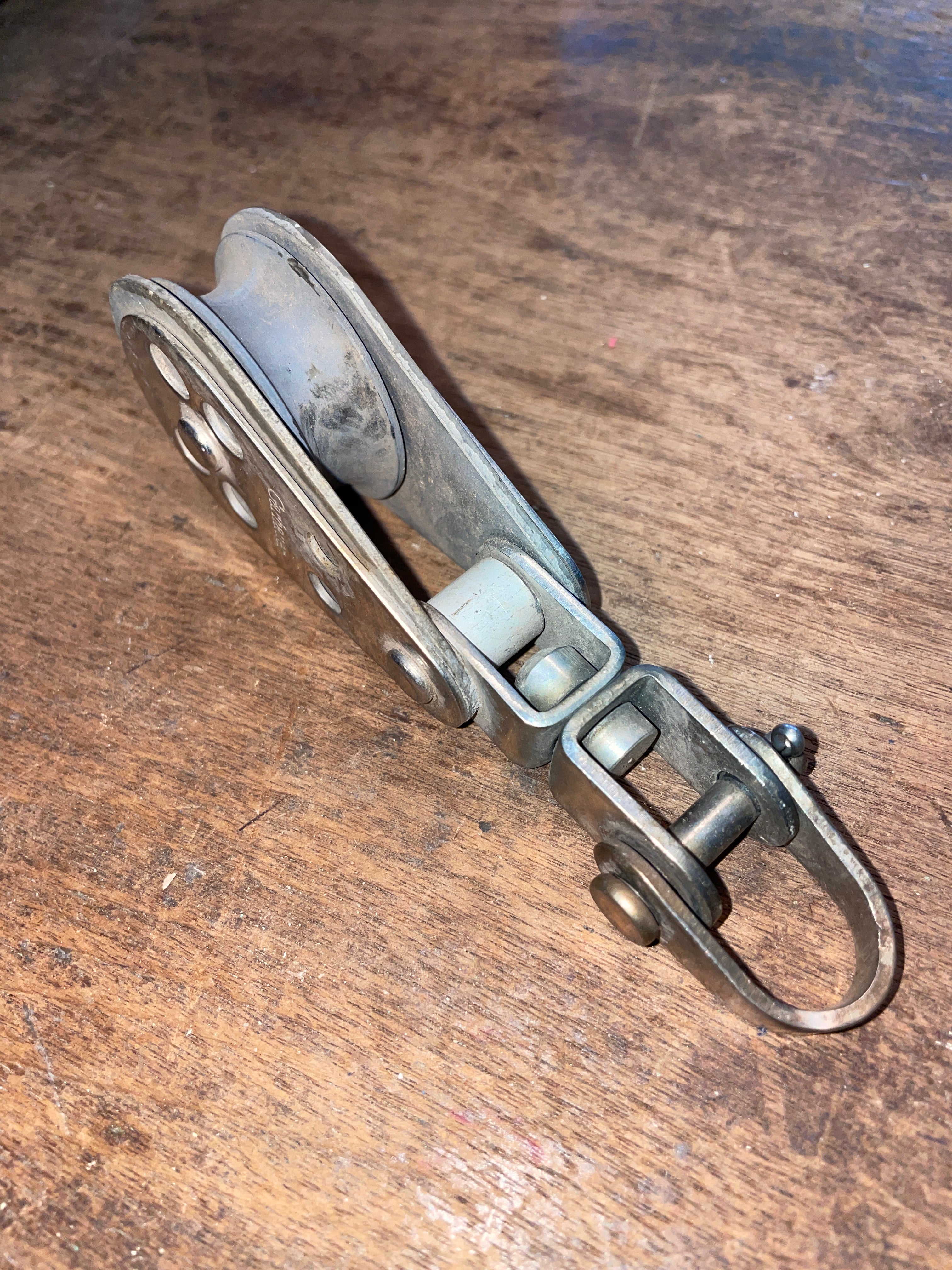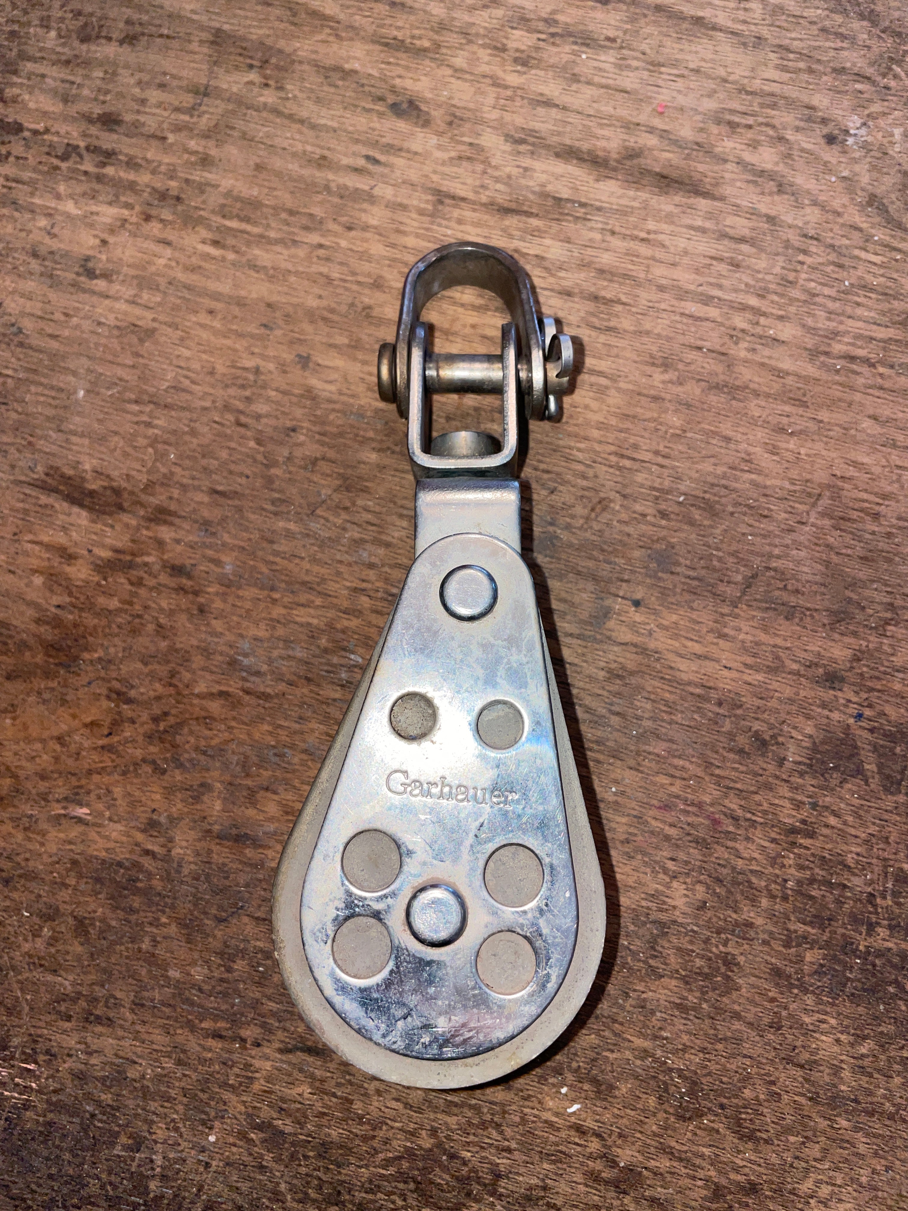 This garhauer single swivel block is in good condition. The sheave is 1 7/8” and can fit up to 7/16” line diameter. Comes with a ss shackle that has a 11/16” diameter. Block including shackle measures 5 1/8” long. Has usual surface scratches.