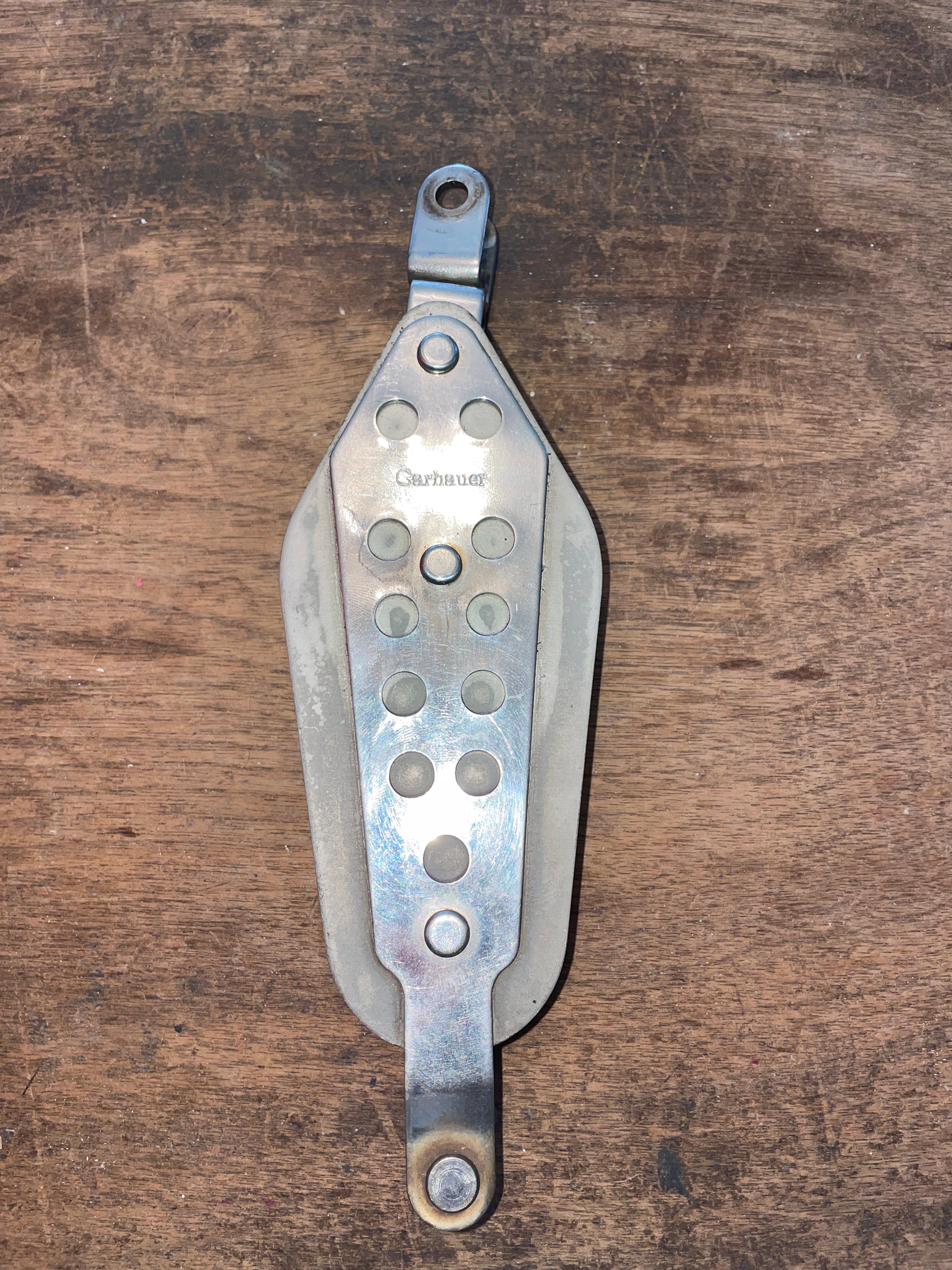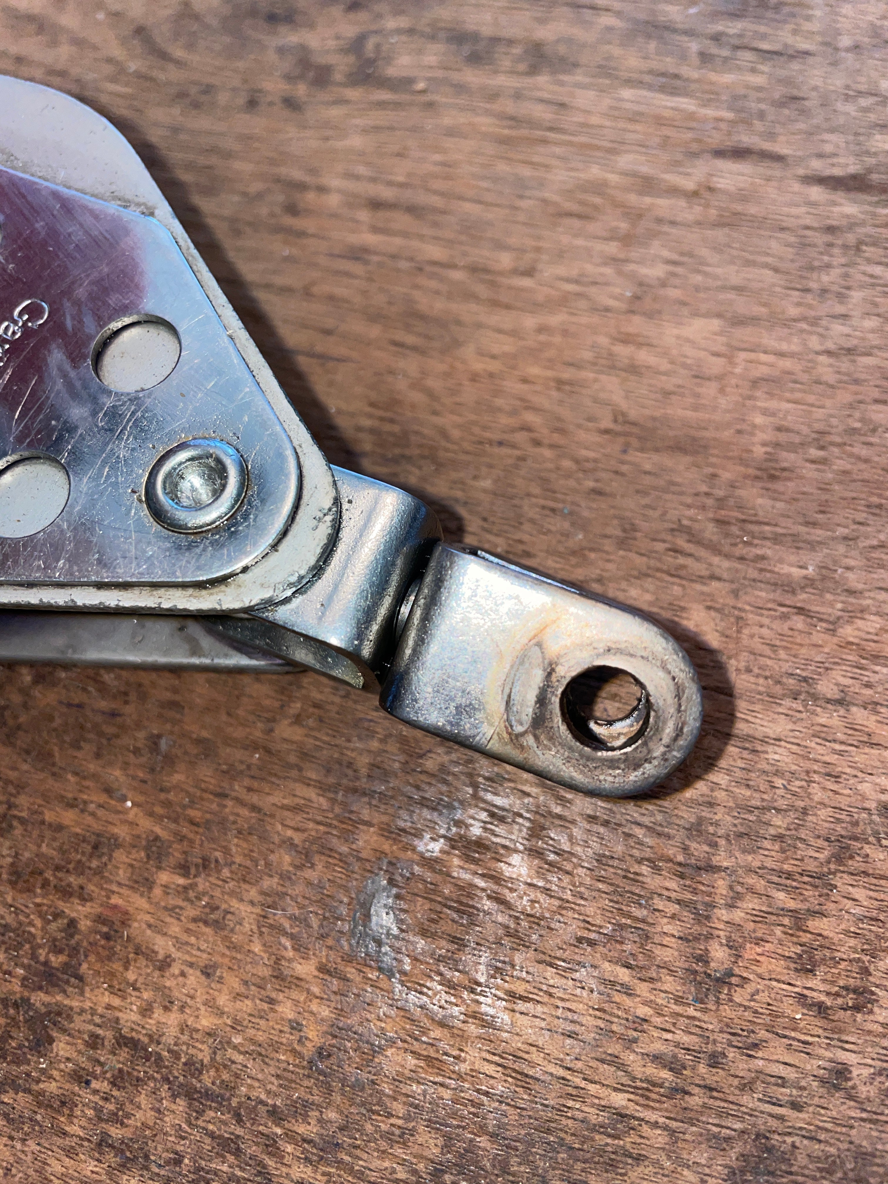 This garhauer swivel fiddle block is in good condition. Largest sheave is 2 1/2” and the smaller is 1 3/4’. Can fit up to 7/16” line diameter. The larger sheave looks like it has a few scuffs but still solid working condition. Measures 8 1/8’ long. Beckett at the bottom is slightly bent would easily bend back.
