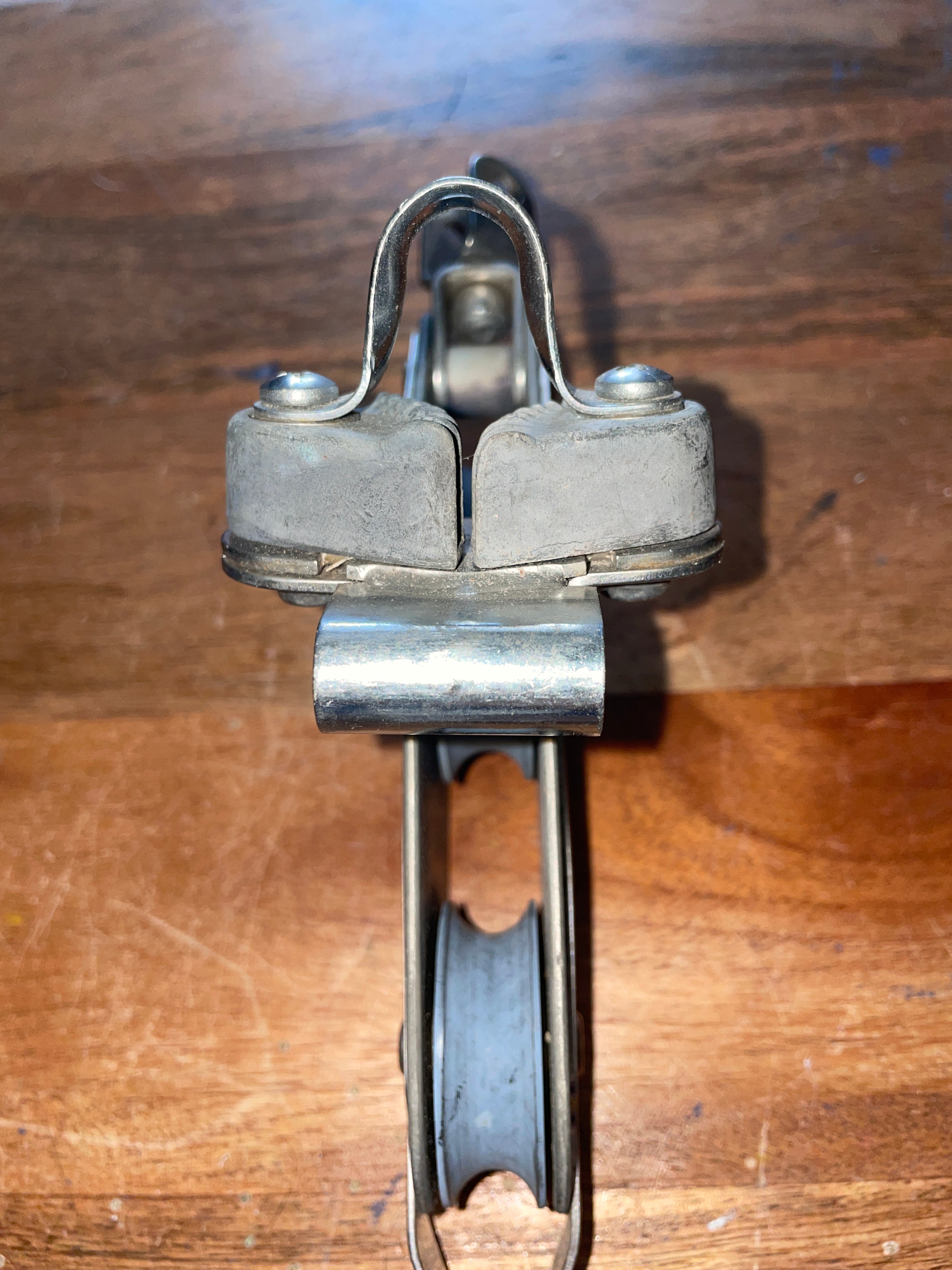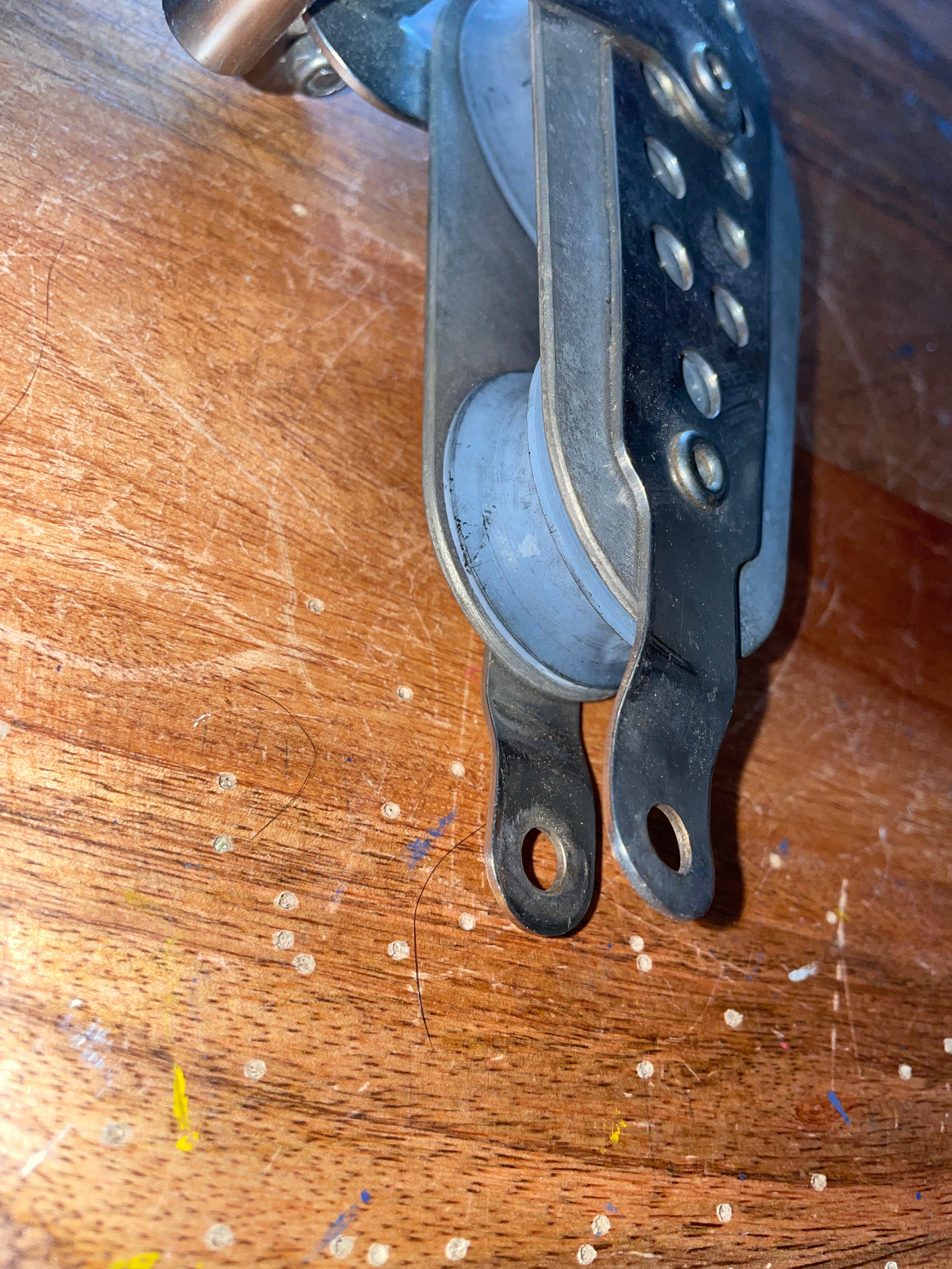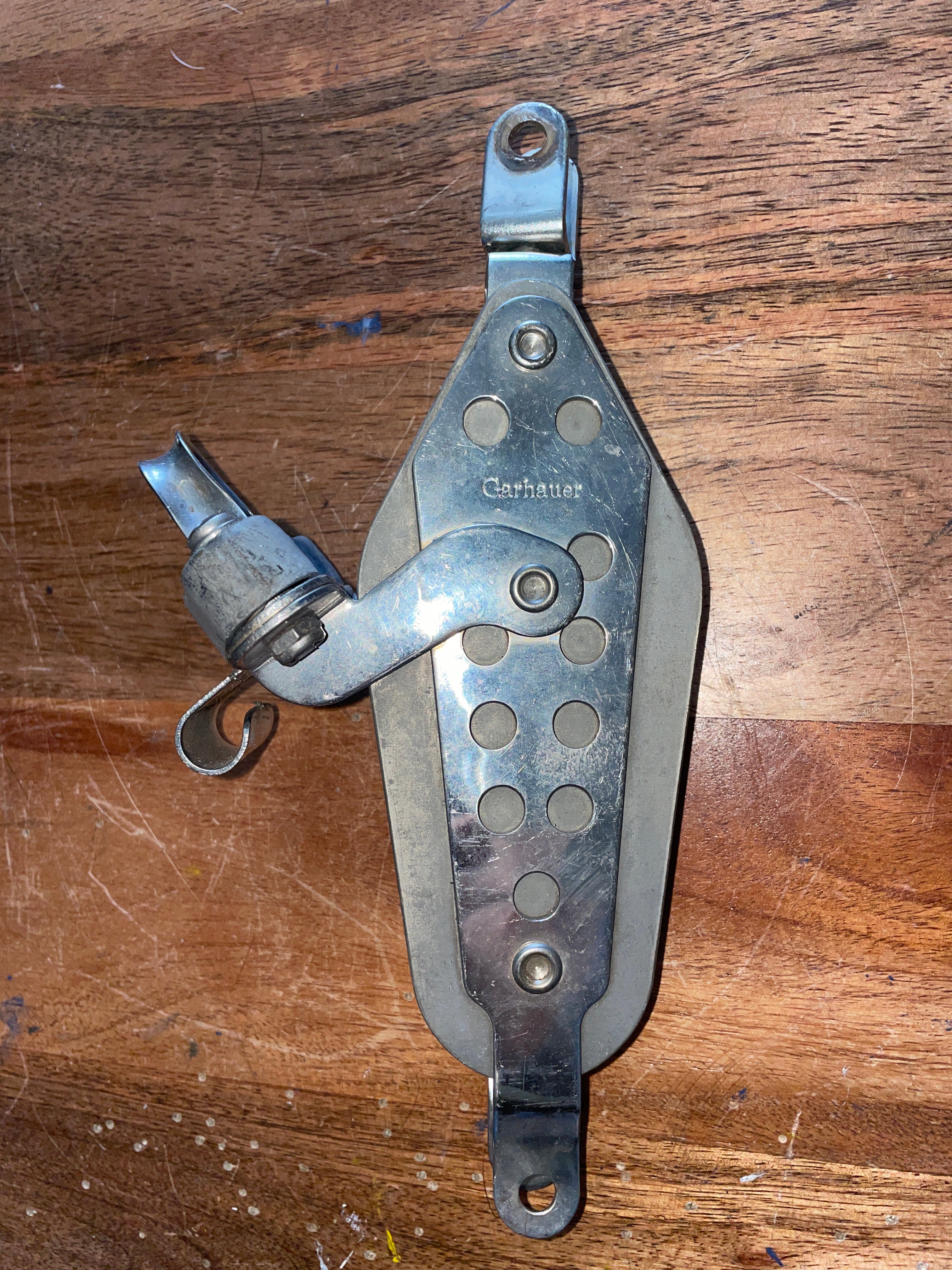 This garhauer swivel fiddle block is in good condition. The body is aluminum with the stainless middle, plastic sheaves. The sheaves are 2 1/4” and 1 3/4” diameter. The sheaves fit MAX 3/8” line diameter. The cam cleat does work, however it sticks slightly. There is a Beckett but it is missing the roller. Area at the top for a shackle to be added, 1/4” pin with a 9/16” width. Total length of this block is 8”.