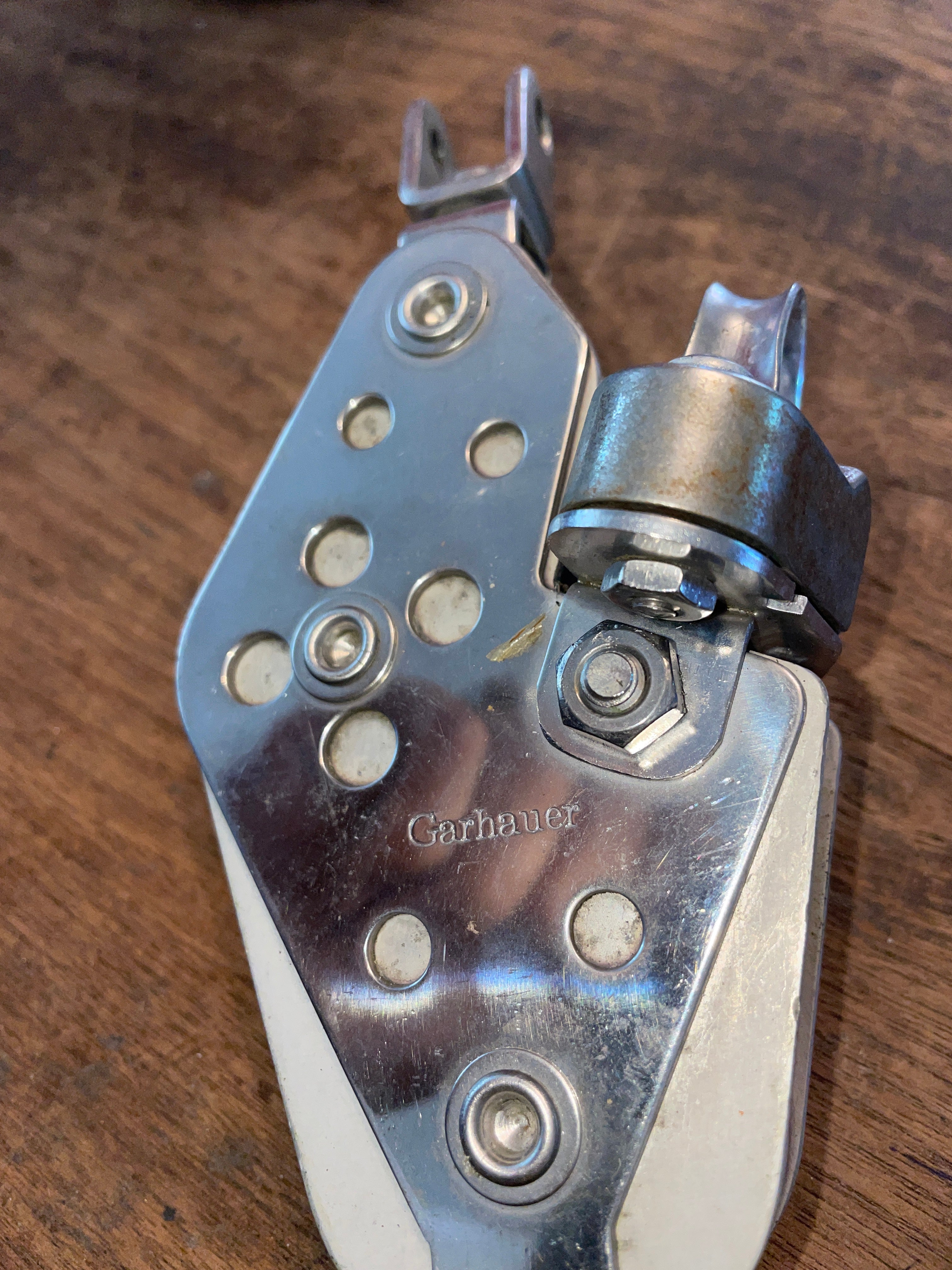 This Garhauer swivel fiddle with cam cleat and rope guide is in good working condition. The sheaves are 2”. Fits up to 7/16” line diameter. The cam cleat seems to work as should. Length of the whole block is 7 1/2” long.