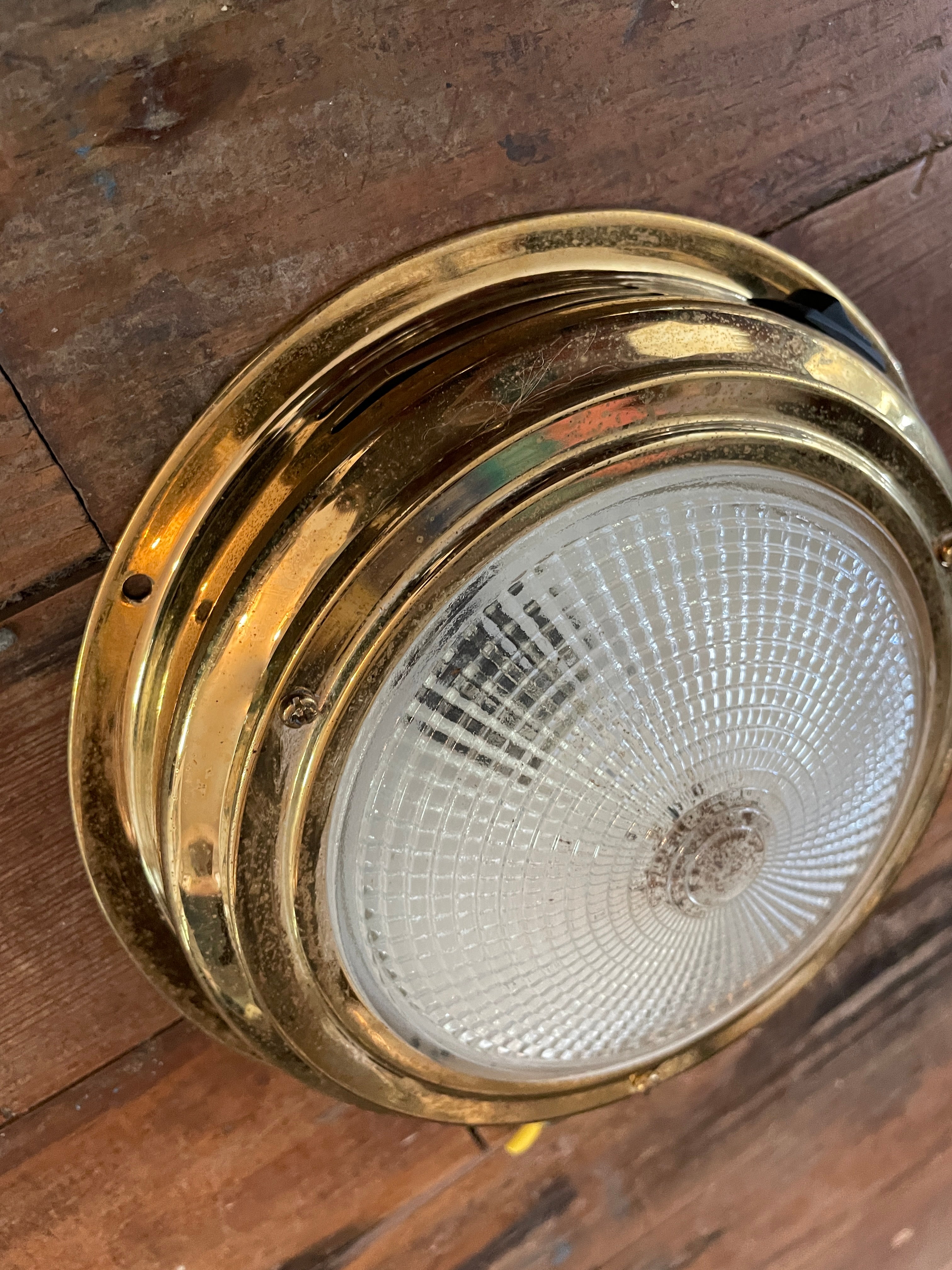 This interior light is in good condition although it is untested. The golden outside is slightly pitting but not bad. It is 6 3/4” diameter. Still good wiring for Reinstallation. On/Off switch works as should.