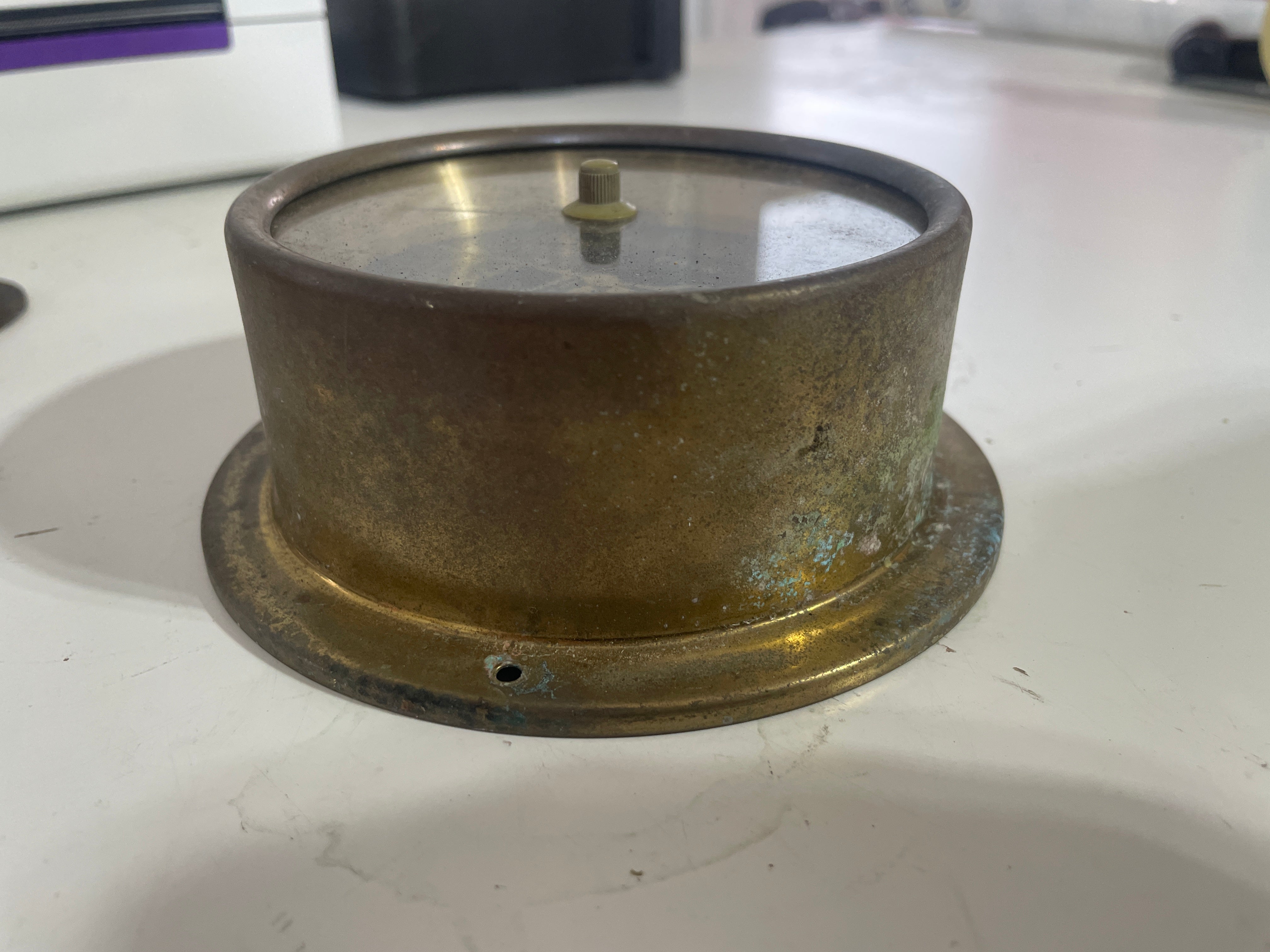 This Grenoble barometer is not in the best condition. The brass casing is sitting and the blue painted background is chipping. This barometer is untested cause it is all internal fixings so we are selling it as is! The face of the barometer is 4 3/8" diameter x 5 1/4" diameter base x 2" tall.