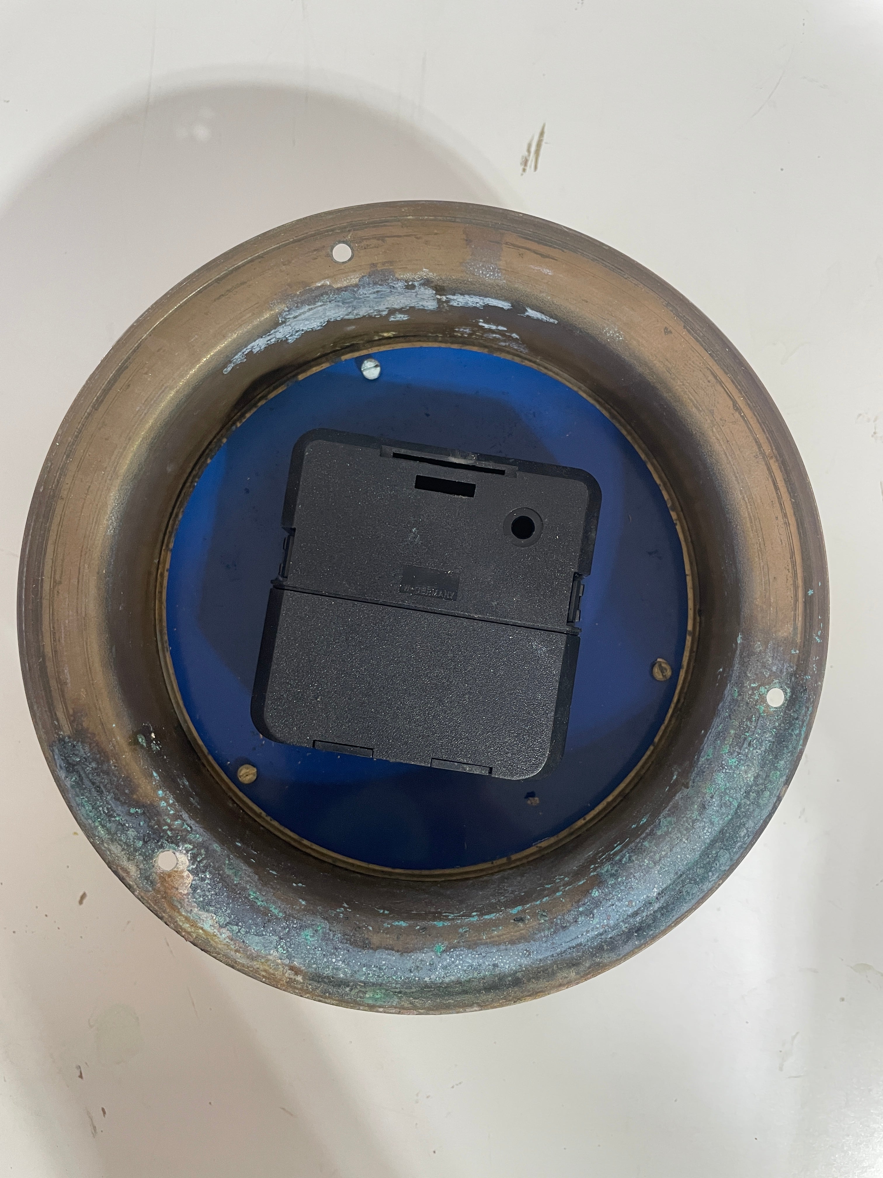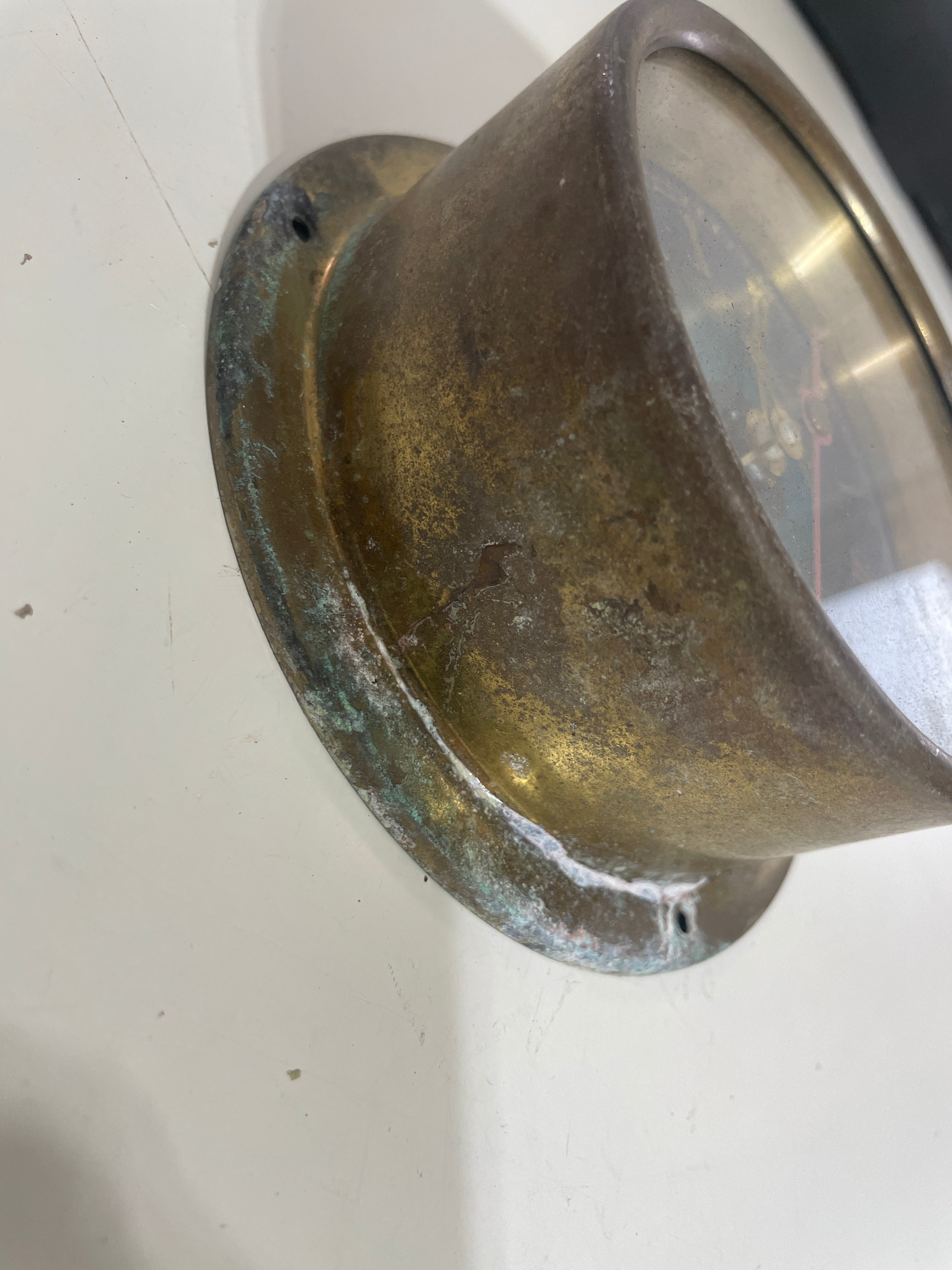 This Grenoble Clock is not in the best condition. The brass casing is sitting and the blue painted background is chipping. This barometer is untested cause it is all internal fixings so we are selling it as is! The face of the barometer is 4 3/8" diameter x 5 1/4" diameter base x 2" tall.