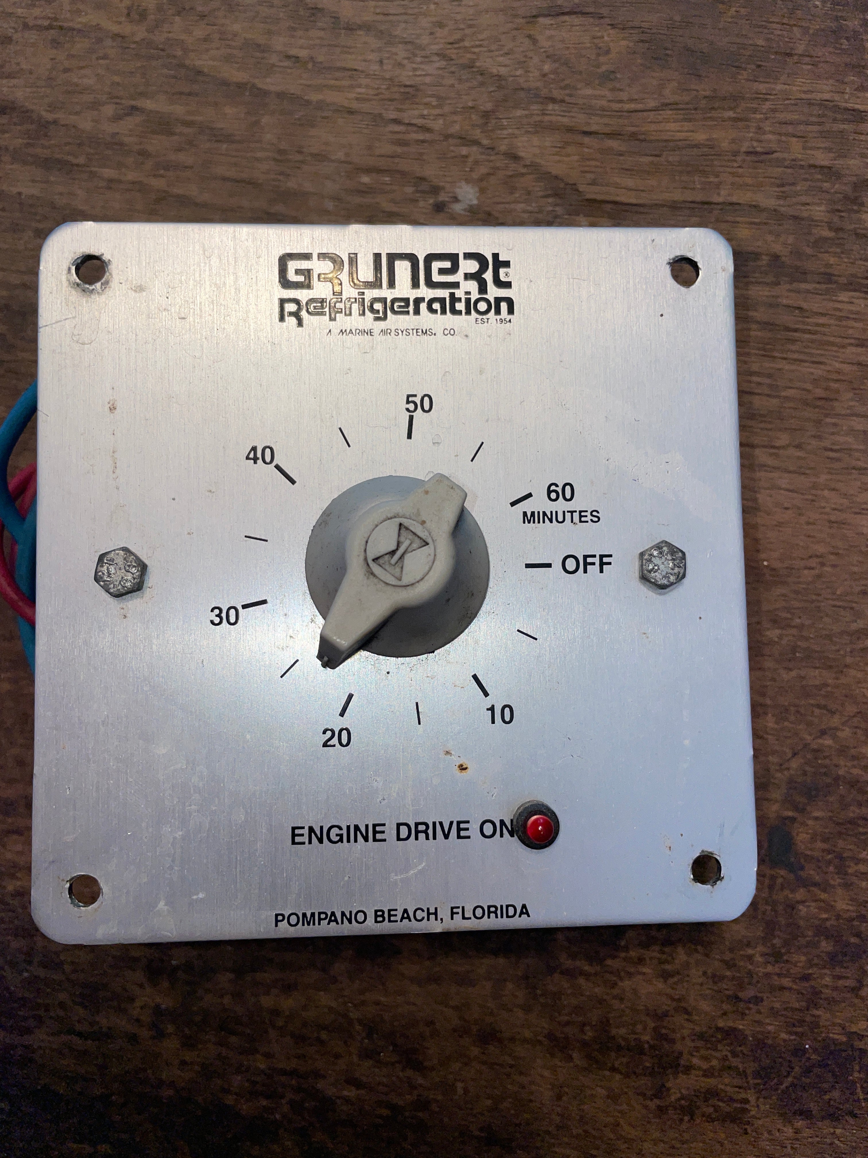 This Grunert refrigeration panel is in good condition. The timer works as should. Measures 4 3/8” x 4 3/8”.