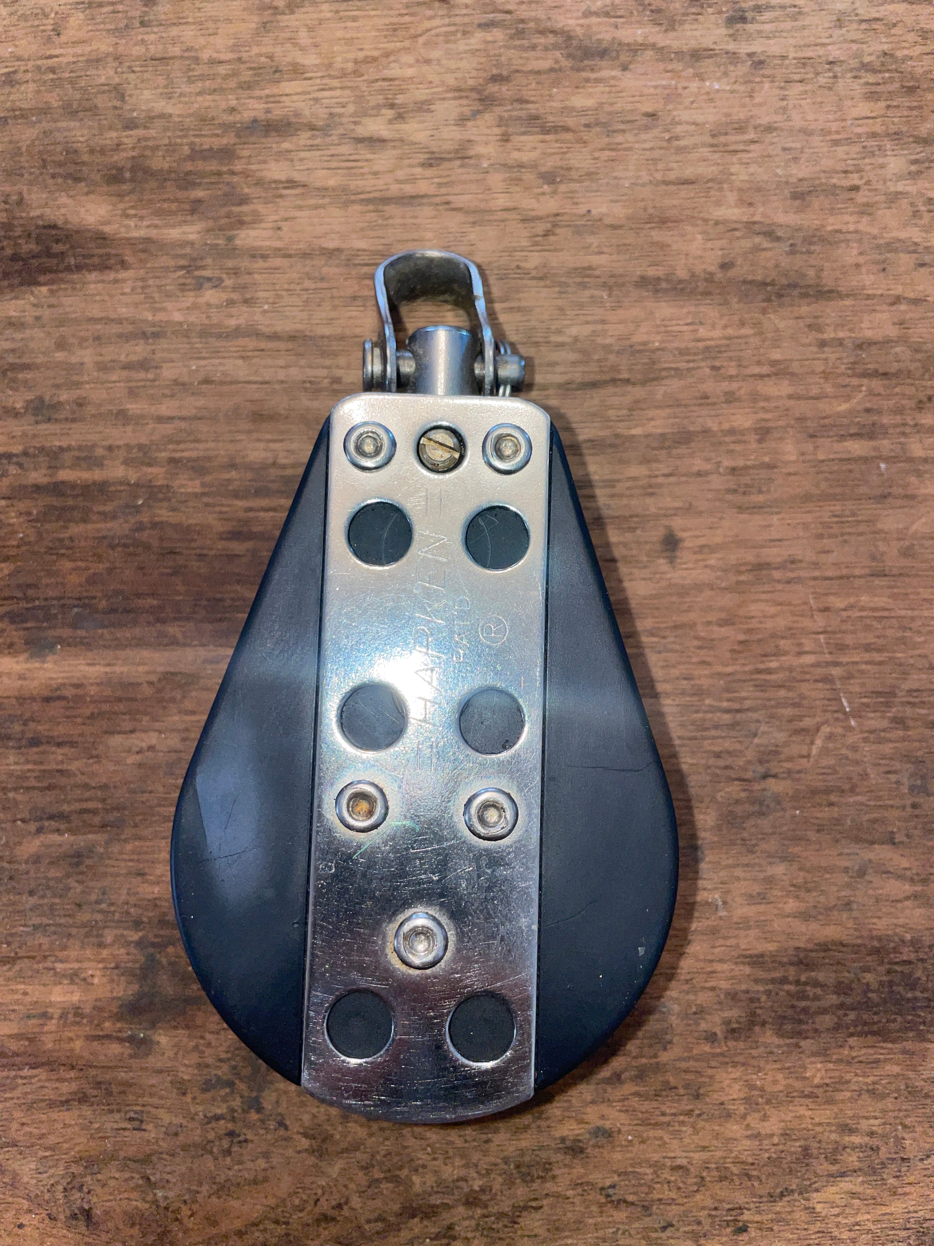This harken single swivel block is in good condition. It has a 2 1/4” sheave and can fit up to 3/8” line diameter. Has shackle that is also 3/8” diameter. Block with shackle is 4 1/4” long.