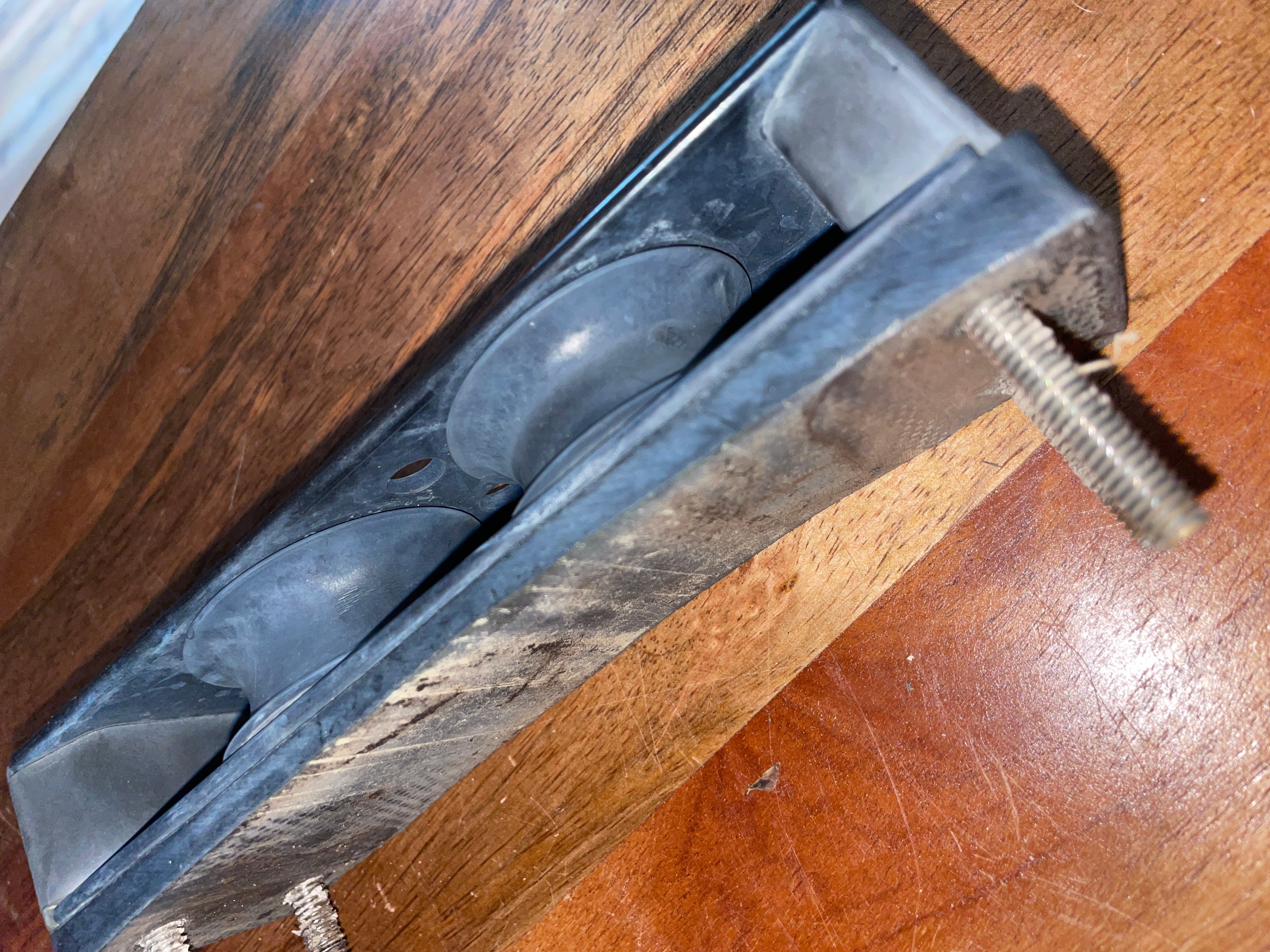 This harken double deck organizer is in excellent condition. It fits up to 5/8” line diameter. It has a mounting pad on the base that makes it sit at a slight angle. That can be removed for a flat mounting organizer. It measures 6 3/4” long x 2” wide x 1 1/8” tall (this is without the base).