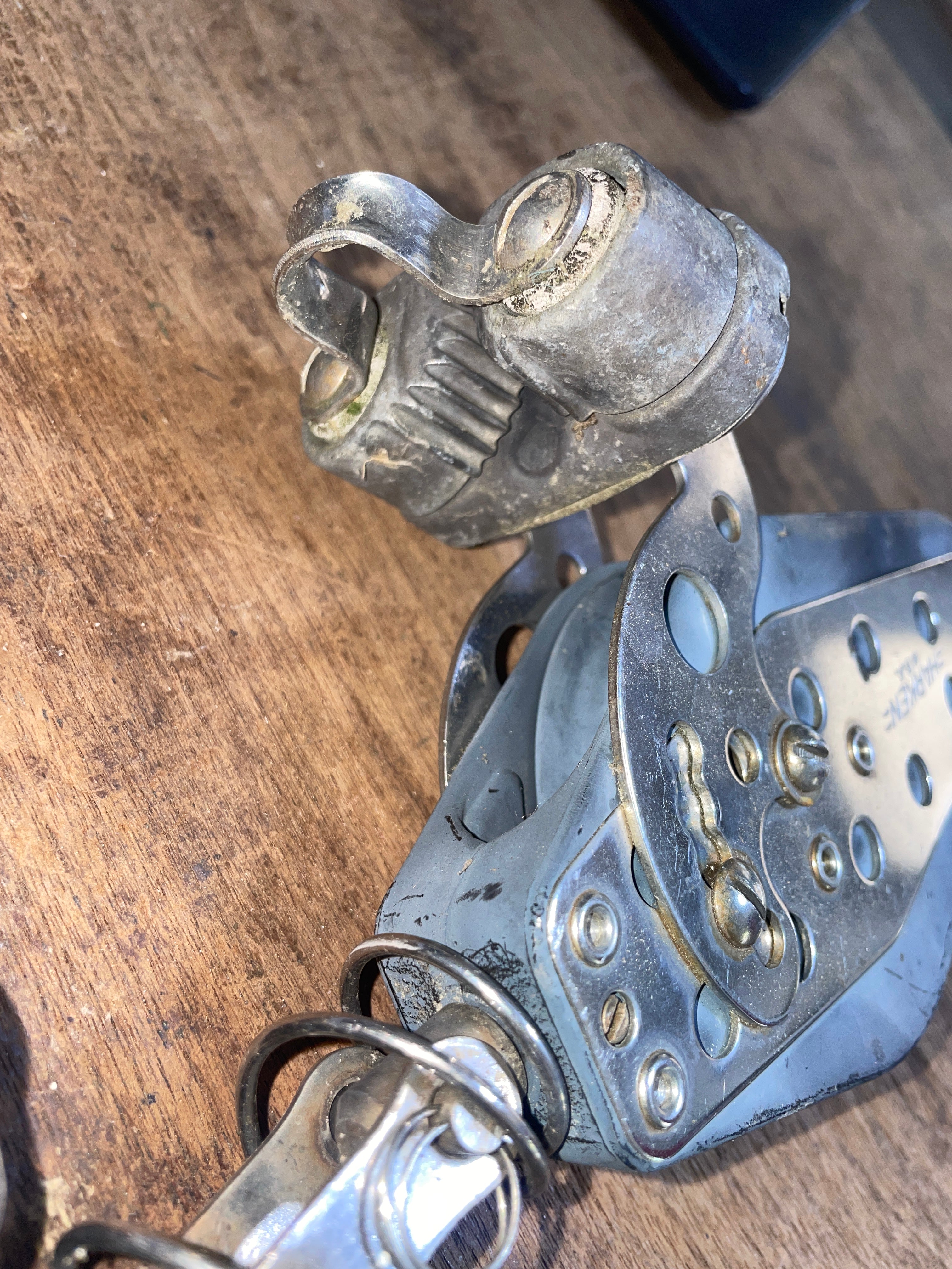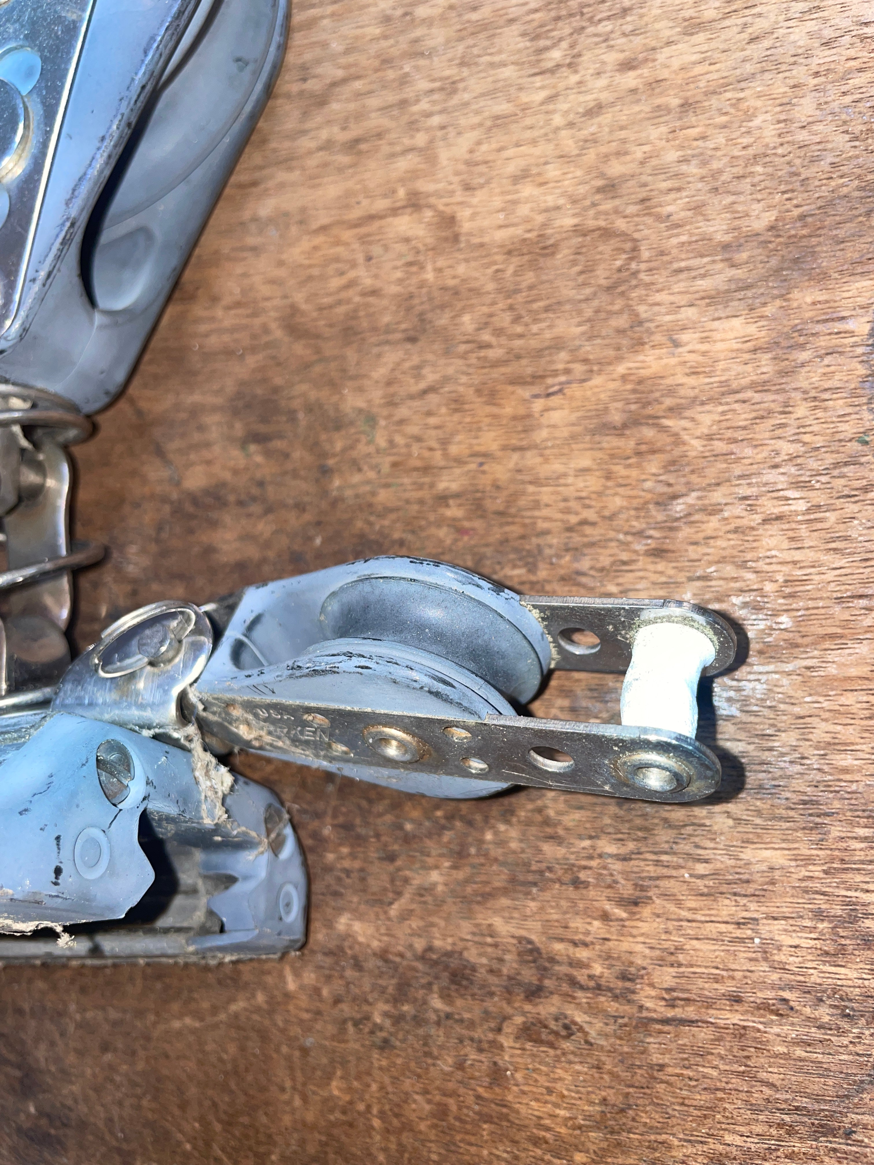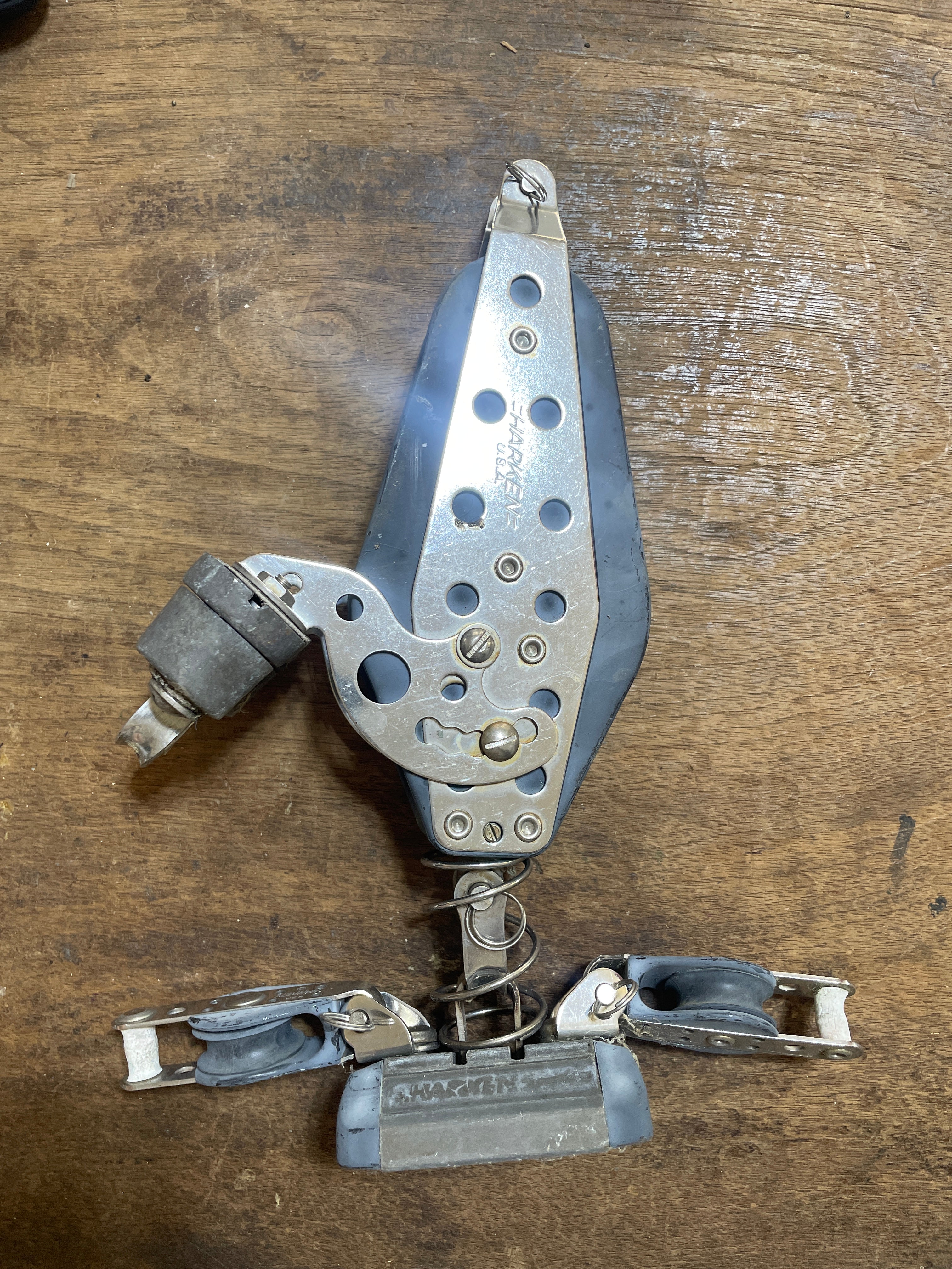 Harken Fiddle Block that has a 2 3/4" larger sheave and 1 3/4" smaller sheave with Cam Cleat that works as it should & Beckett. This fiddle block is fixed onto a 1" harken Track Car that has 2 - 1 1/8" shaved single blocks on each side. The track car is 2 7/8" total length. Total height is 9 5/8".