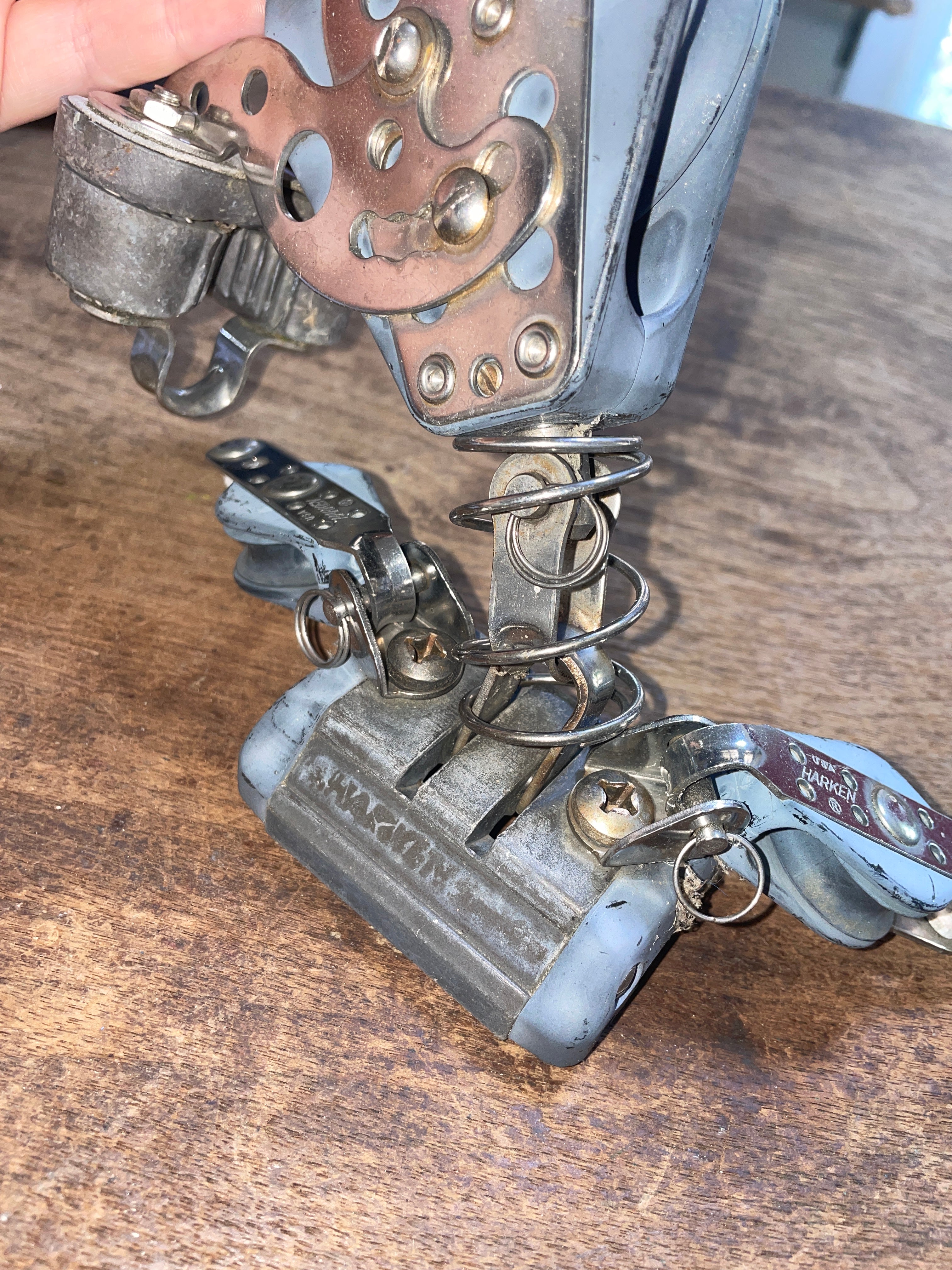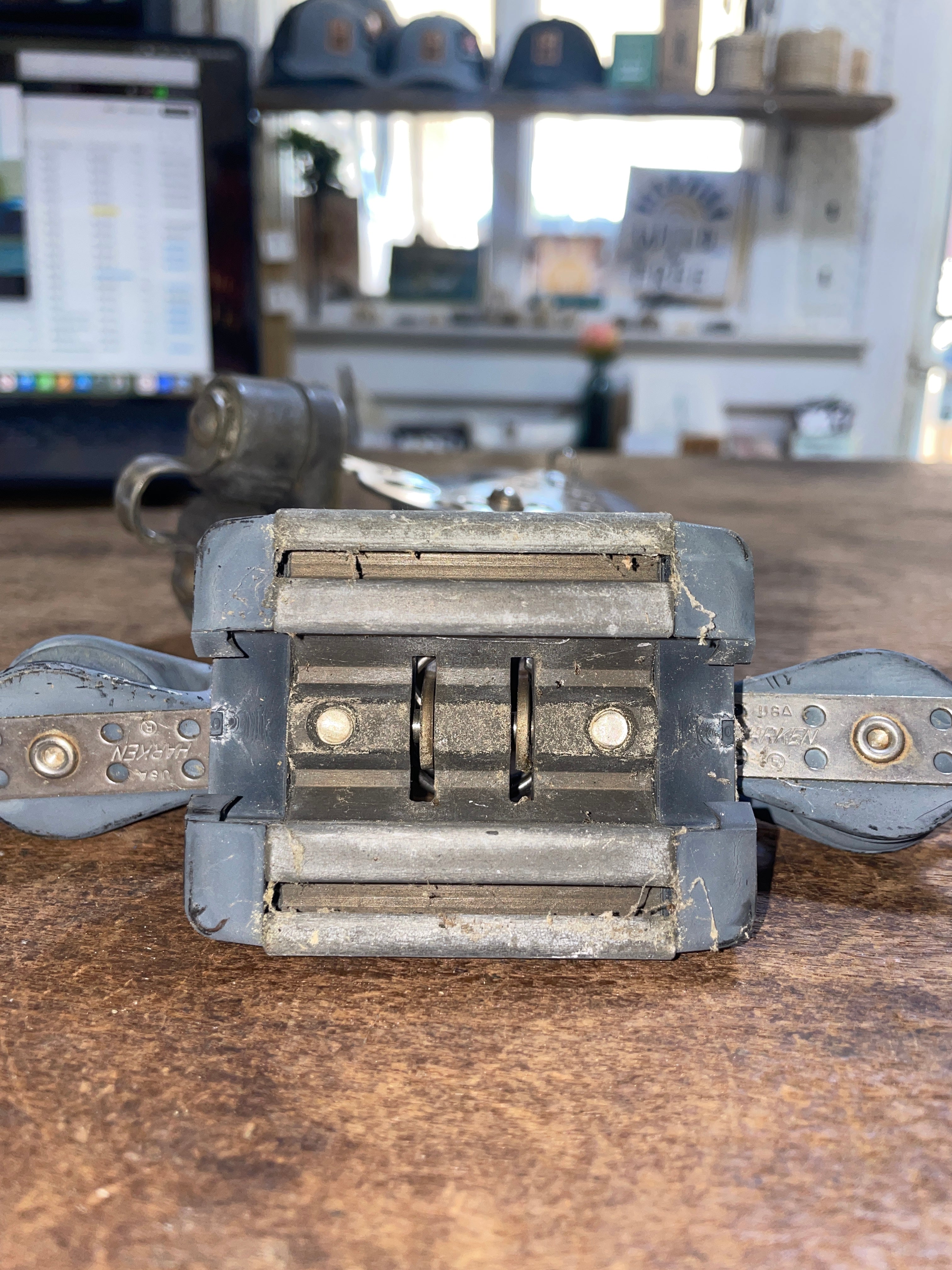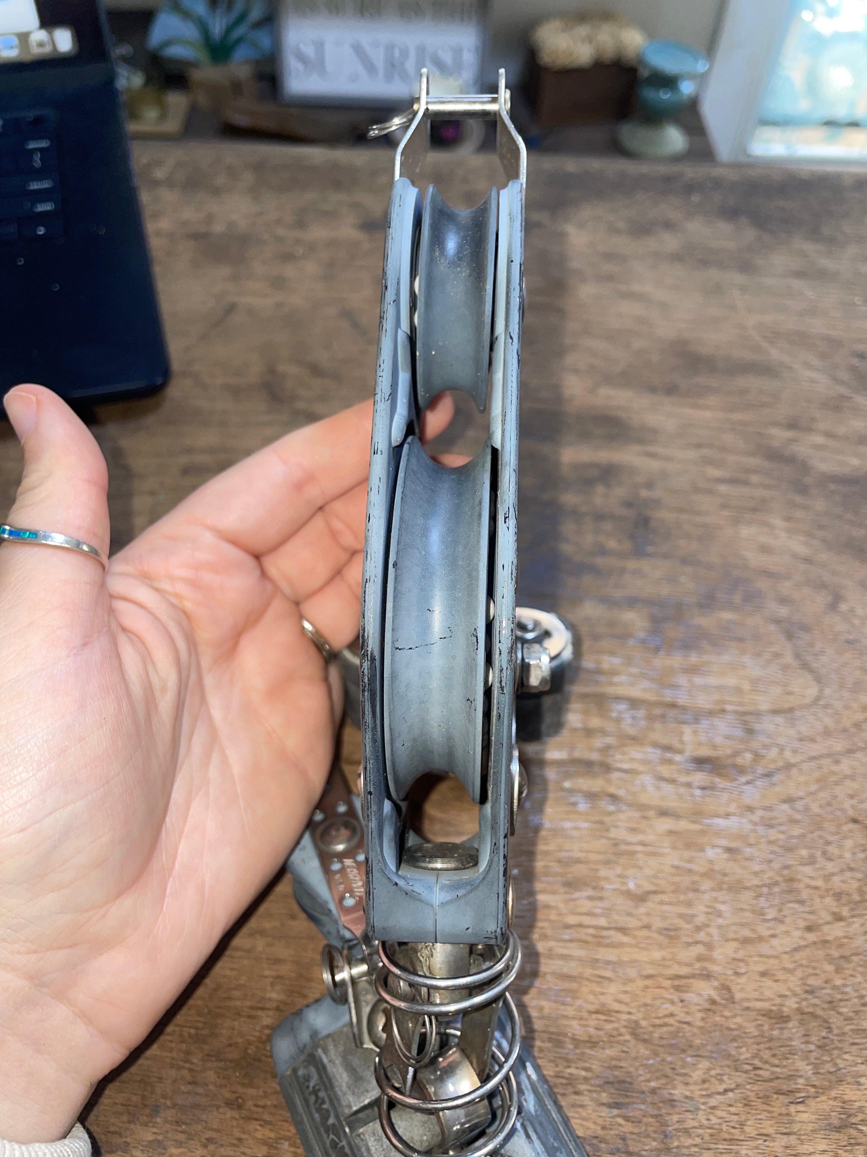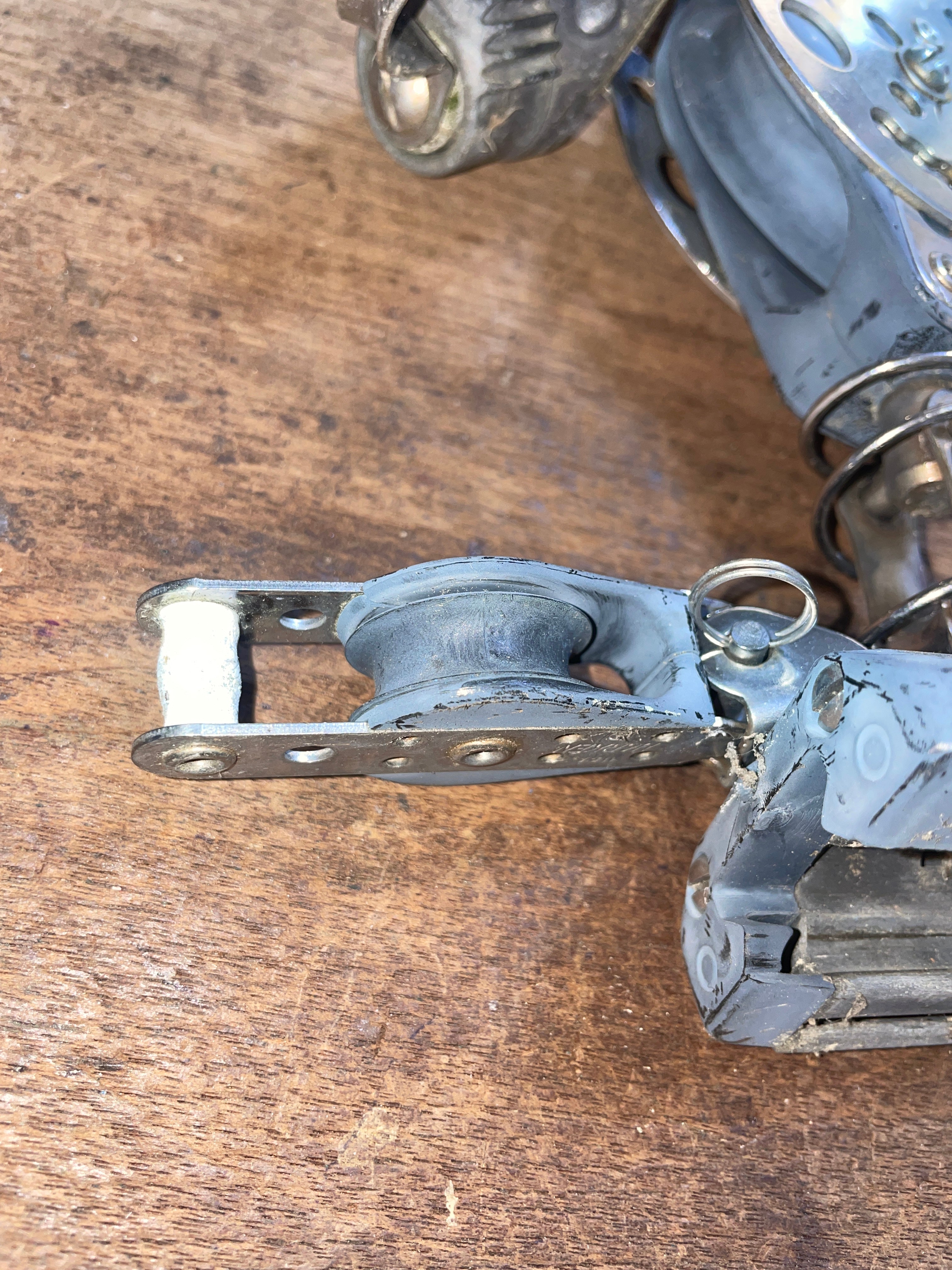 Harken Fiddle Block that has a 2 3/4" larger sheave and 1 3/4" smaller sheave with Cam Cleat that works as it should & Beckett. This fiddle block is fixed onto a 1" harken Track Car that has 2 - 1 1/8" shaved single blocks on each side. The track car is 2 7/8" total length. Total height is 9 5/8".