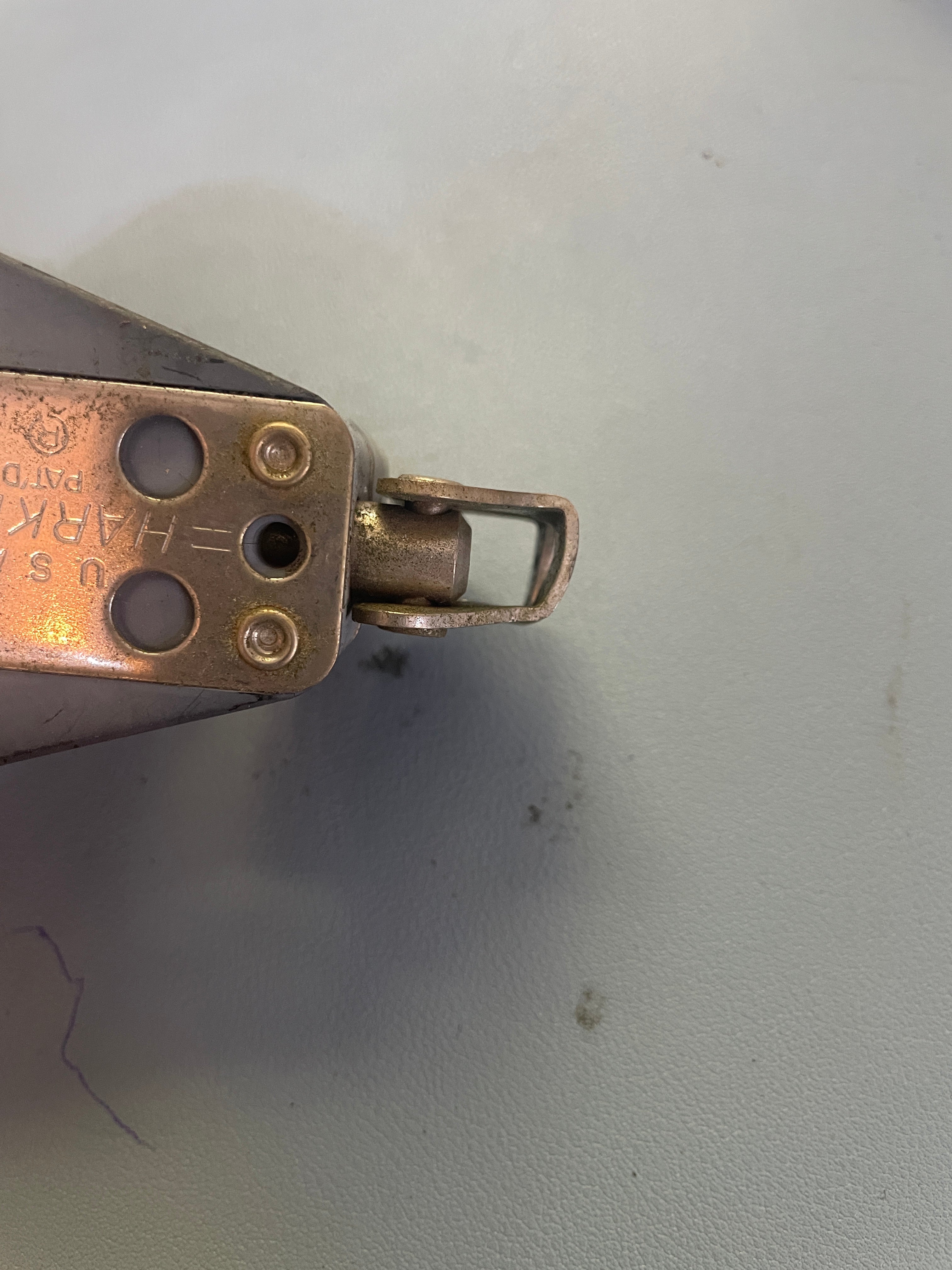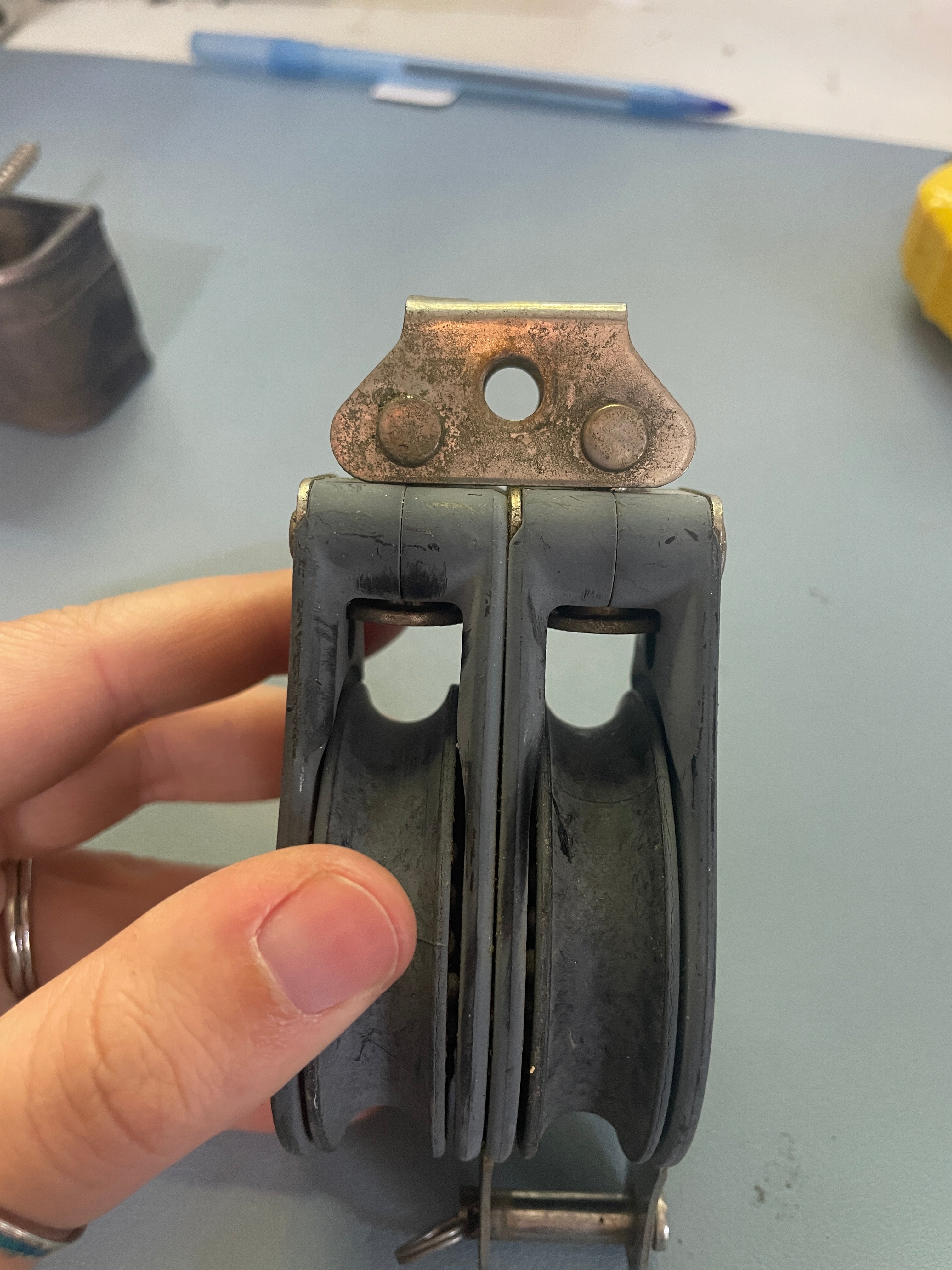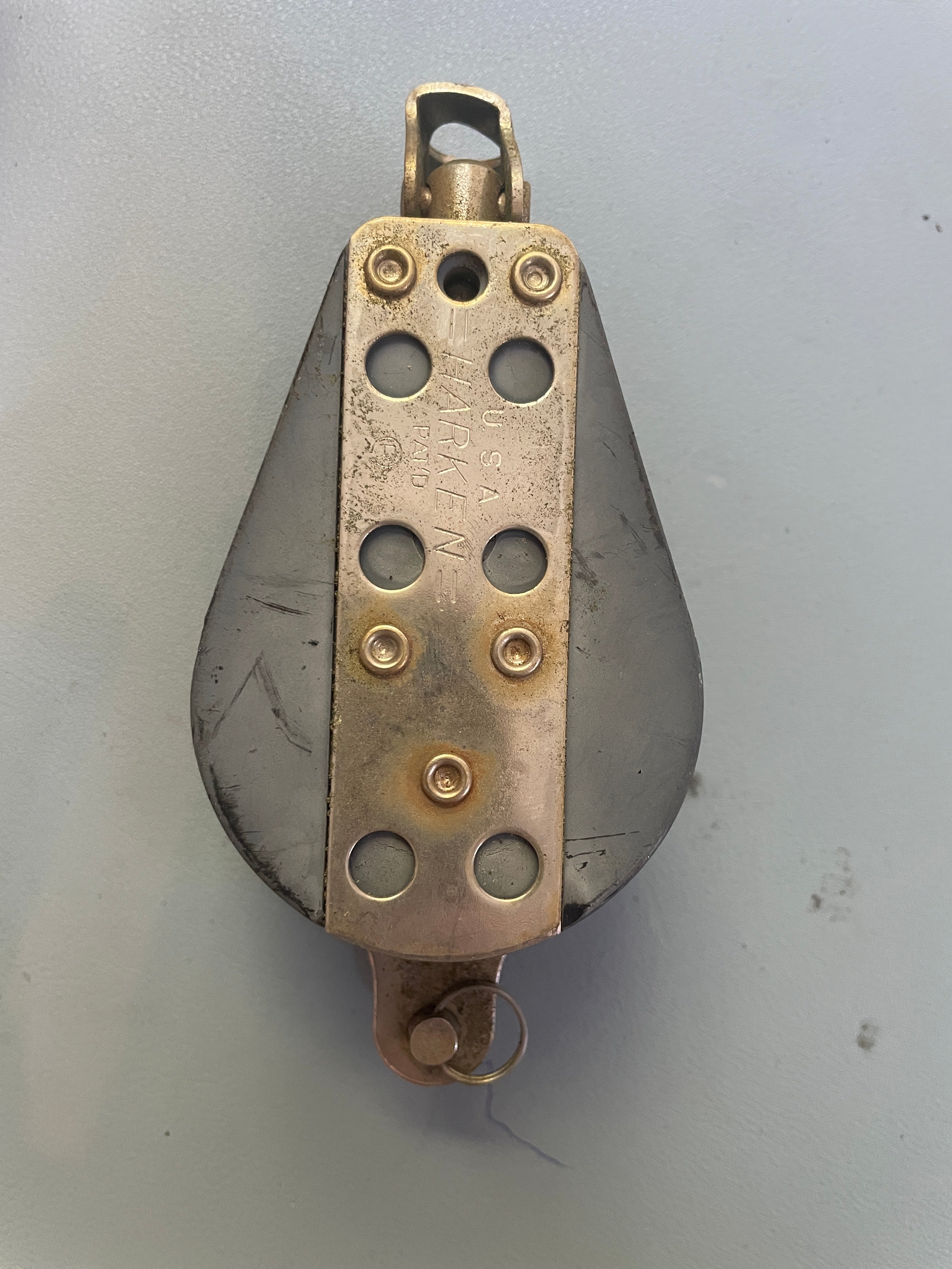 This harken fixed double block is in good condition. The sheaves are 2 1/4" and fit max 7/16" line diameter. This block is 5" total length. There is a place for a shackle to be attached. This area is 5/8" wide x 1/4" pin. This area is slightly bent. It doesn't have any major issues and the sheave is in fair condition.