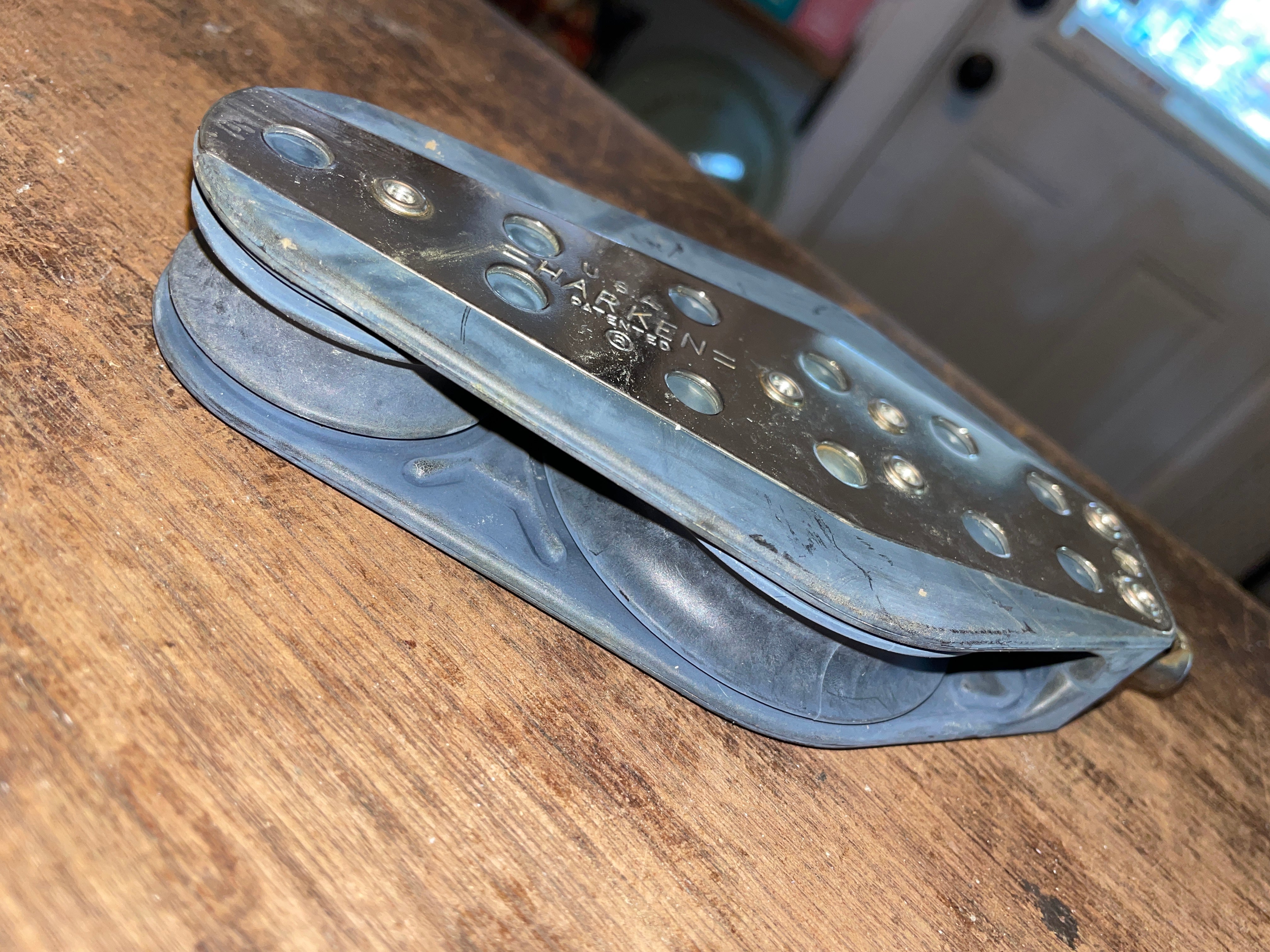 This harken swivel fiddle is in great condition. The largest sheave is 3” and the smaller is 1 7/8”. Fits up to 1/2” line diameter. Measures 6 5/8” total length.