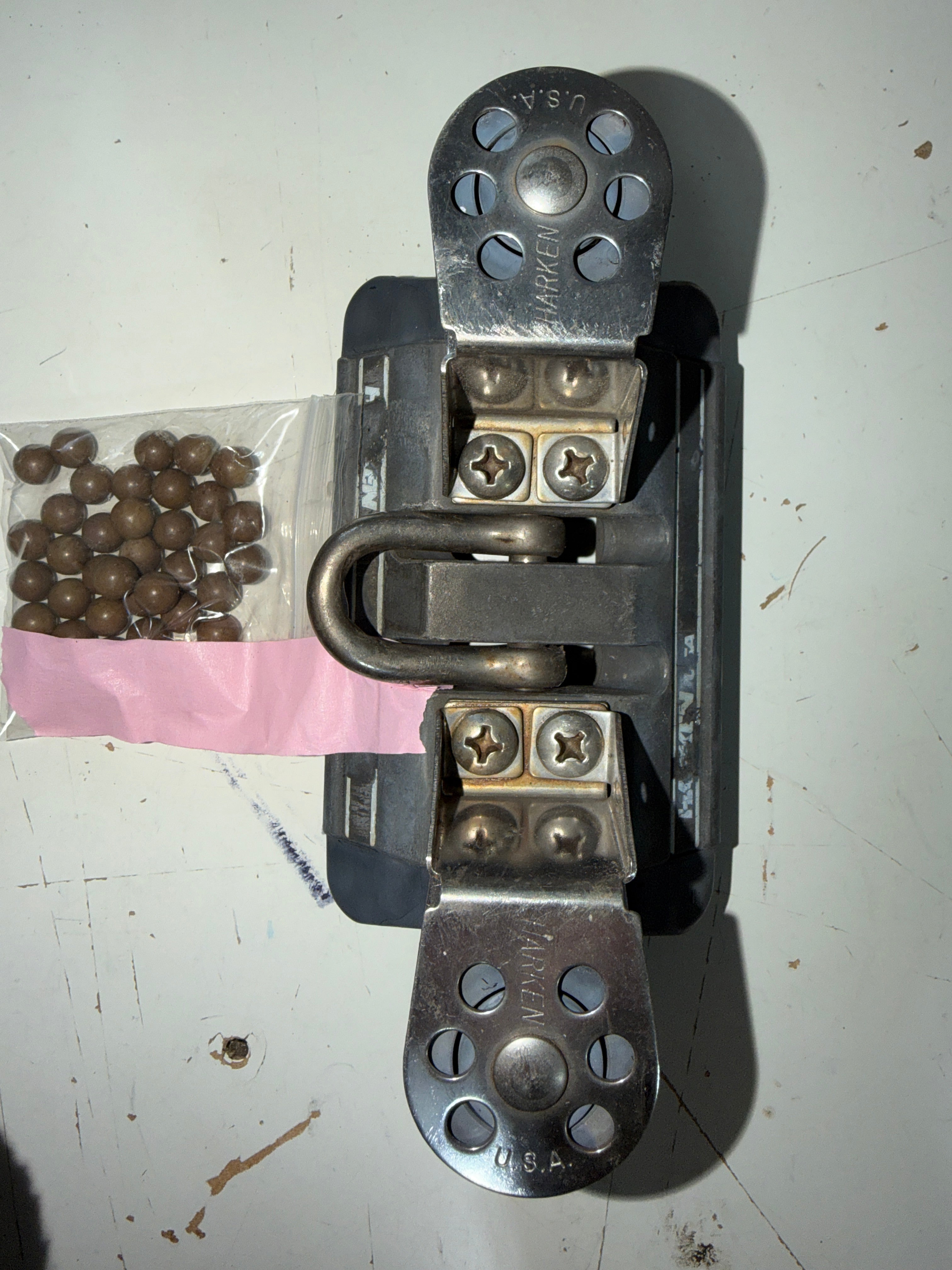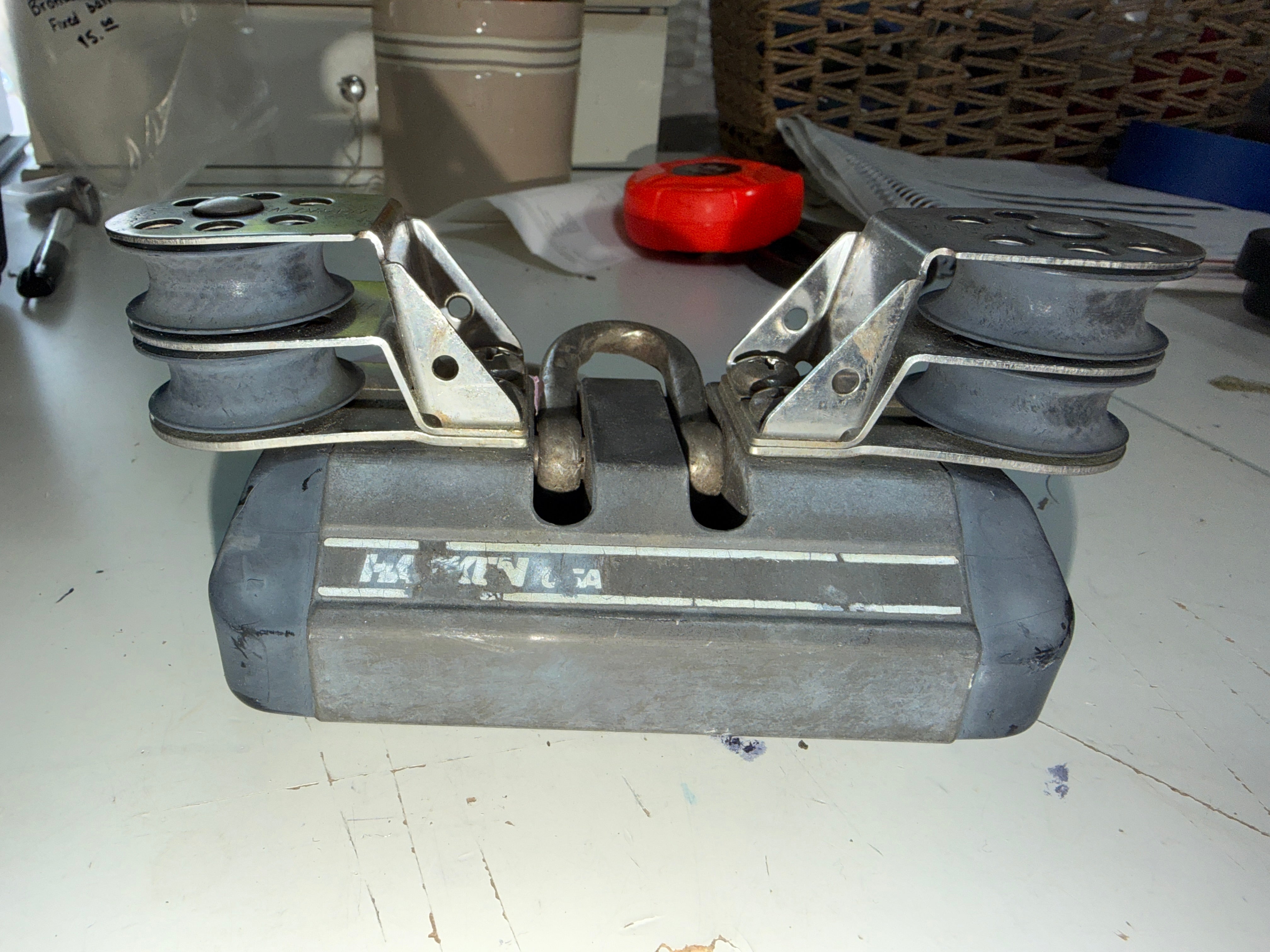 This ball bearing harken traveller car is in good condition. We saved all the balls needed - that it had. Fits a 1 3/8" diameter track. There are 2 double sheaves on either end. These are 1 1/2" diameter and fit 3/8" line diameter. Center shackle has a 3/4" width. Total length is 5 3/8" and it stands 3" tall.