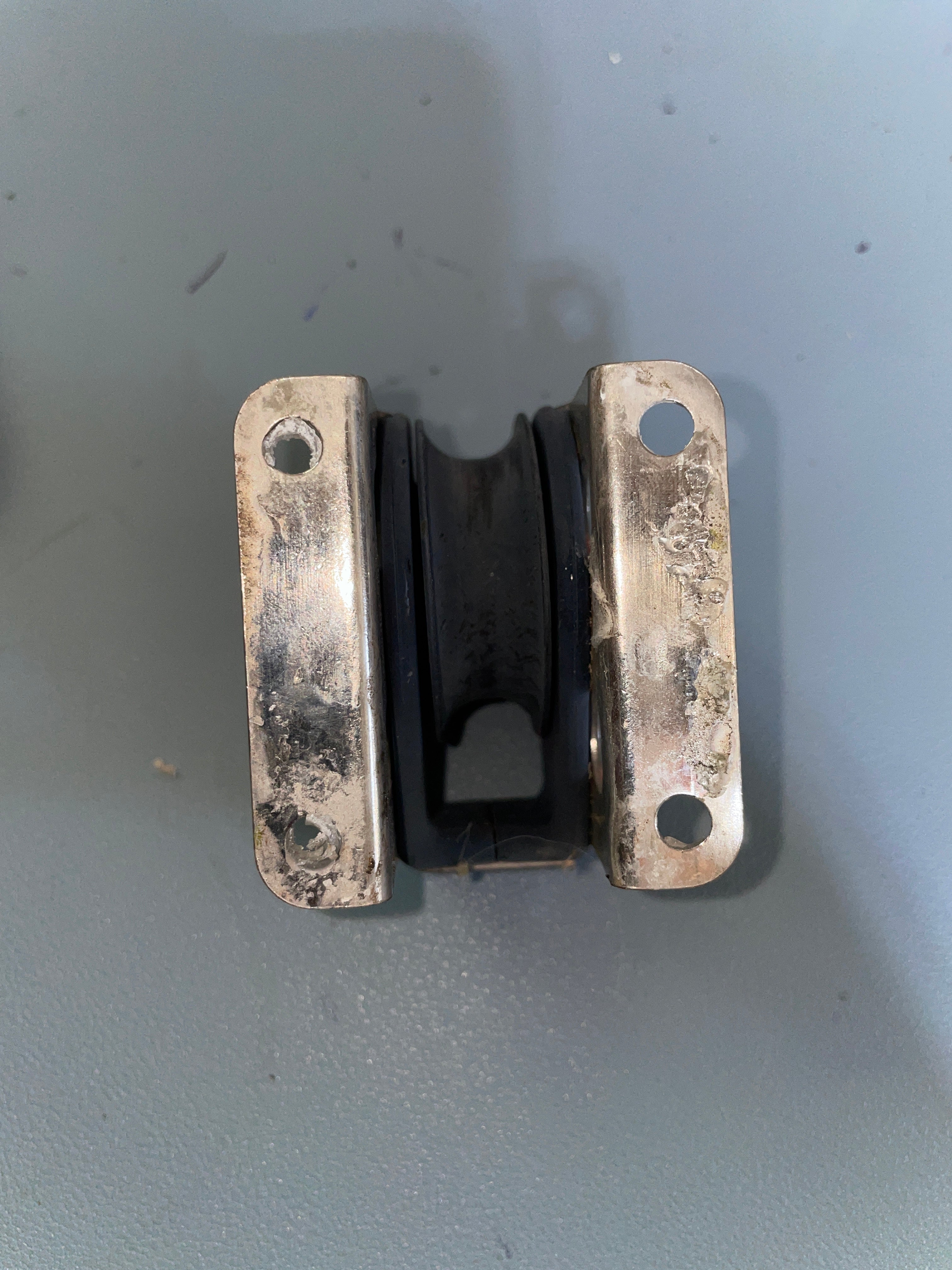 This smaller harken upright lead block is in good condition. The shave is 1 1/2" diameter and fits max 3/8" line diameter. The base is 2" long x 1 7/8" wide x 1 3/4" tall. Does have some scratches on it.