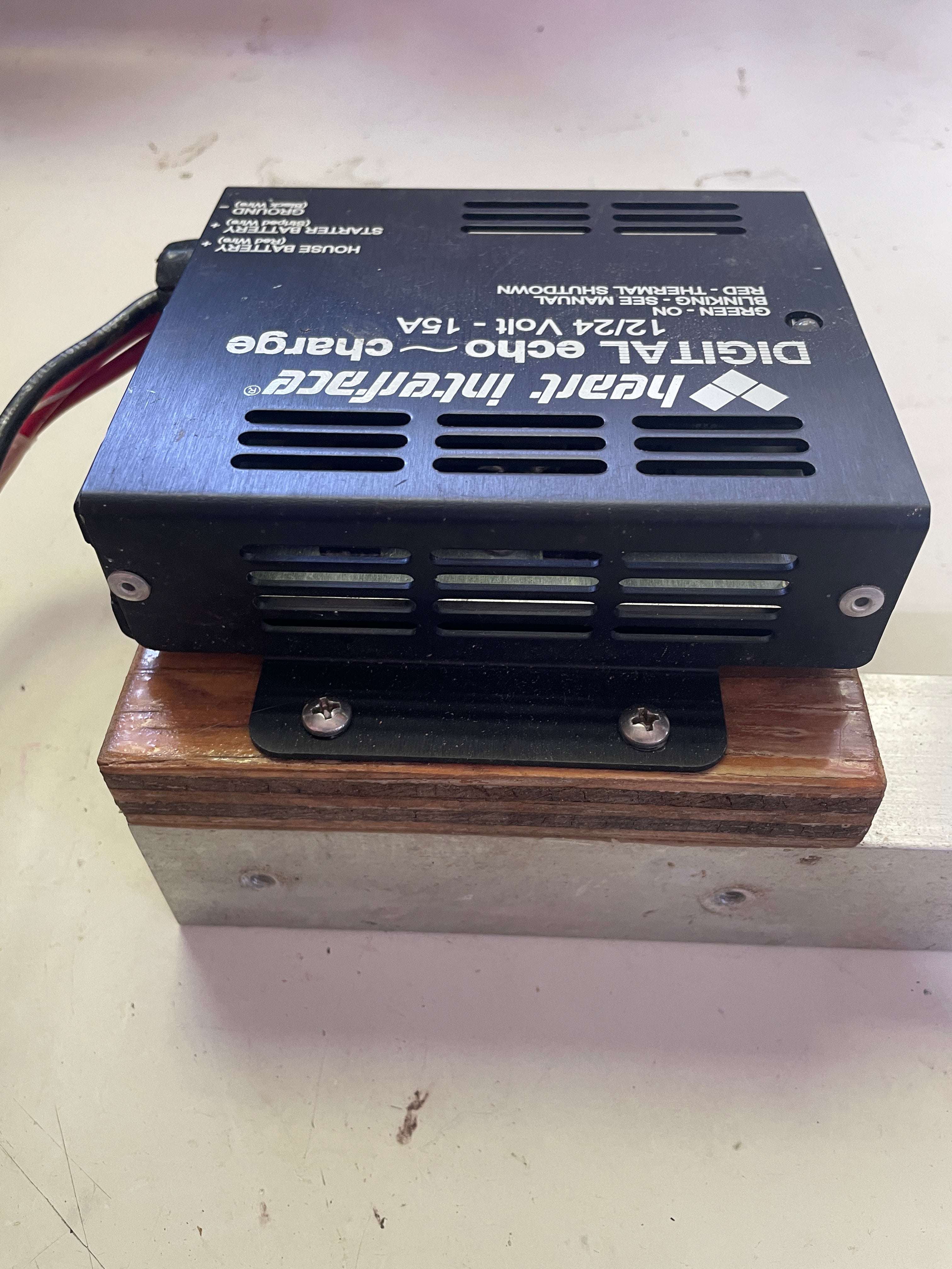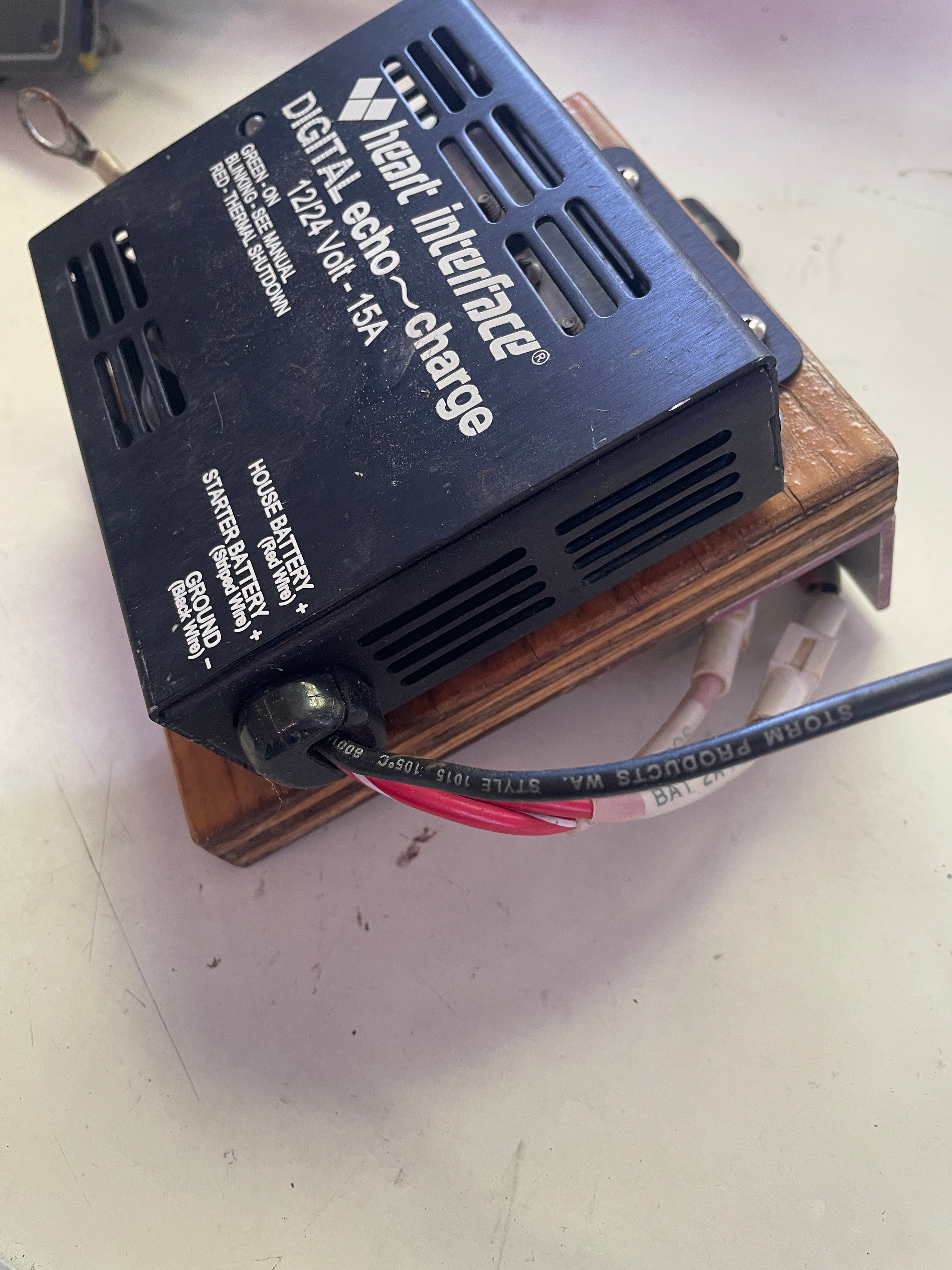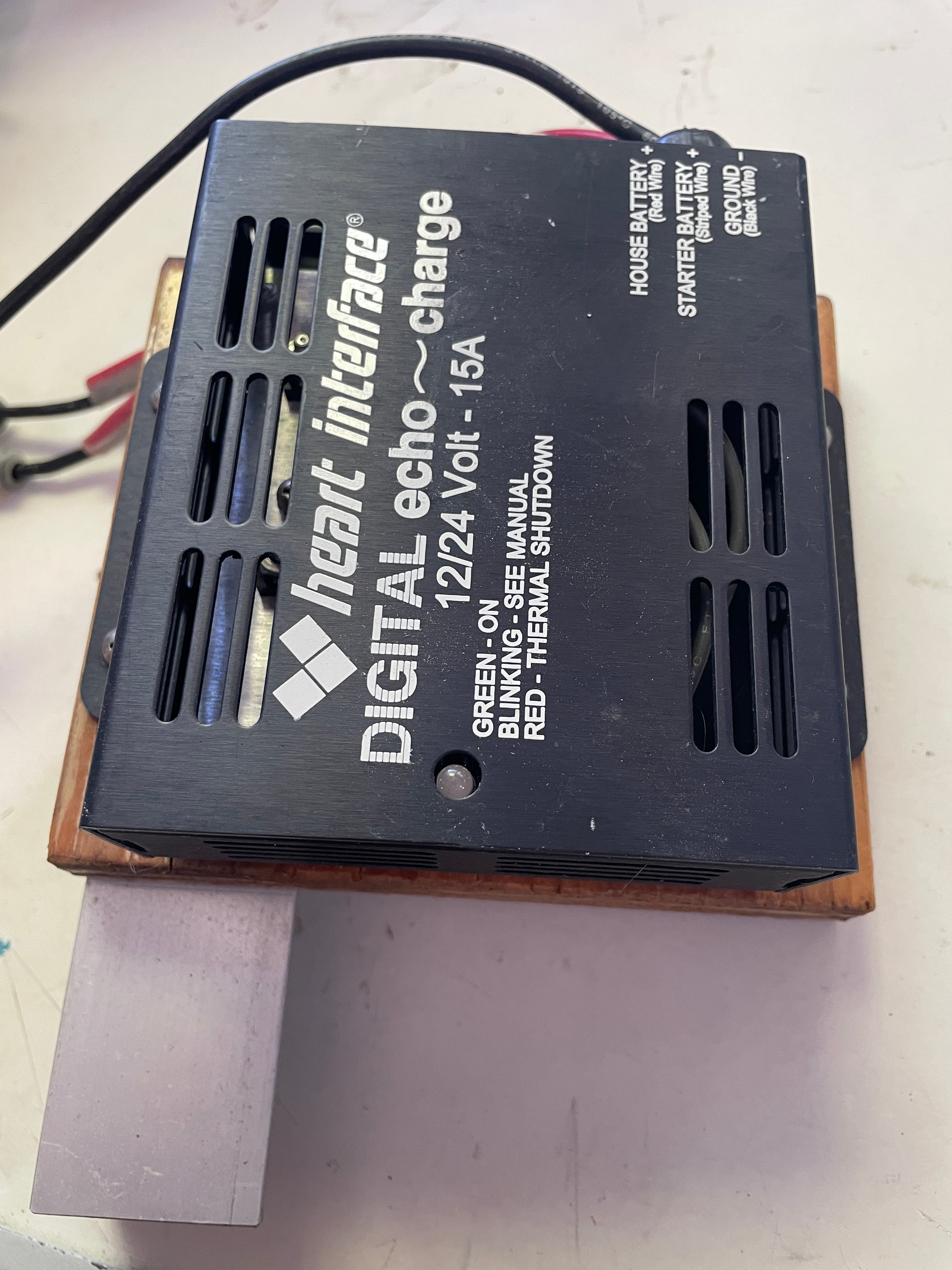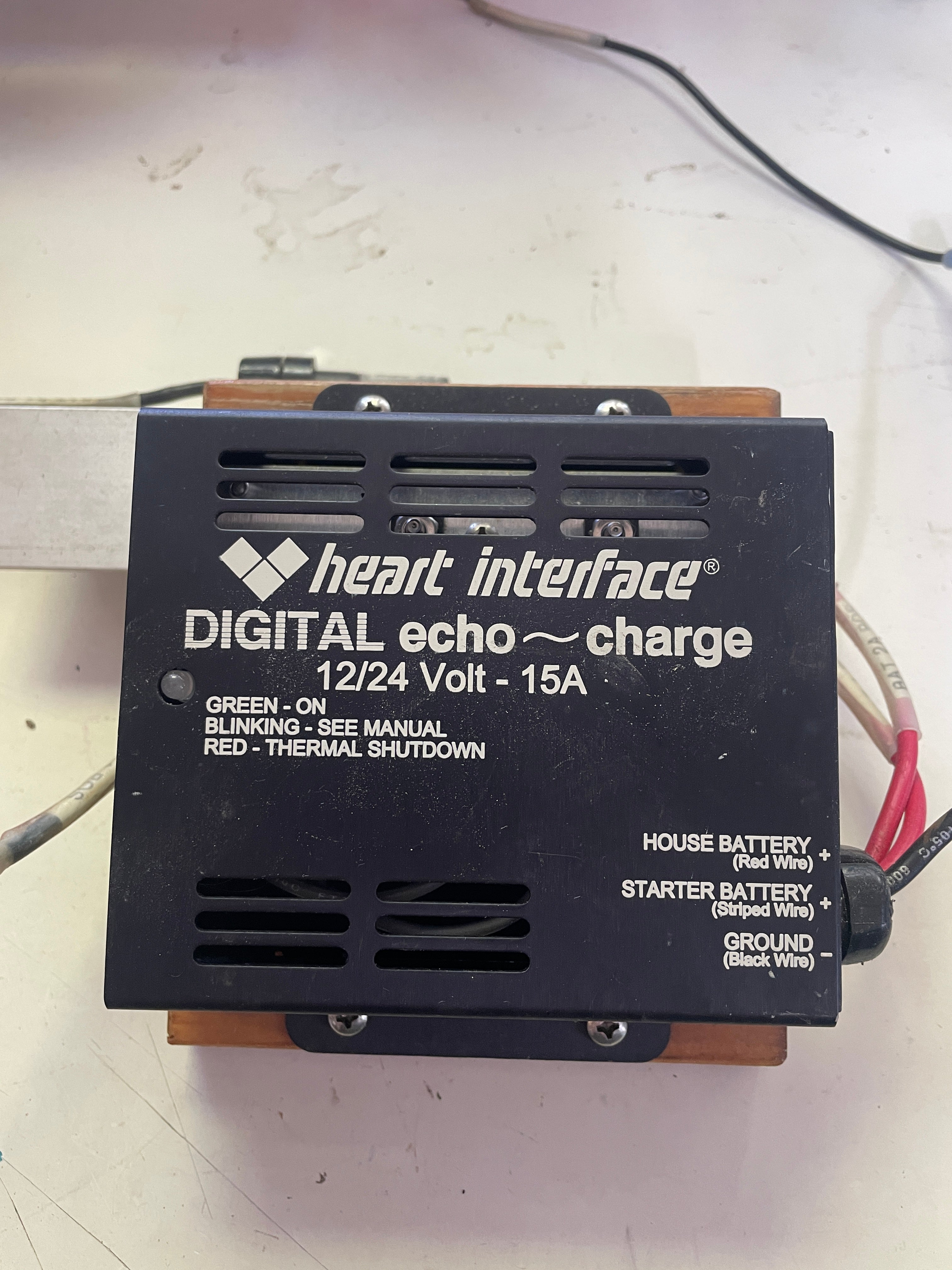 This heart interface digital echo charger is in great condition. It is 12/24 volt. 15A. All wires are intact, non cut when removed. Mounted on a small piece of teak that is 5 1/8” long x 5 1/2” wide.
