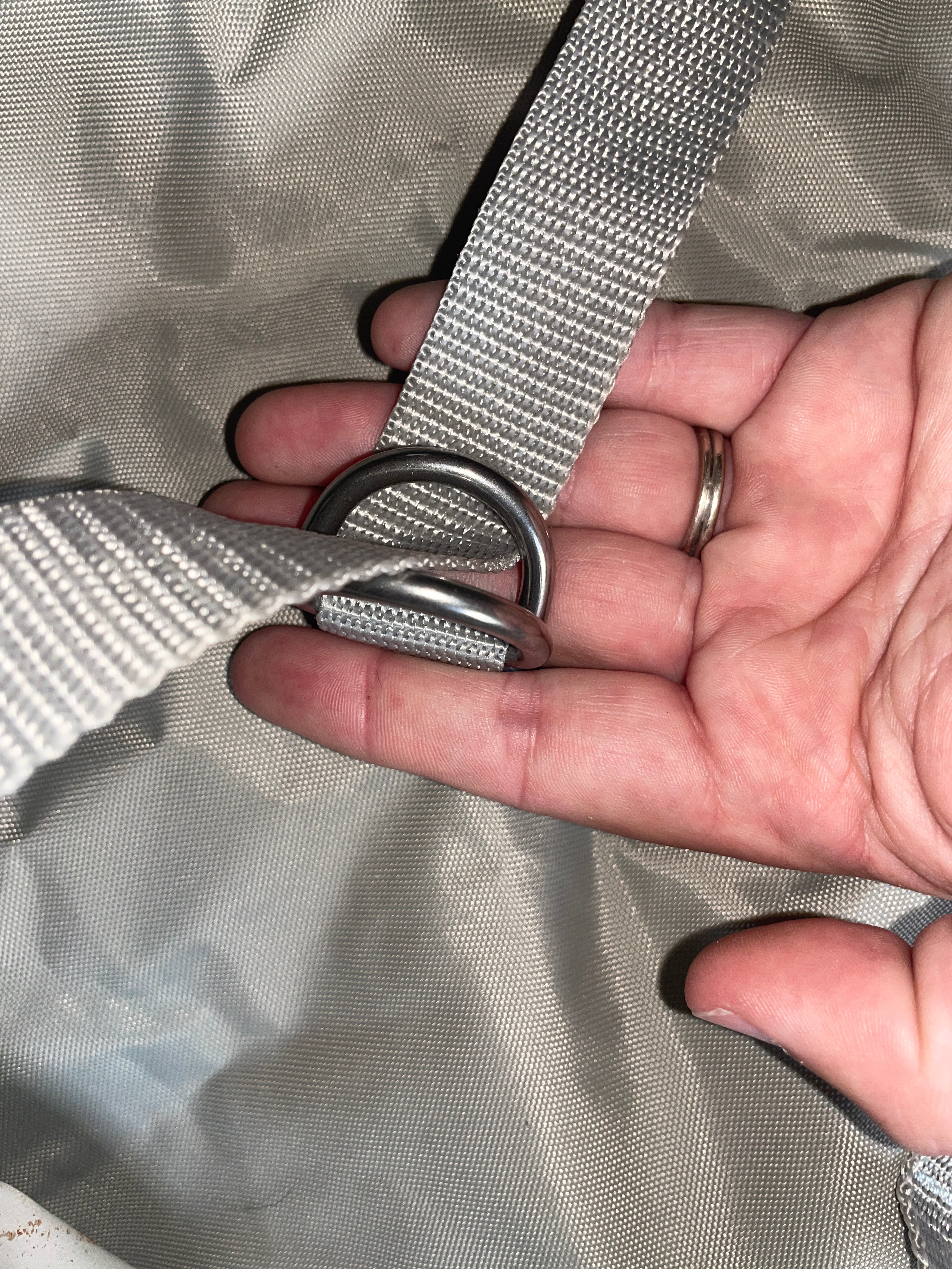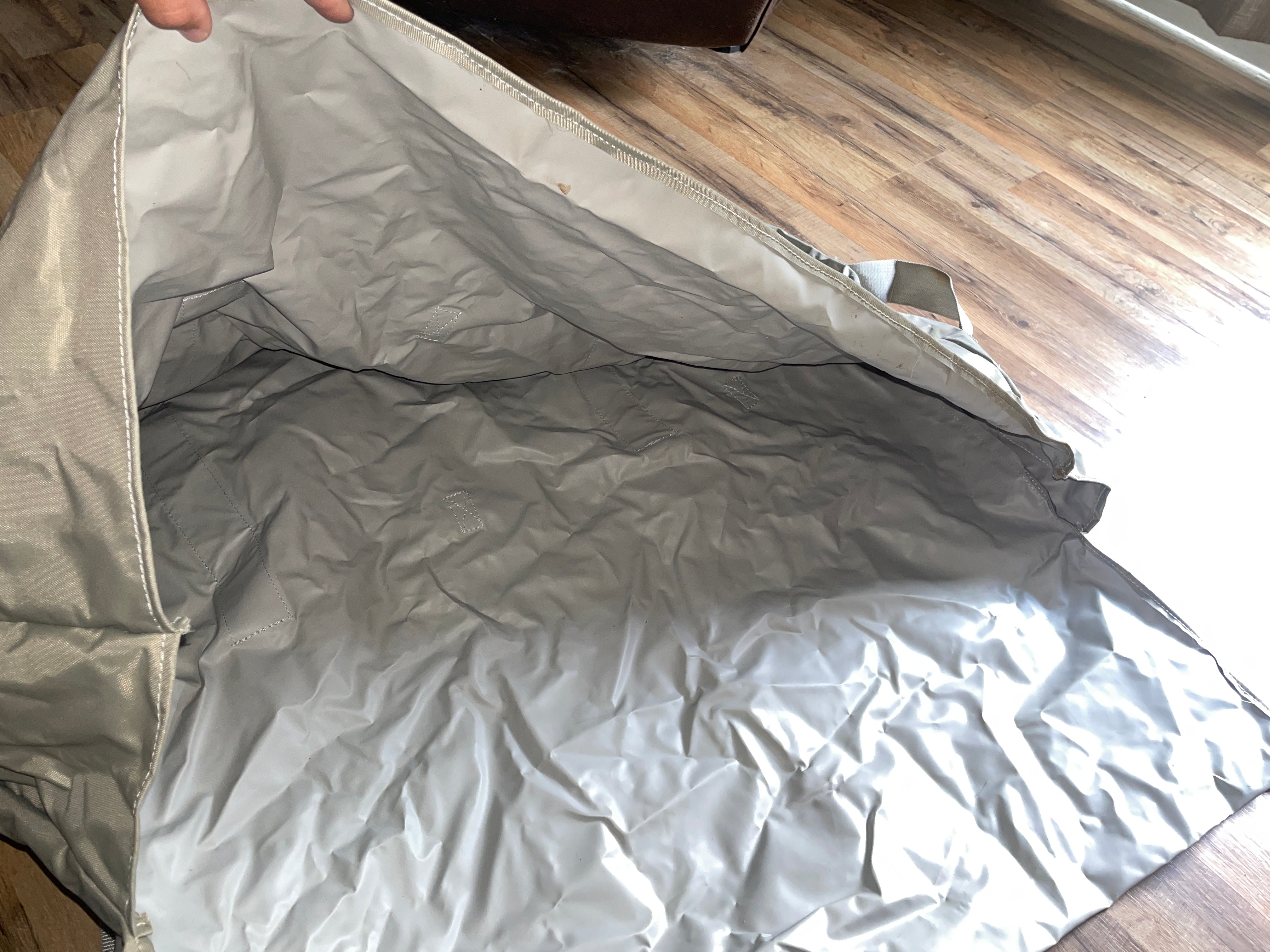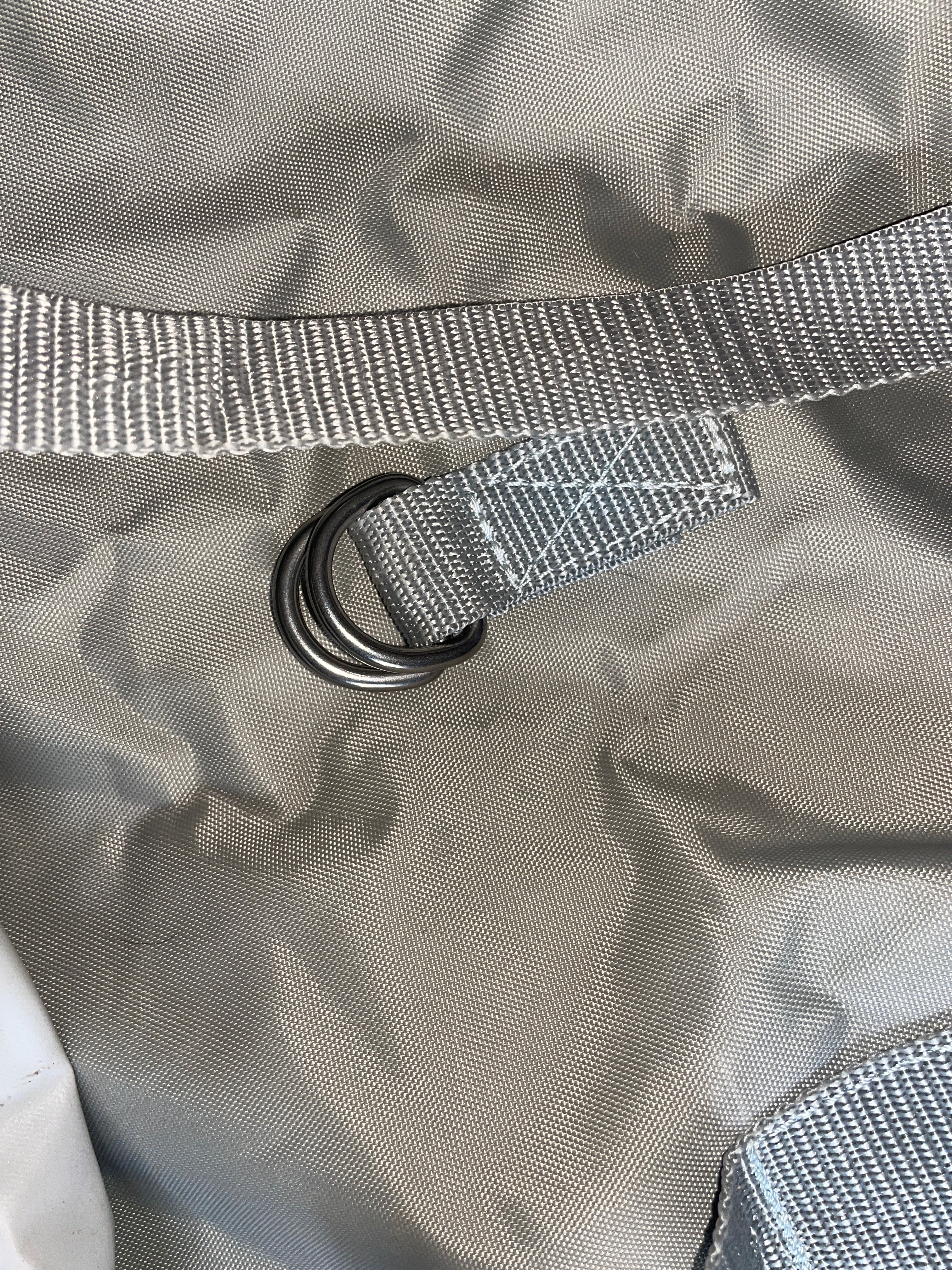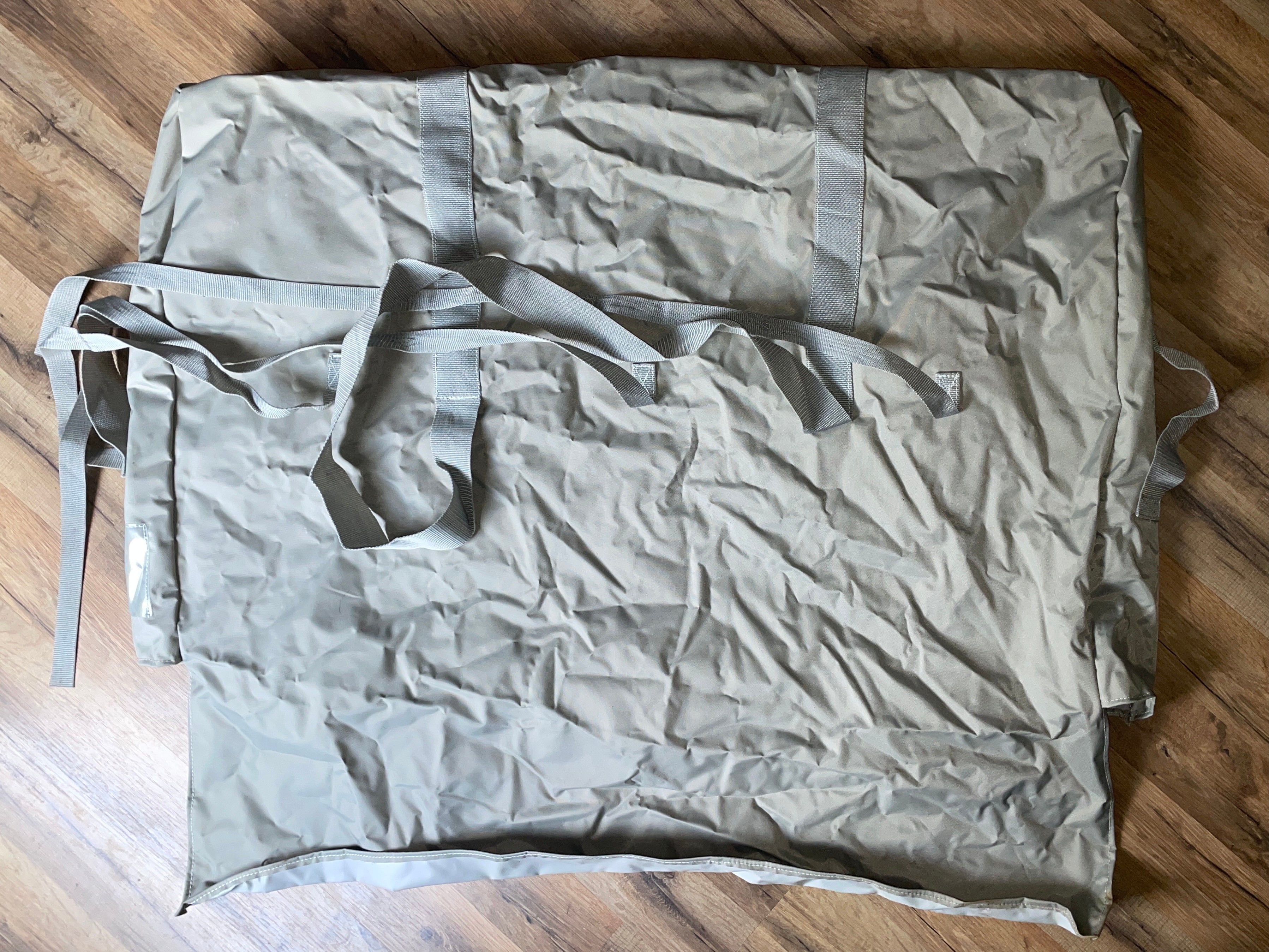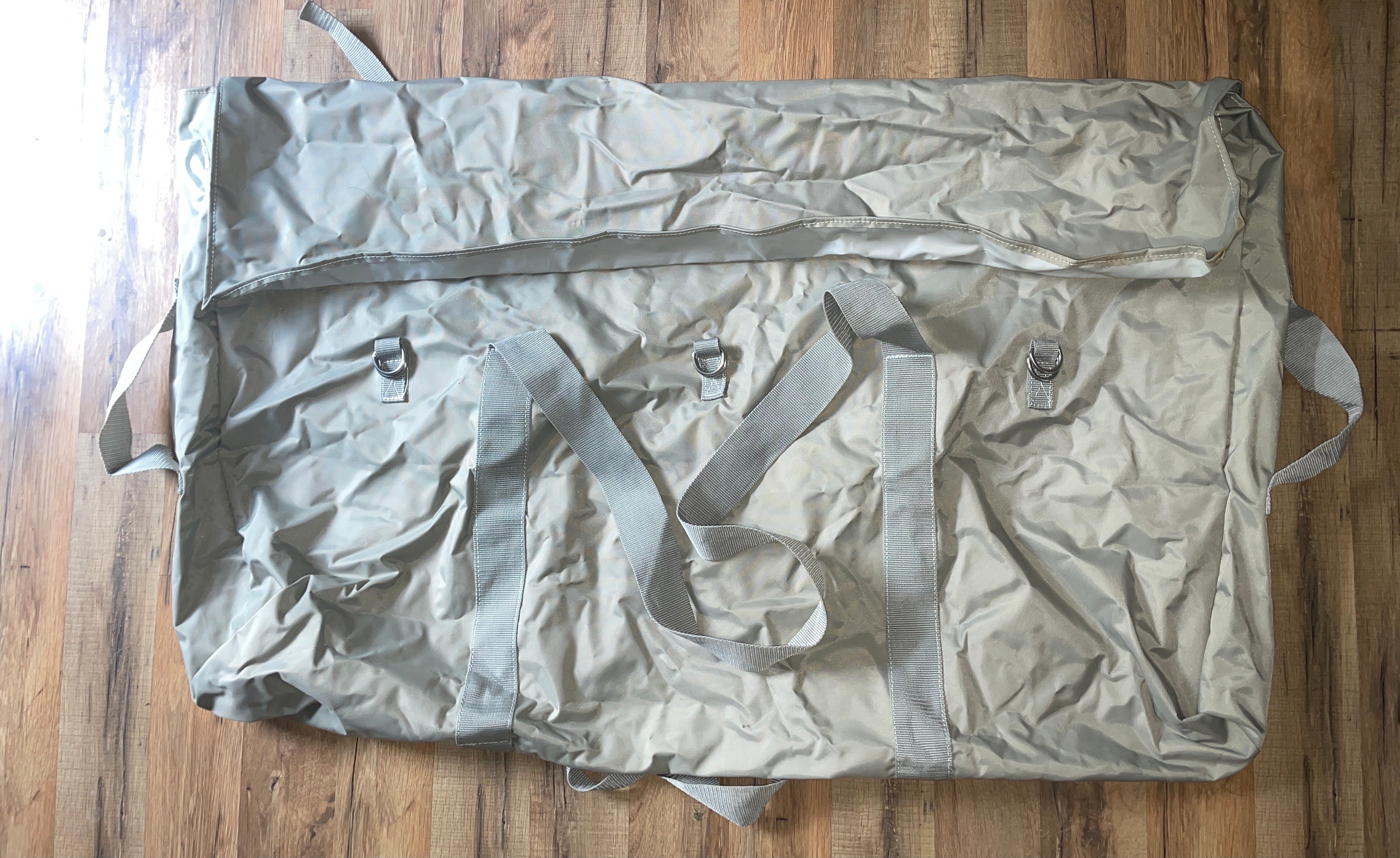 This heavy duty dinghy bag is in like new condition. It measures 40” long x 24” tall x 6” wide. Has handles on both sides as well as the bottom. Closes by 3 straps that fold over and secure to the eyes on the front. Like new condition, does have a few dirty patches. Water resistant material.