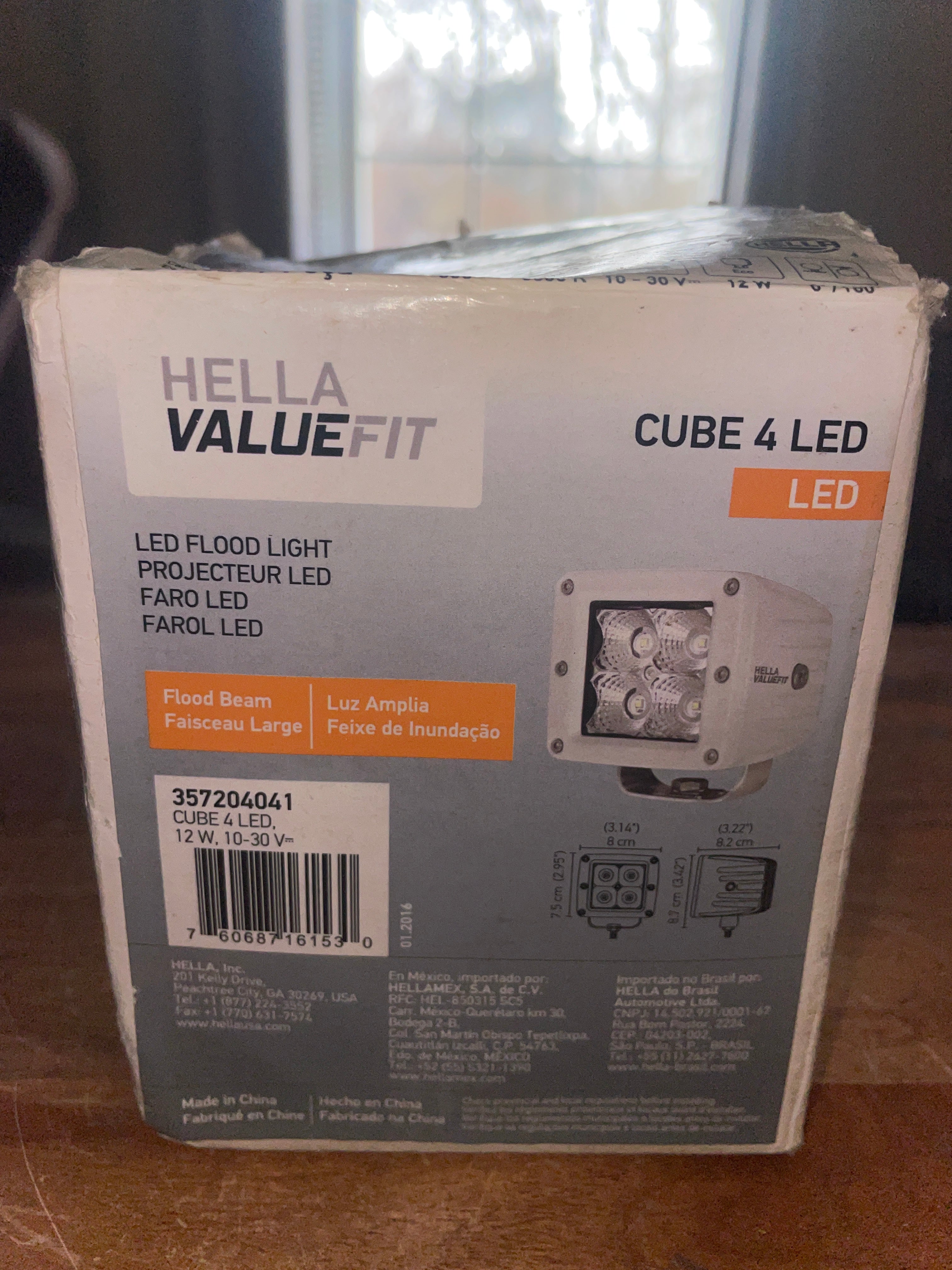 This brand new hella valuefit LED flood beam light is 12W 10-30V. White in color. It measures 8.7cm tall x 8.2cm deep x 8cm wide. Has the one cord that is attached, requires another for full function. DO NOT HAVE THE INSRUCTIONS.