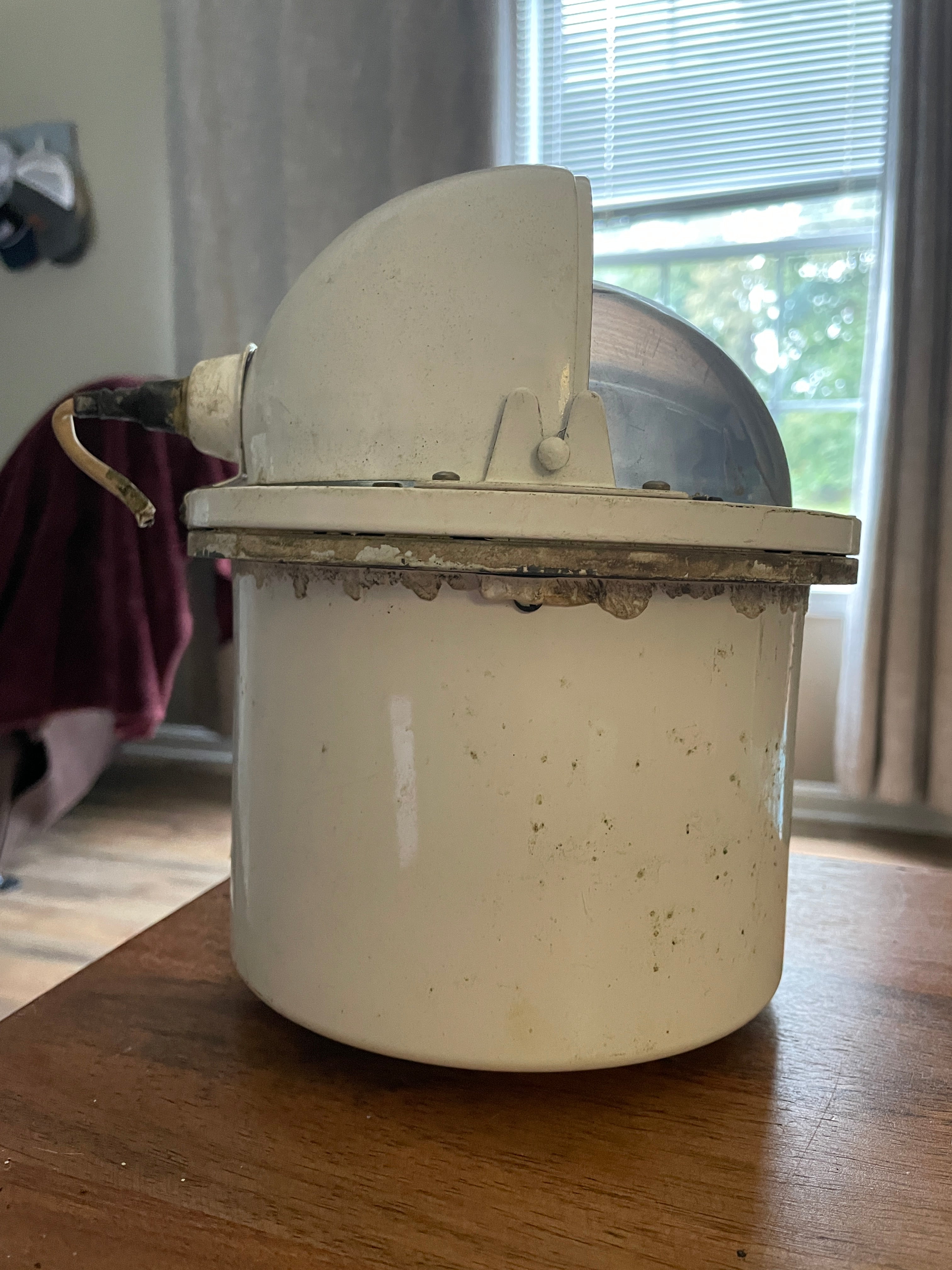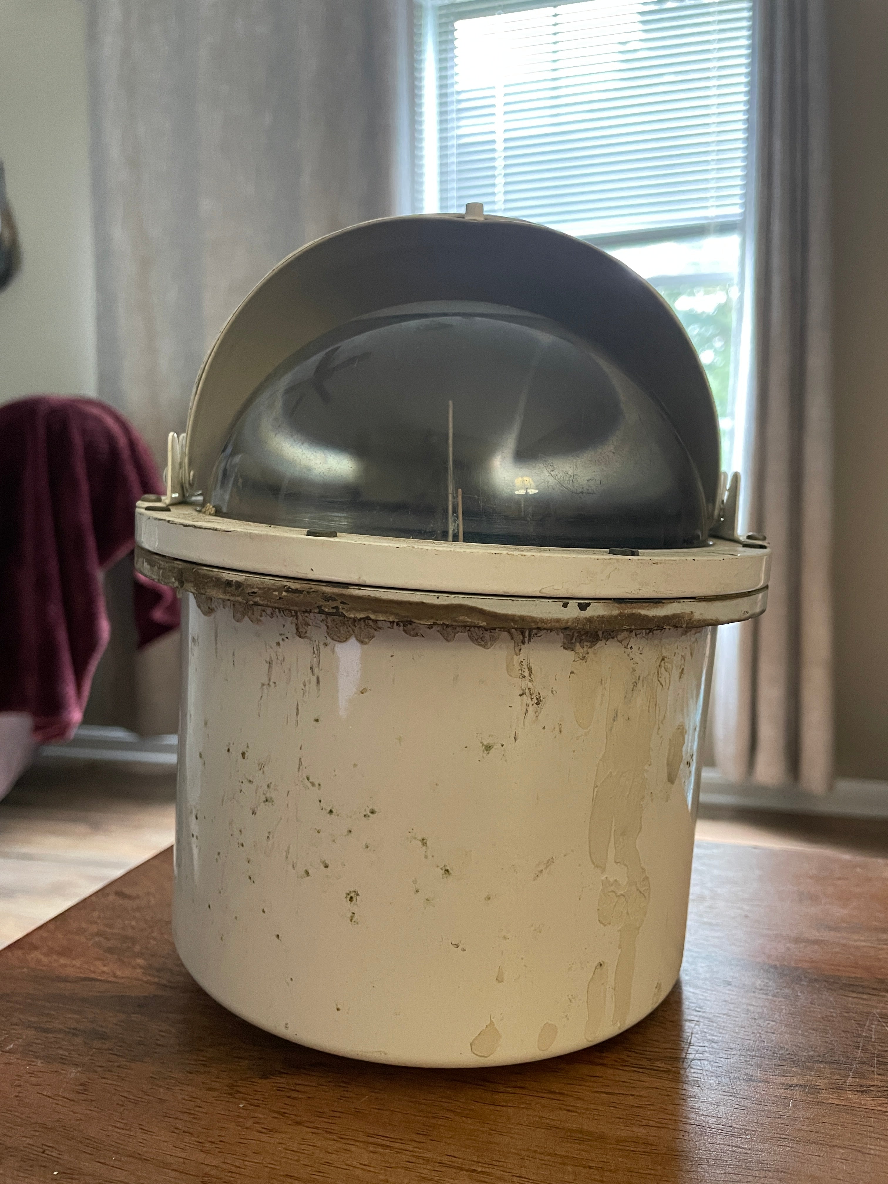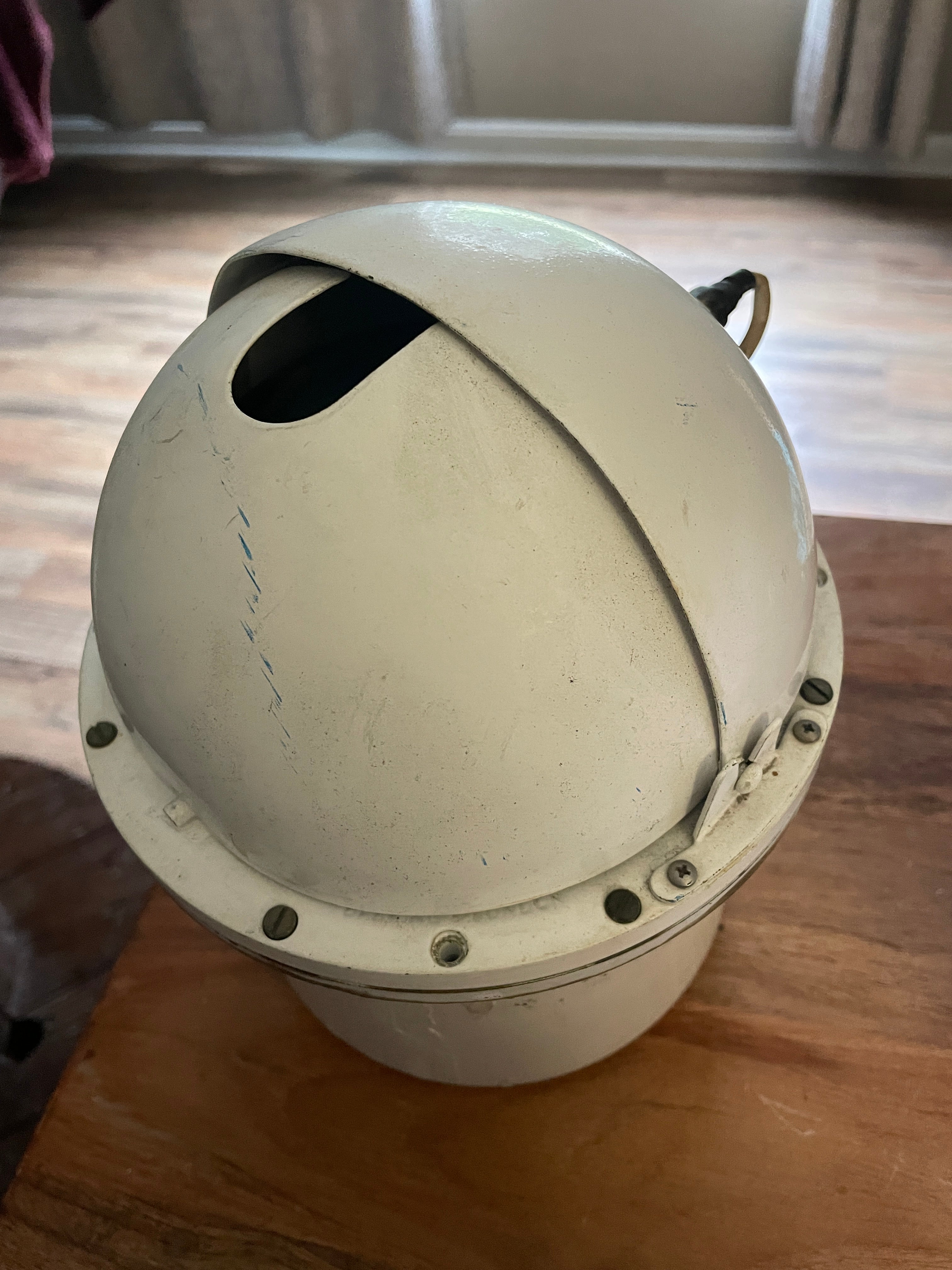 This compass in housing is in great condition. Although hard to read the housing says the following - Henry Browne & Son NO. 8530IV Trade Sesrel Mark Barking & London. The compass is in good condition. It does have an air bubble at the top but compass works as should. This compass and housing stands 8 1/2” total height. The base of housing is 6” diameter. The overall diameter is 7”. This housing is heavy duty, it is all metal. Weighs around 10 pounds or so.