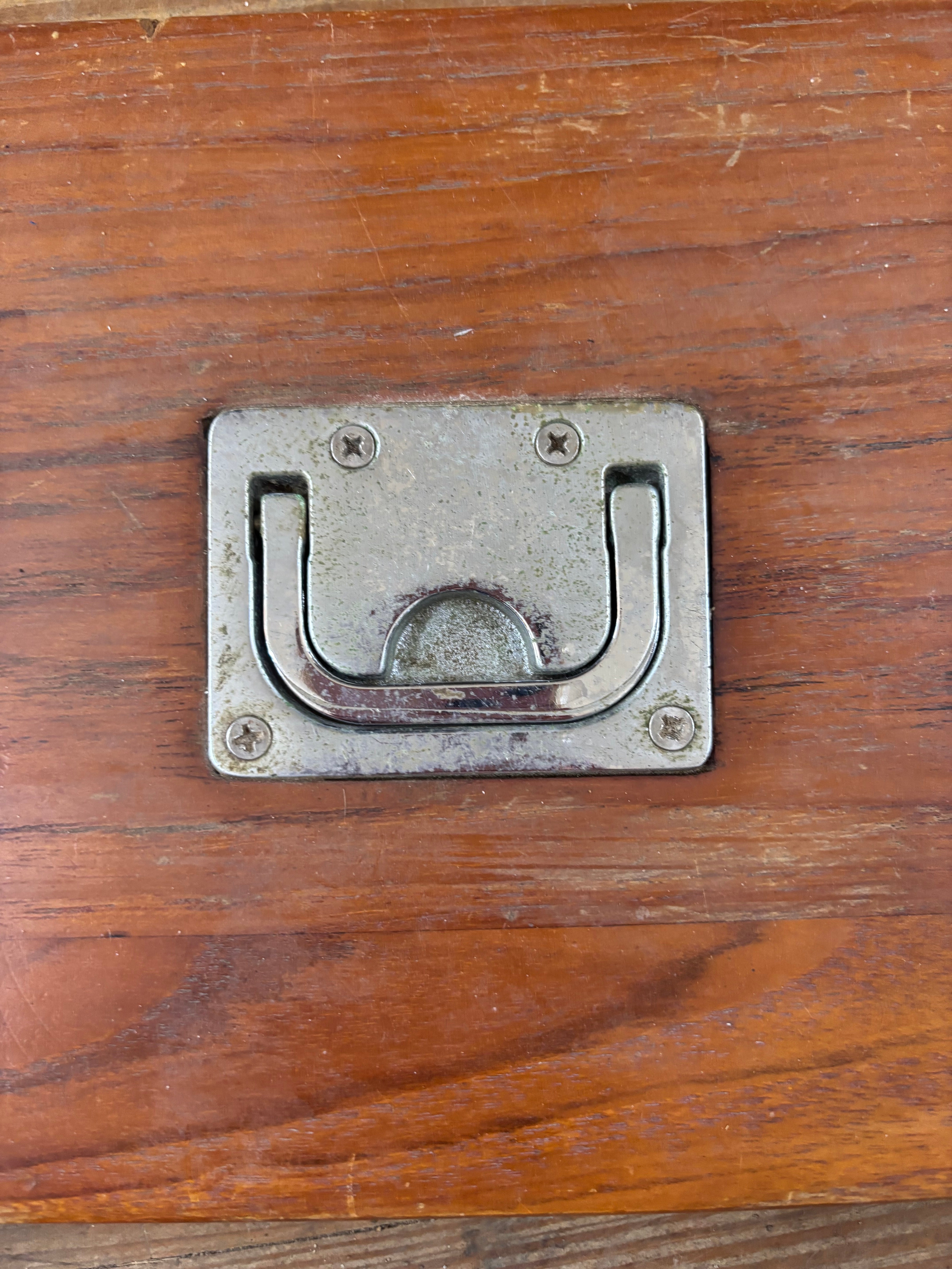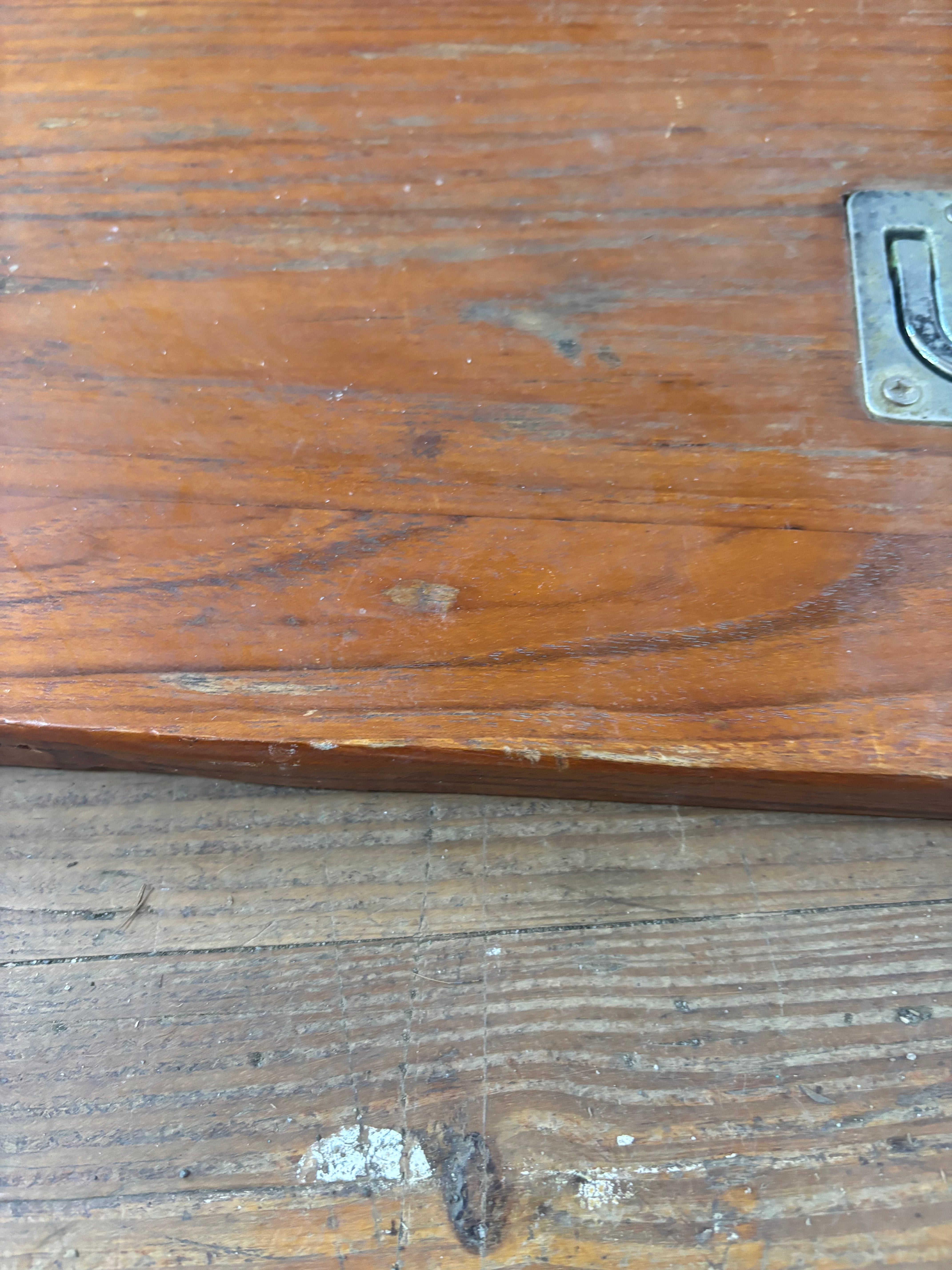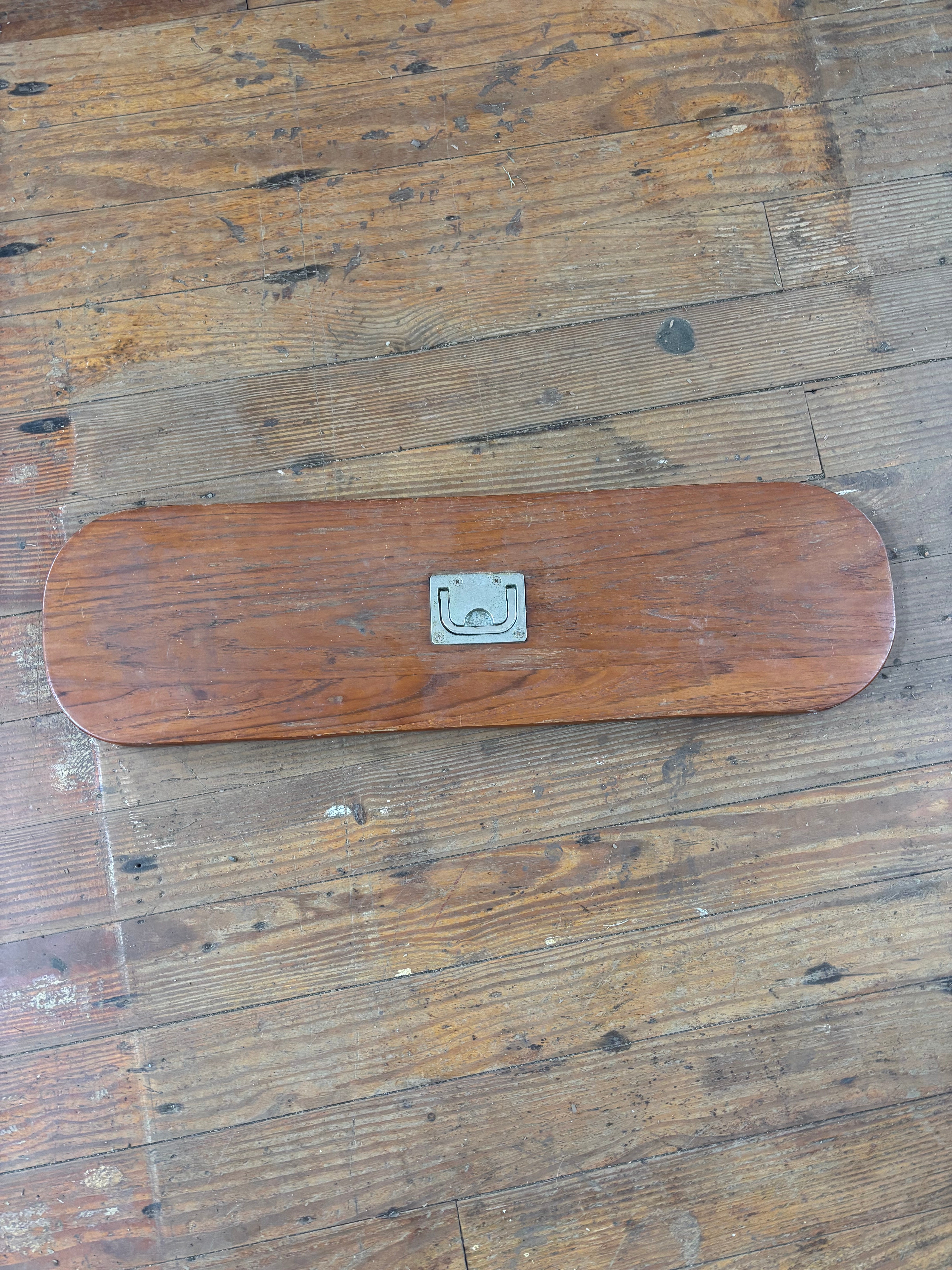 This interior floor hatch is in great condition, it has very minimal scratching. The hatch is 26 3/8” L x 7 3/8” W x 3/4” thick. It has a stainless steel hatch pull that works as it should.