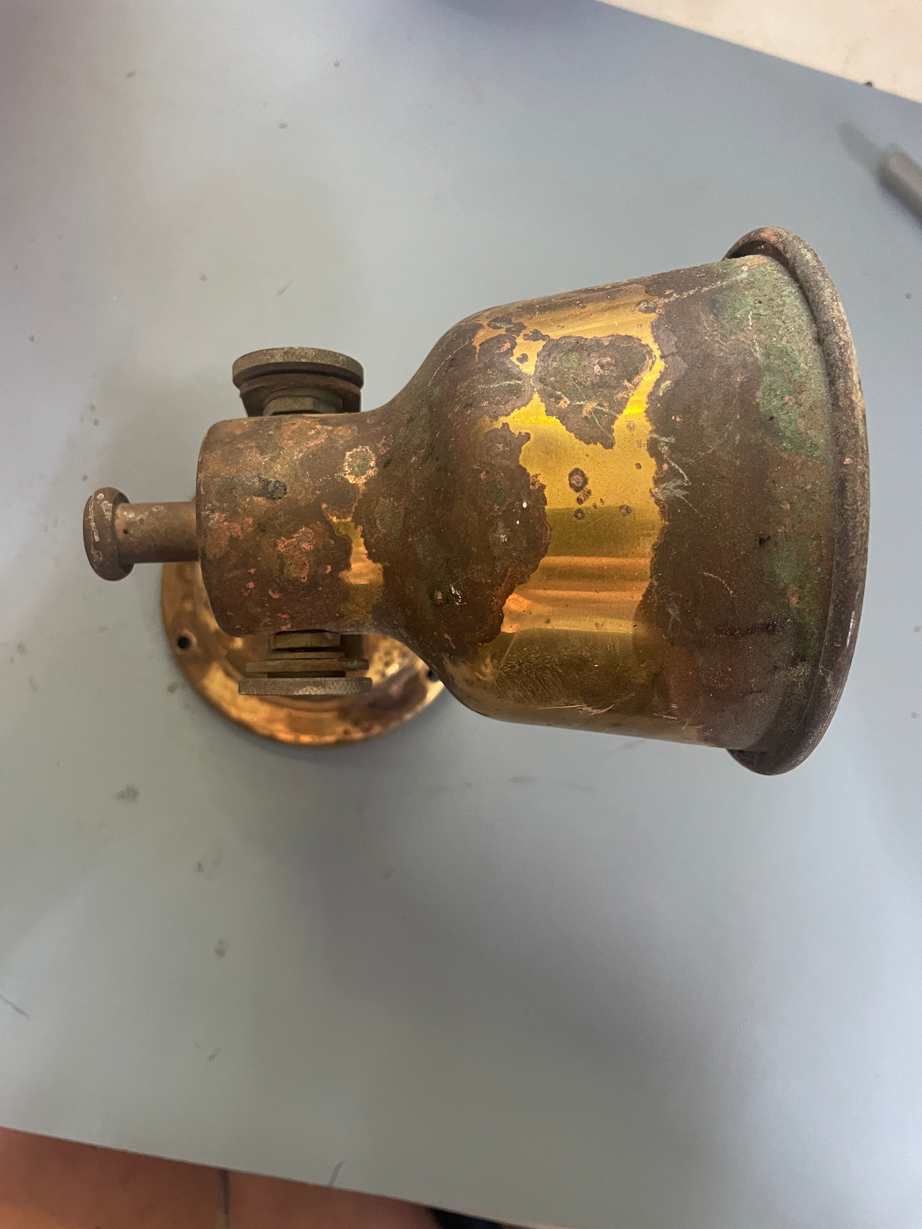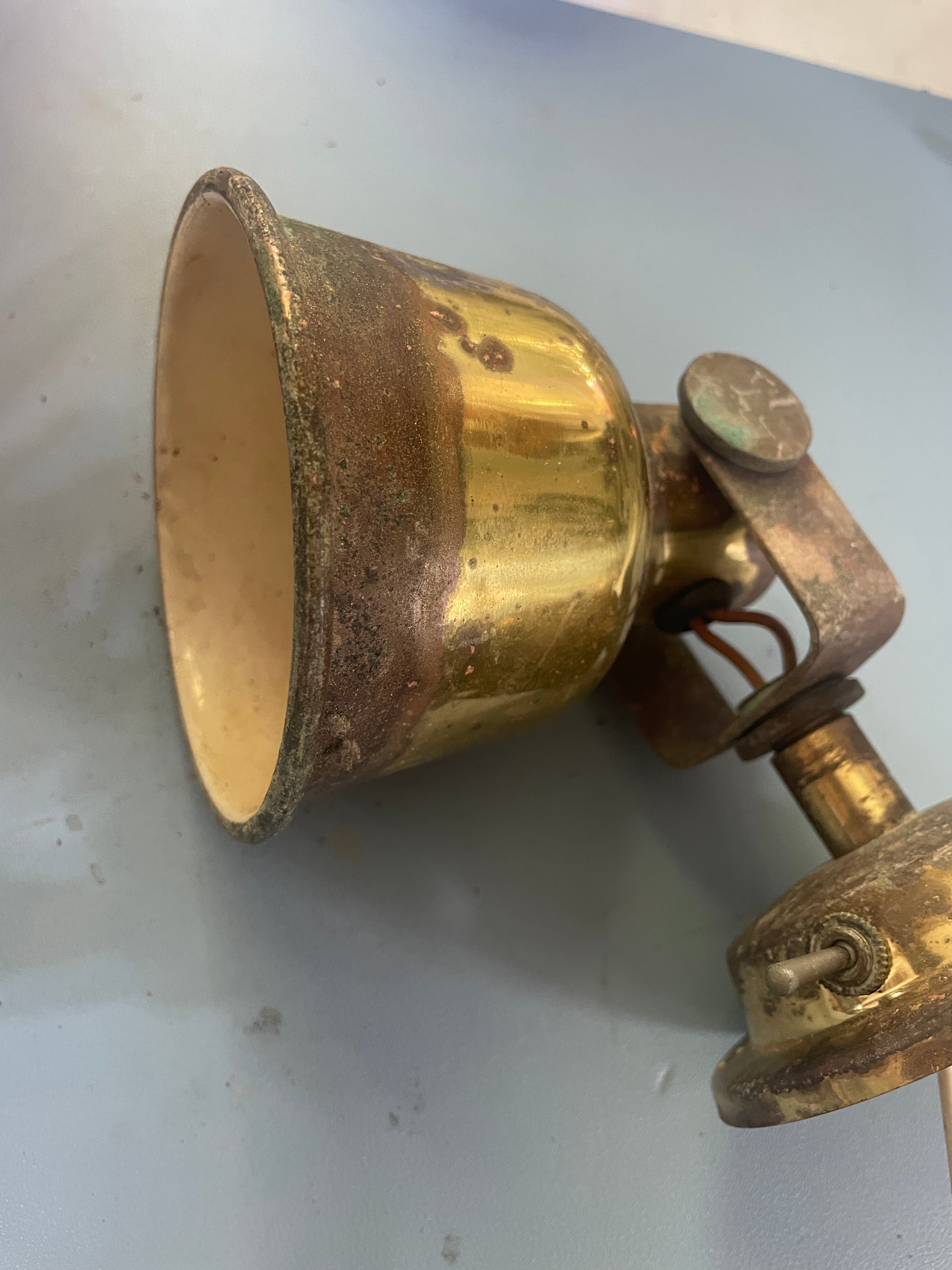 This brass interior tilting light is in fair condition. The wiring looks to be clean. The outside appearance of the light is pretty badly pitted. May clean up some. Selling as is. There is a switch on the front for turning on/off.