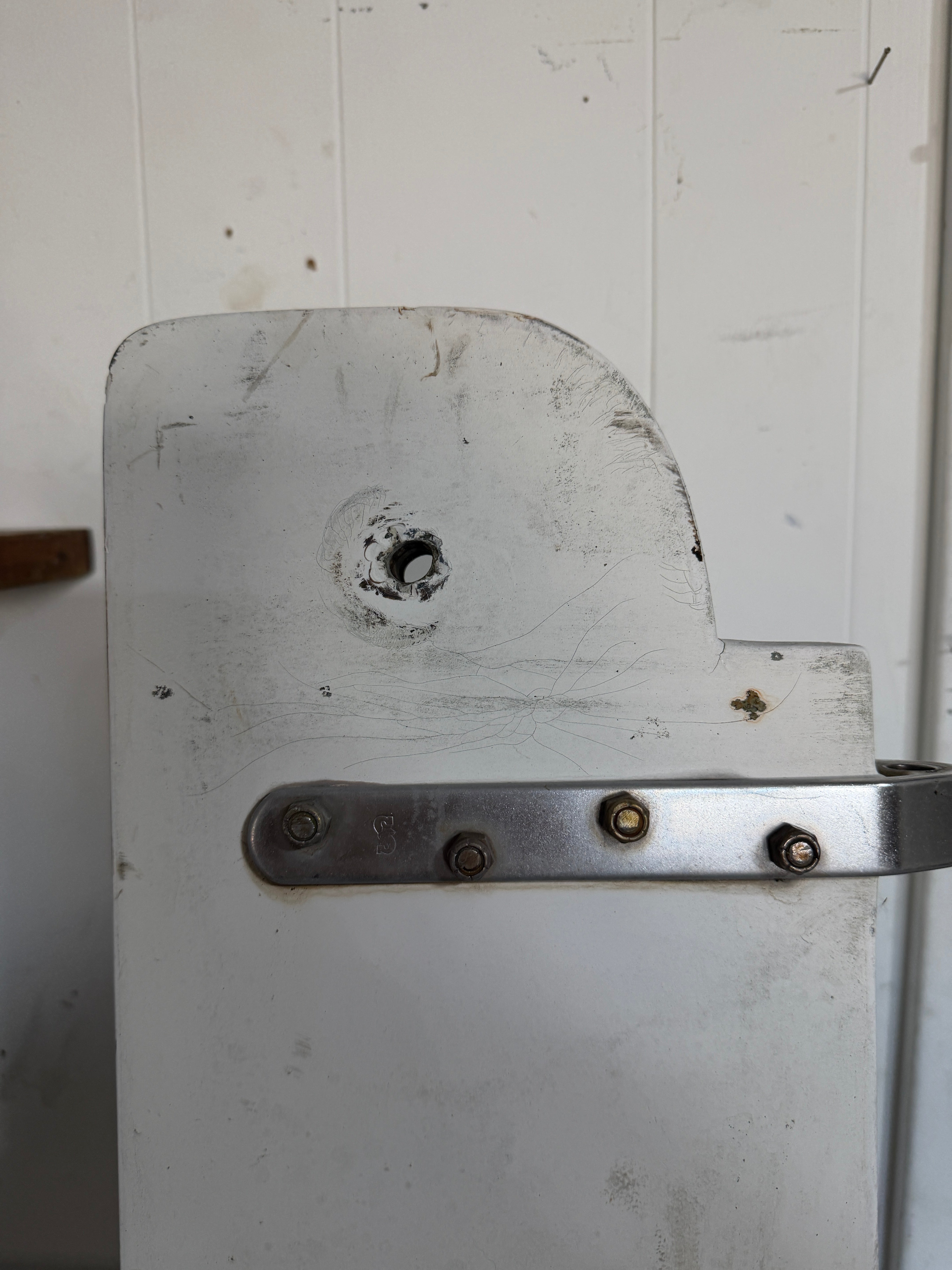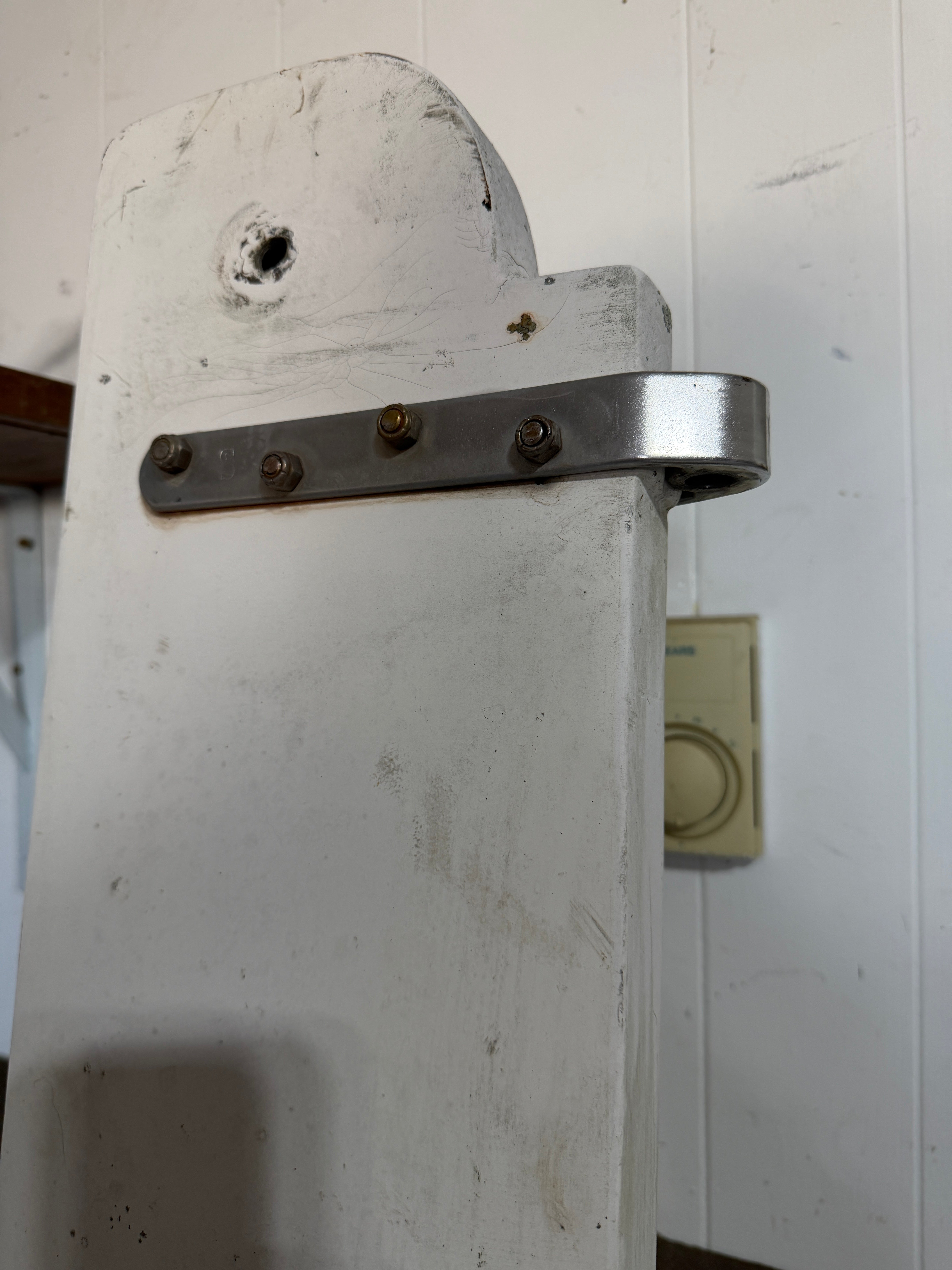This J24 rudder is in great condition. It is 60" to the area right over the pintle. It is 63 3/4" total height. The max width is 12". The middle width is 8 3/16" and the minimum width is 6 1/2". The pintles are schaefer and stainless steel. They are 8" in length and need a 1/2" diameter pin. The fiberglass is overall in good condition. The only areas where it is cracking is the top most pin area. That pin is 1/2" diameter.