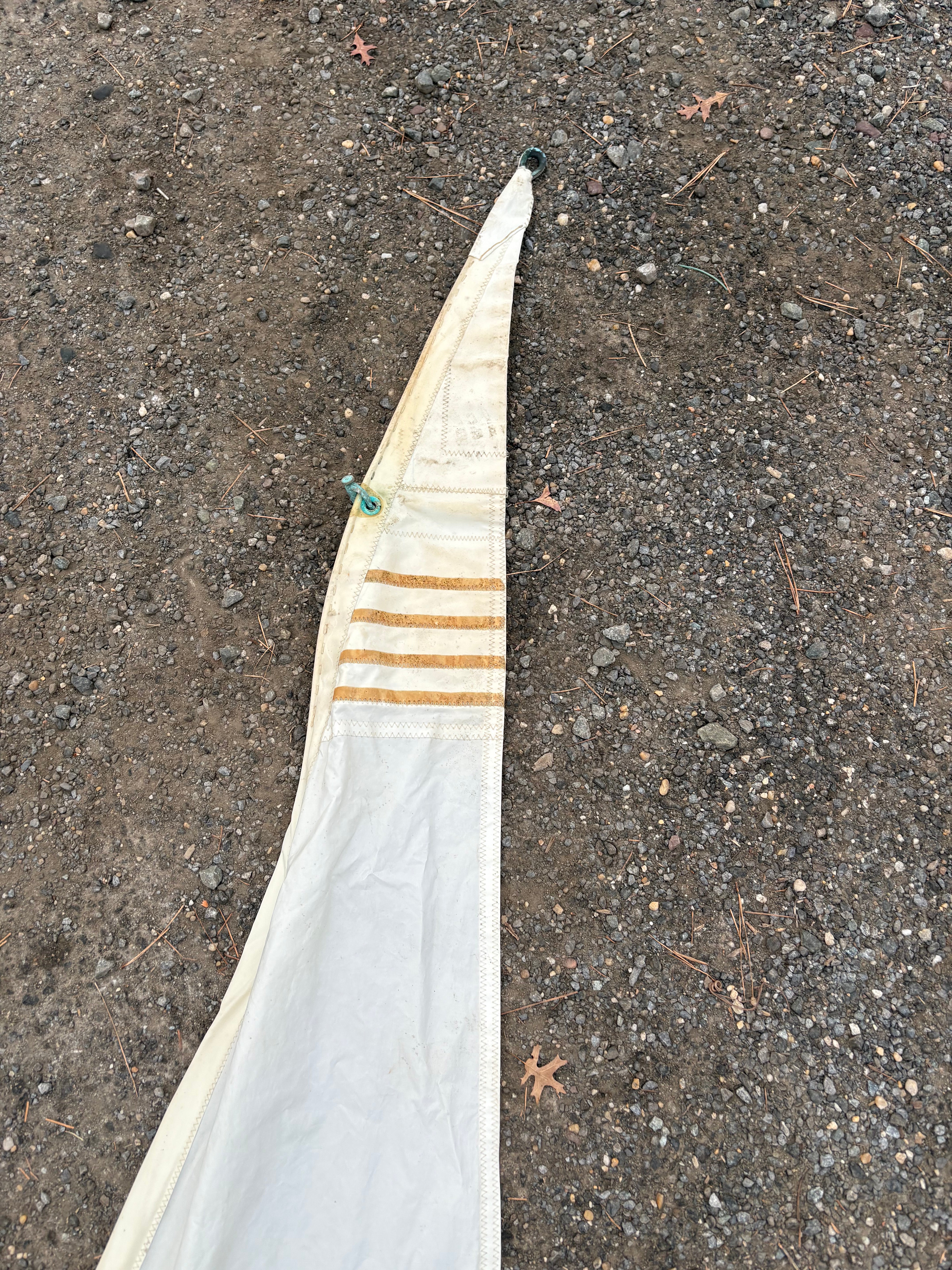 This is a jib sail. It measures 27' on the side with the bronze hank jib hooks. The other side is 23'6" and the foot is 9'8". Overall good condition. No rips or tears just dirty and would clean up well. The "striping" you see on the corners is not sticky and looks to just be coloration they added to some of the stitching areas. Will come with the bag. Unknown what this boat was removed from.