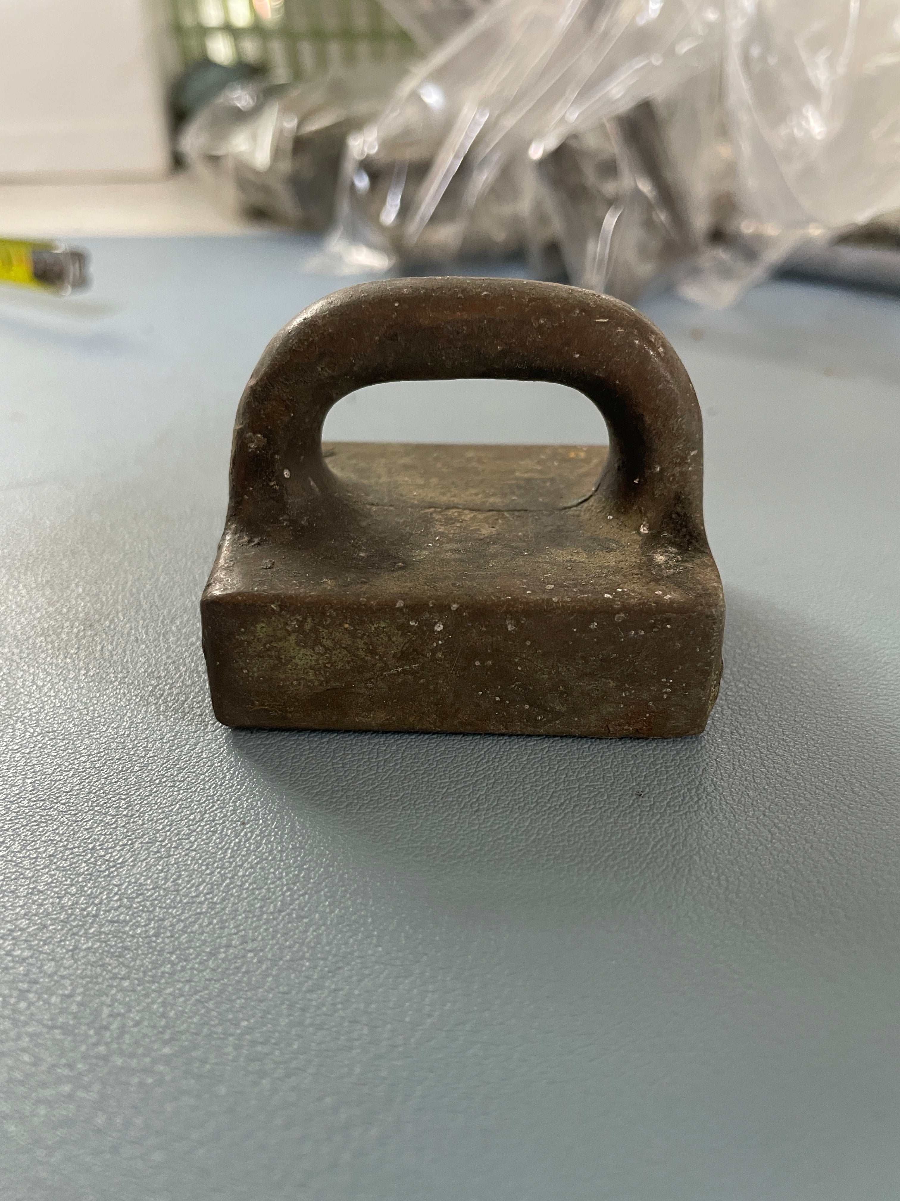 This large bronze track car is in good condition. It fits on a 1 1/4" track. The eye of the car is 1 1/4" x 1/2". The track car length is 2 1/8" long x 1 3/4" tall.