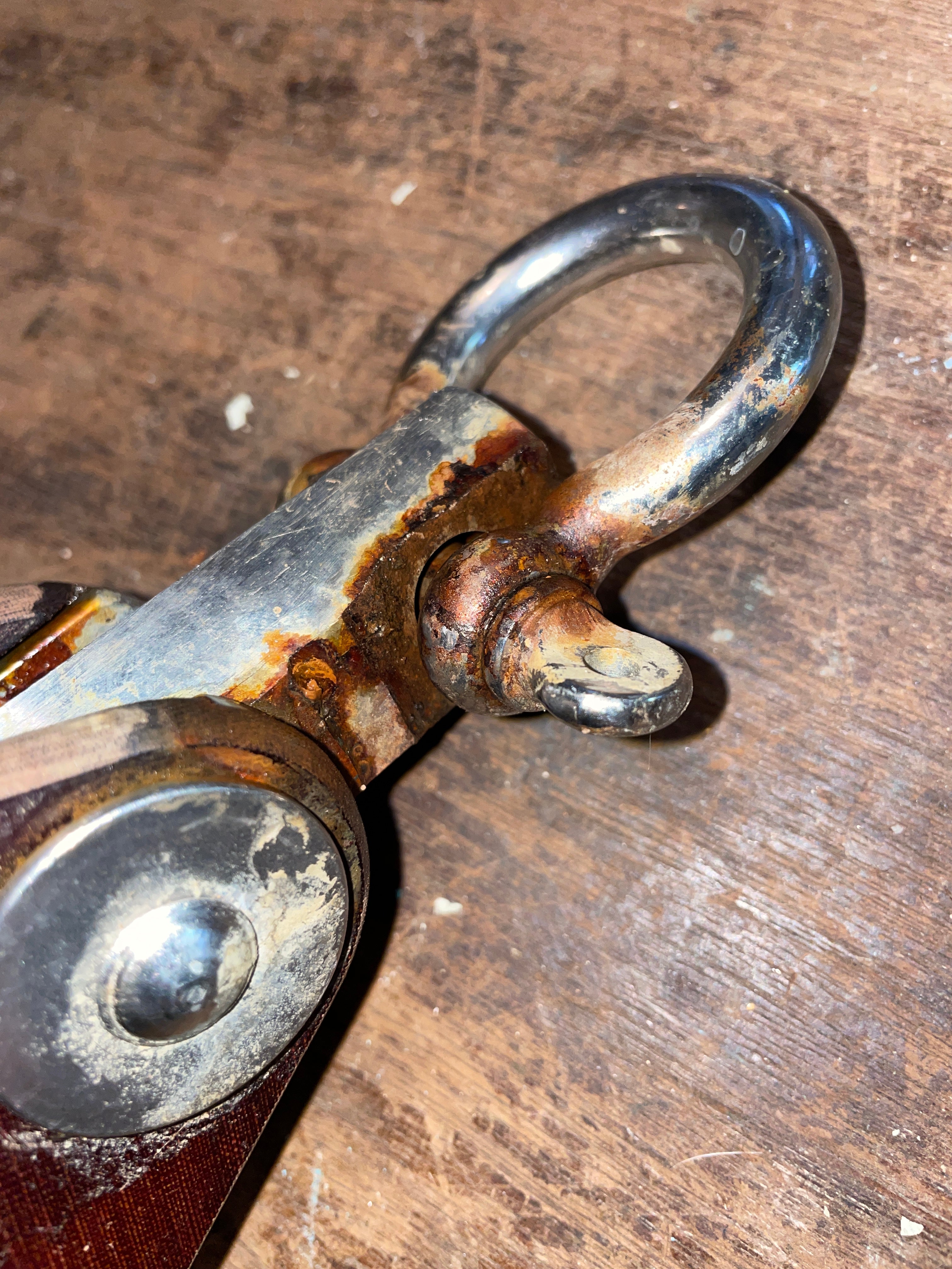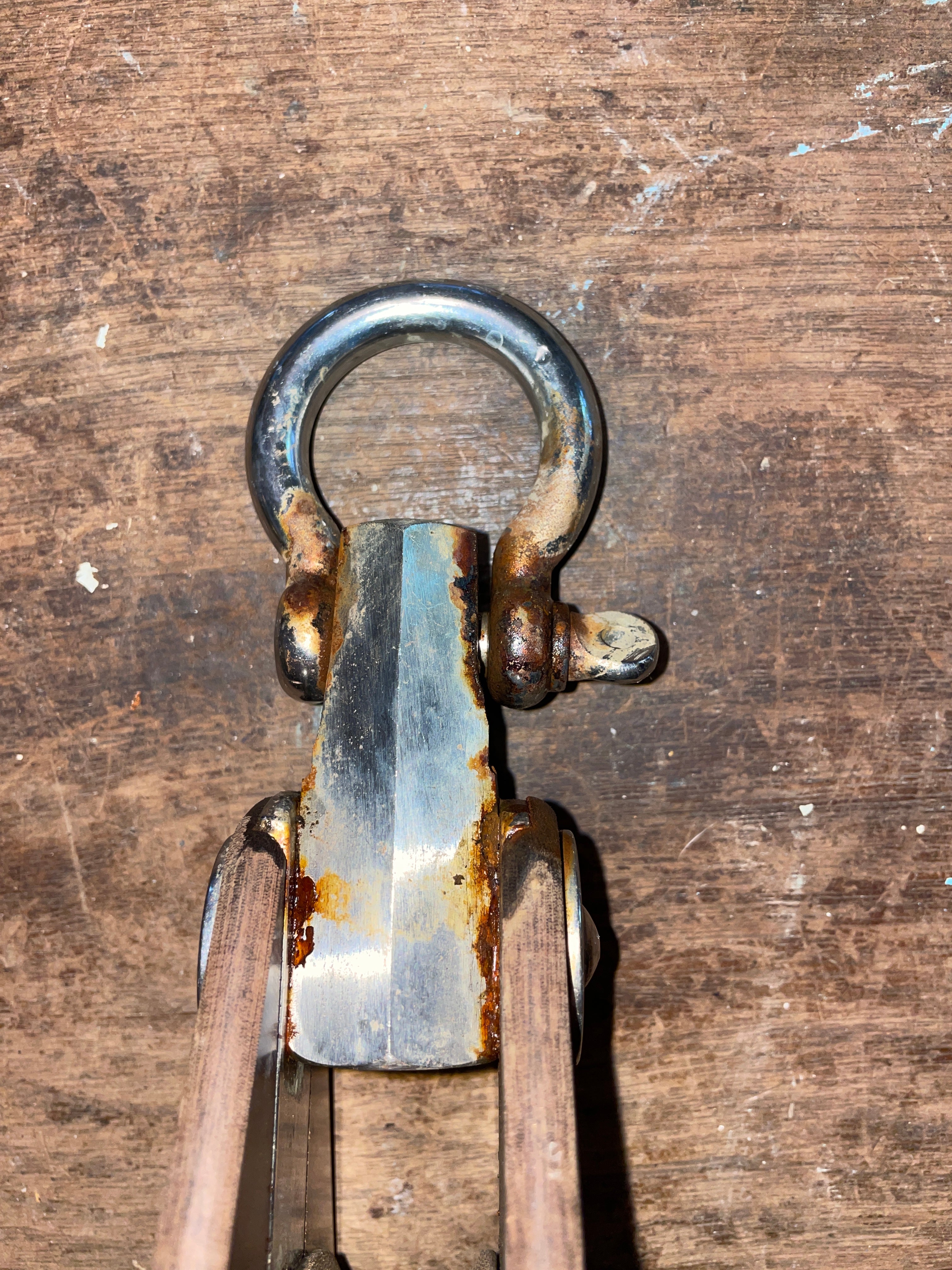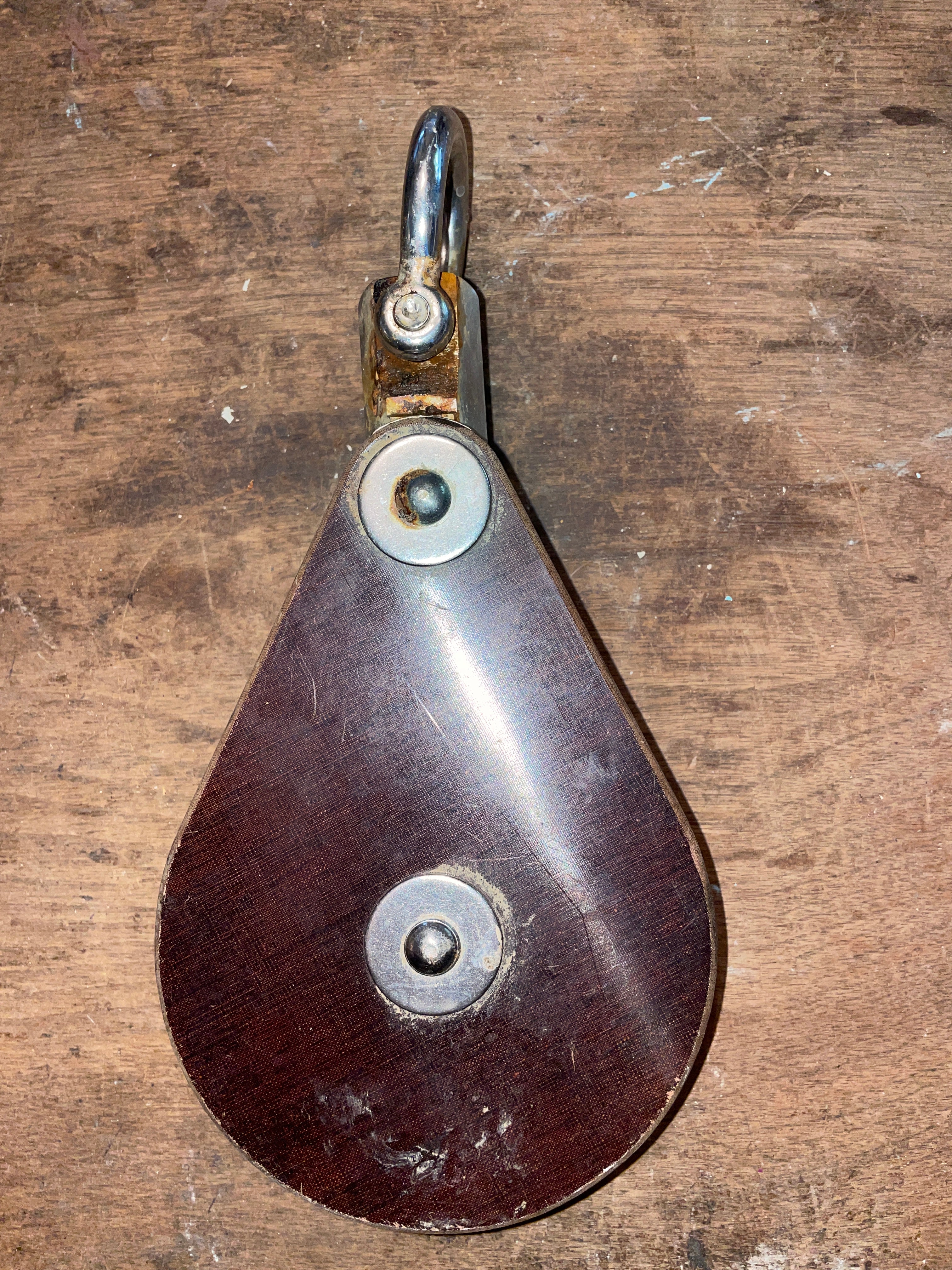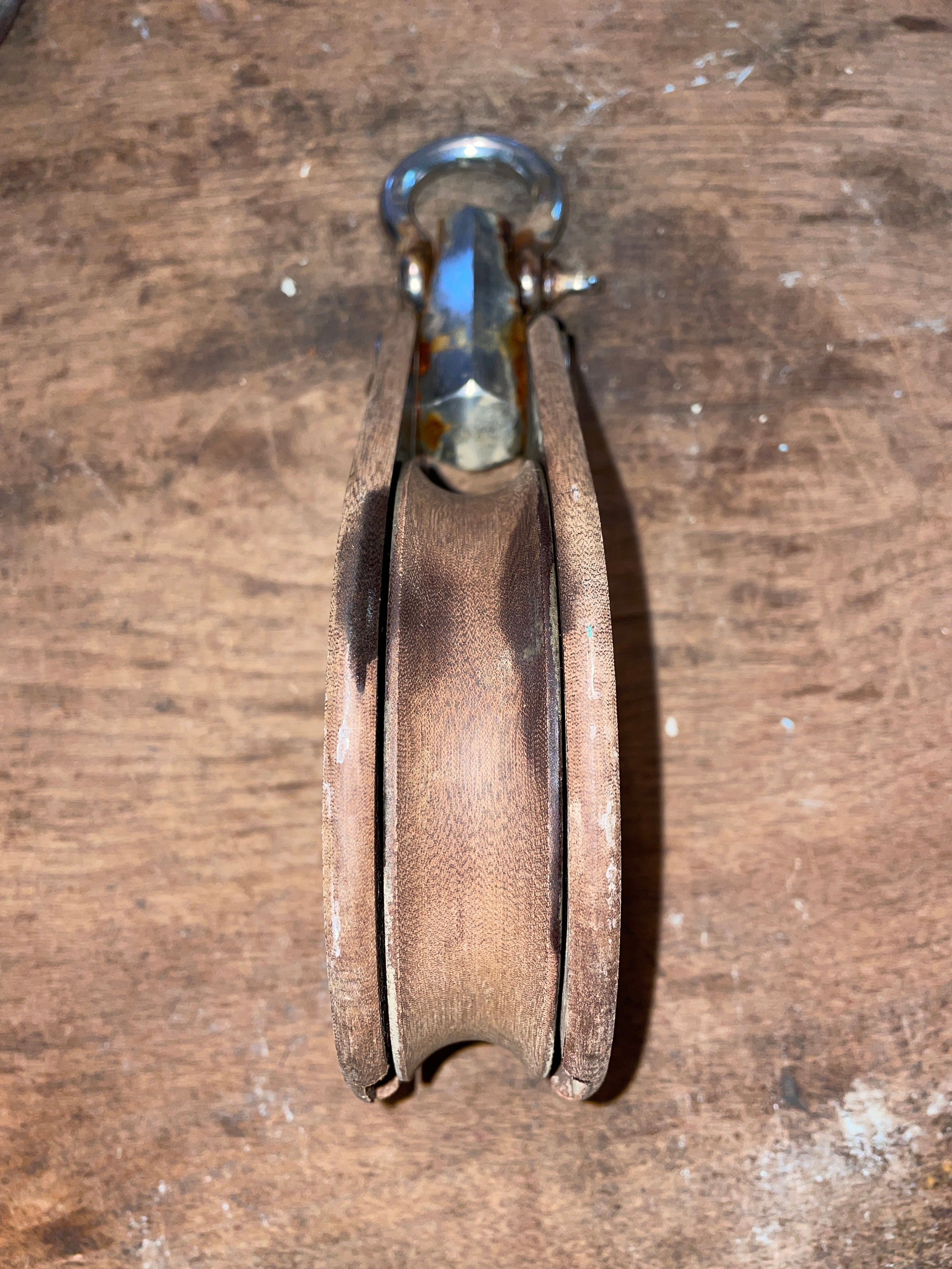 This large faux wood single block is in good condition. It is rusty at the top around the shackle but it is solid and just cosmetic. Comes with a large SS shackle. The sheave is 5” and can fit up to 13/16” line diameter. This block is 10 1/2” long including the shackle.