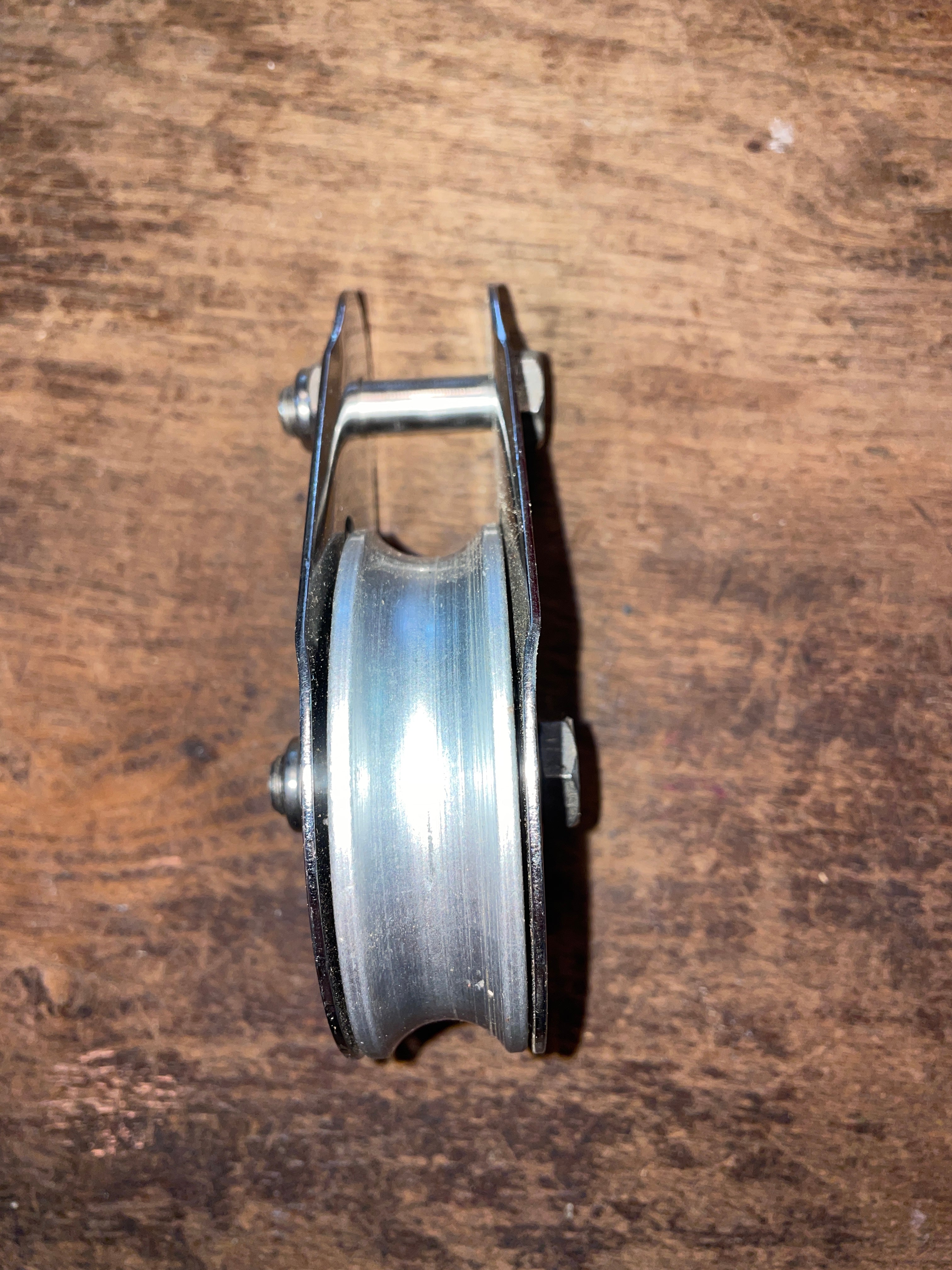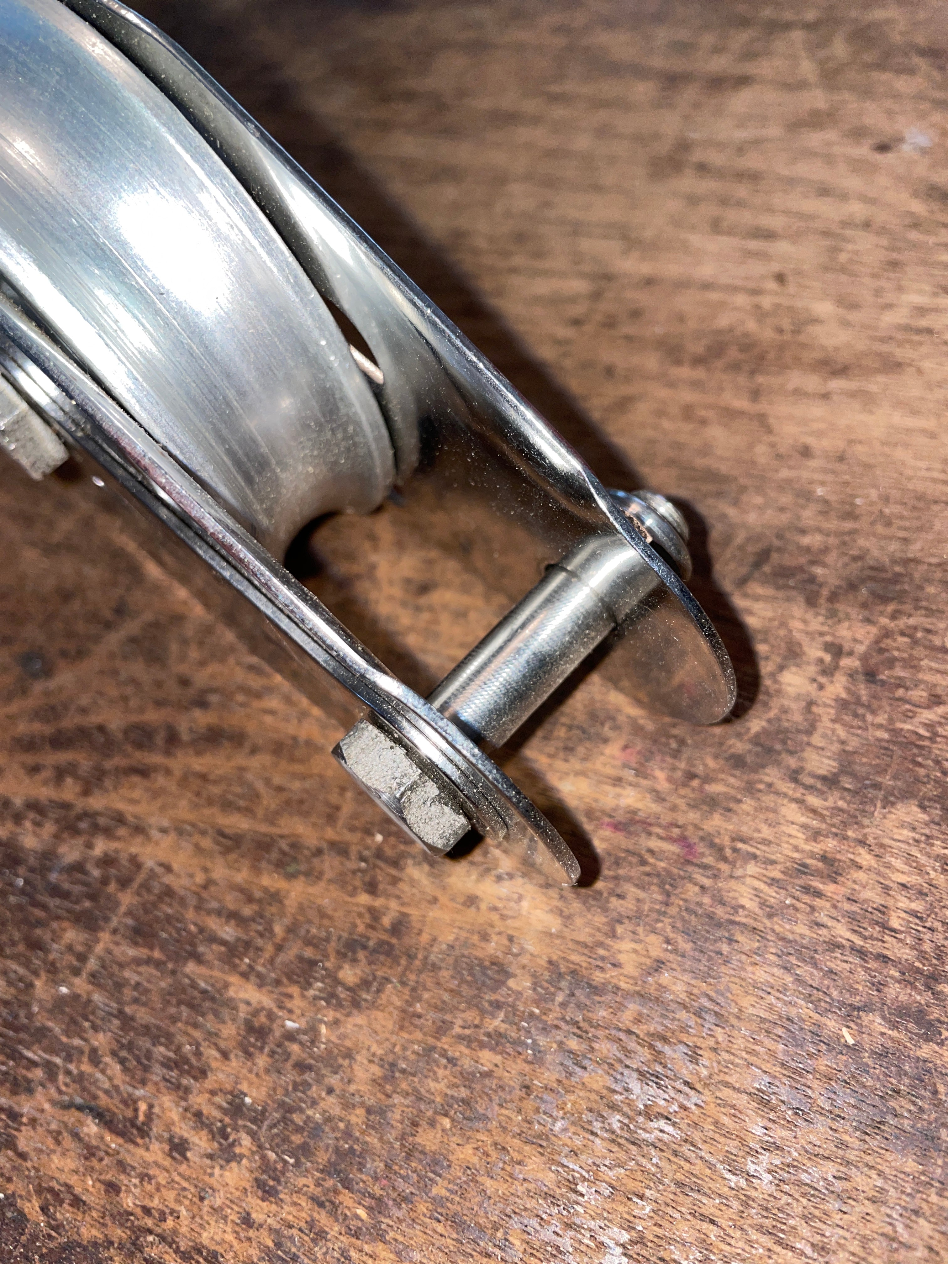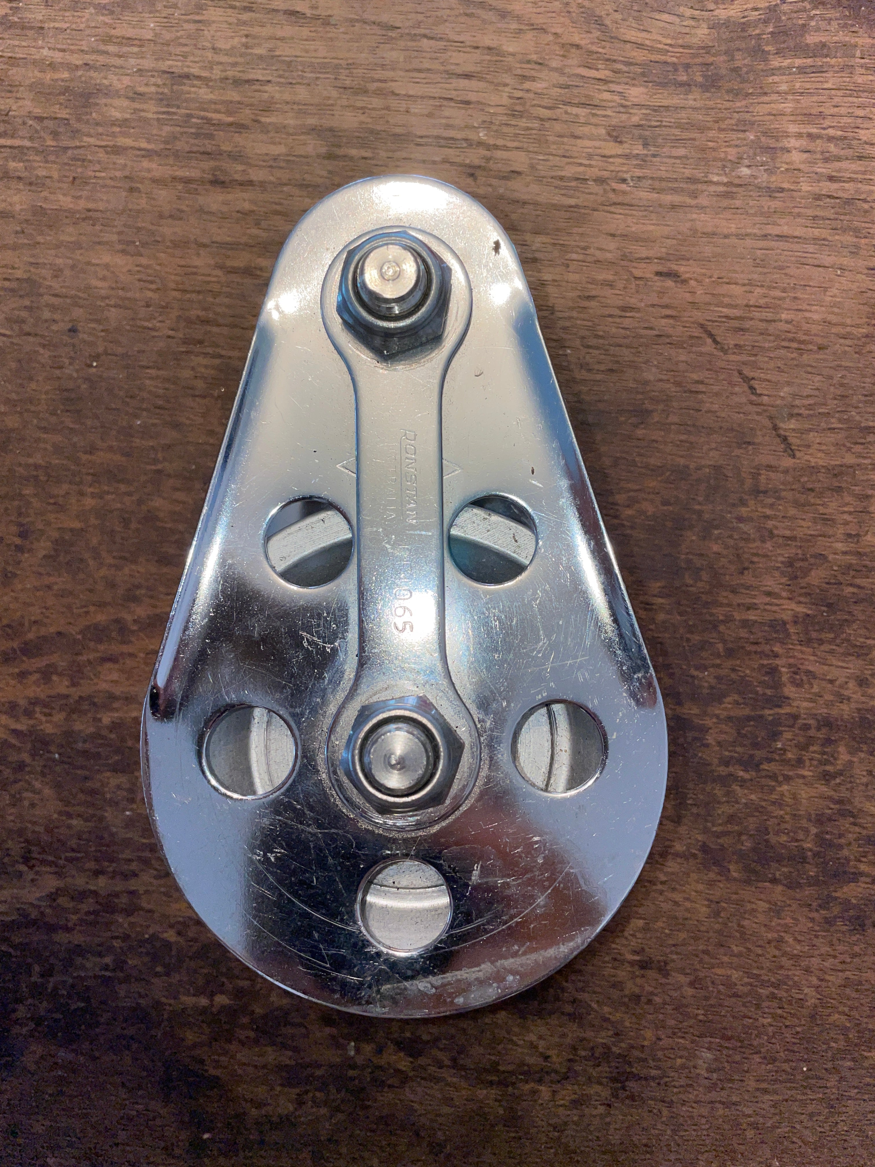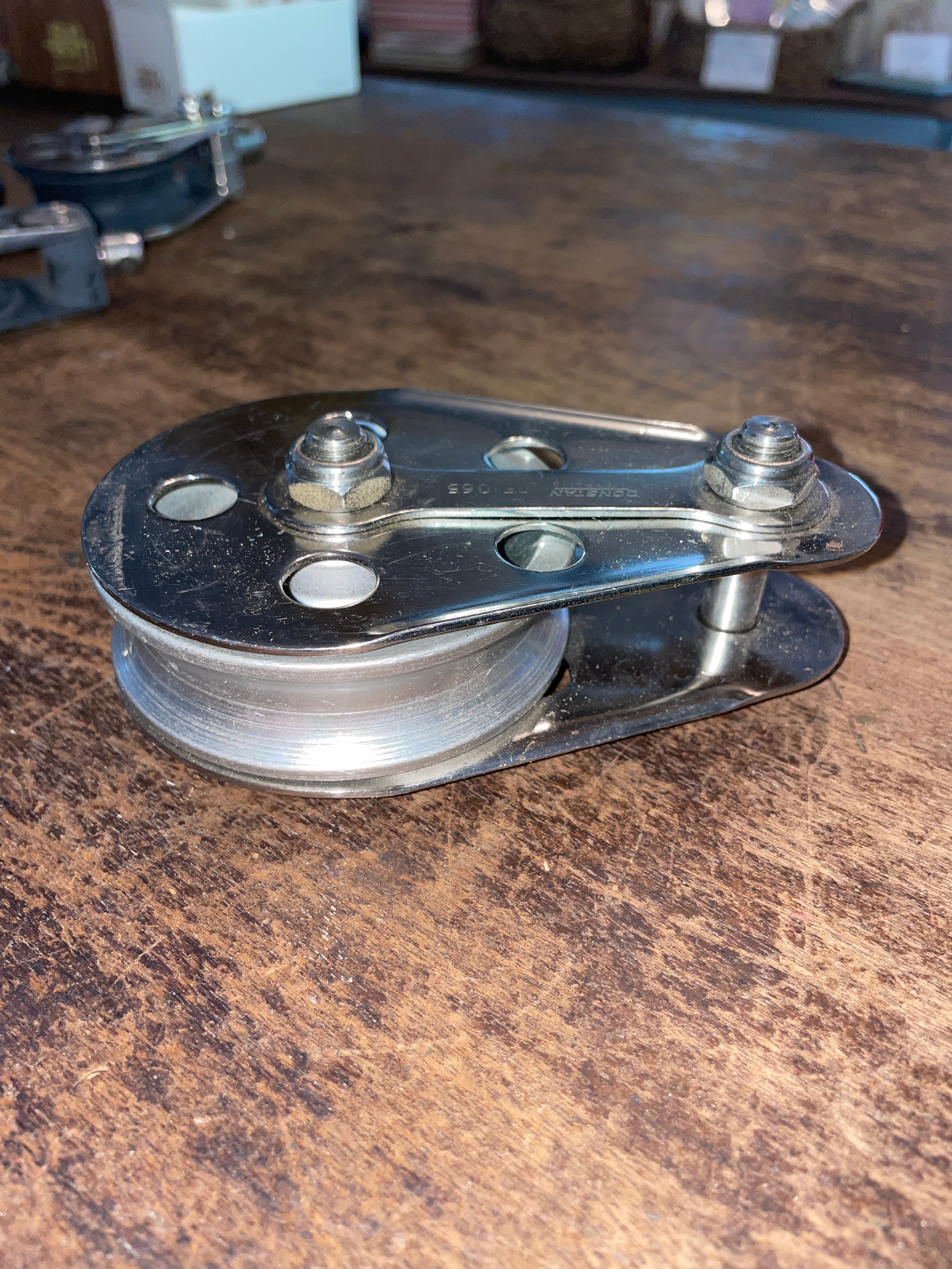 This large stainless steel Ronstan fixed single sheave block is in great condition. The sheave is 3” and can fit up to 9/16” line diameter. Total length of block is 4 7/8”. Width between fixed bolt is 7/8”.