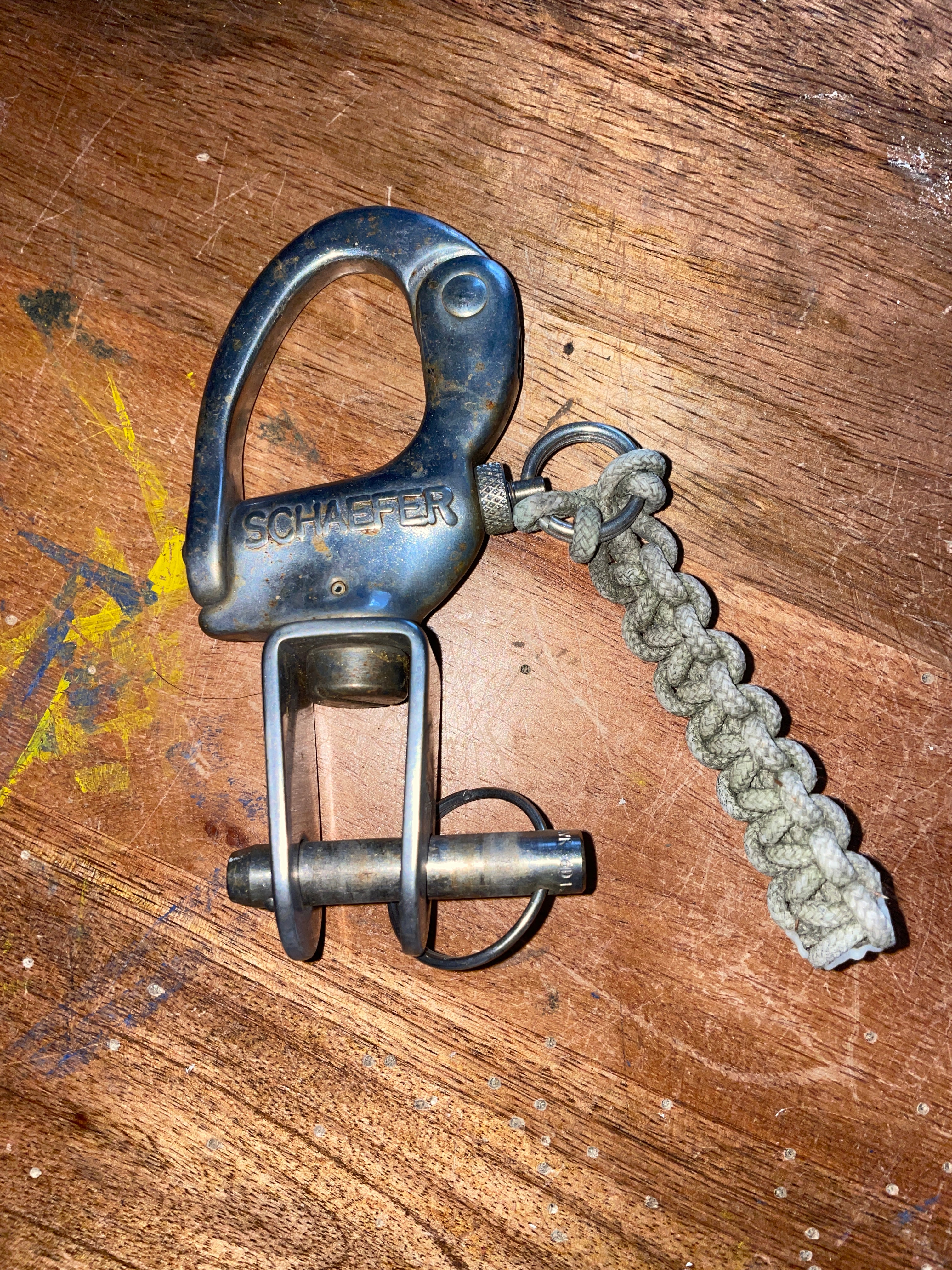 This large stainless steel Schaefer shackle is in good condition. This shackle is 5” total length. The forked swivel bail has a 9/16” width. We will include a pin however it is not the correct length. Very nice braided pull.