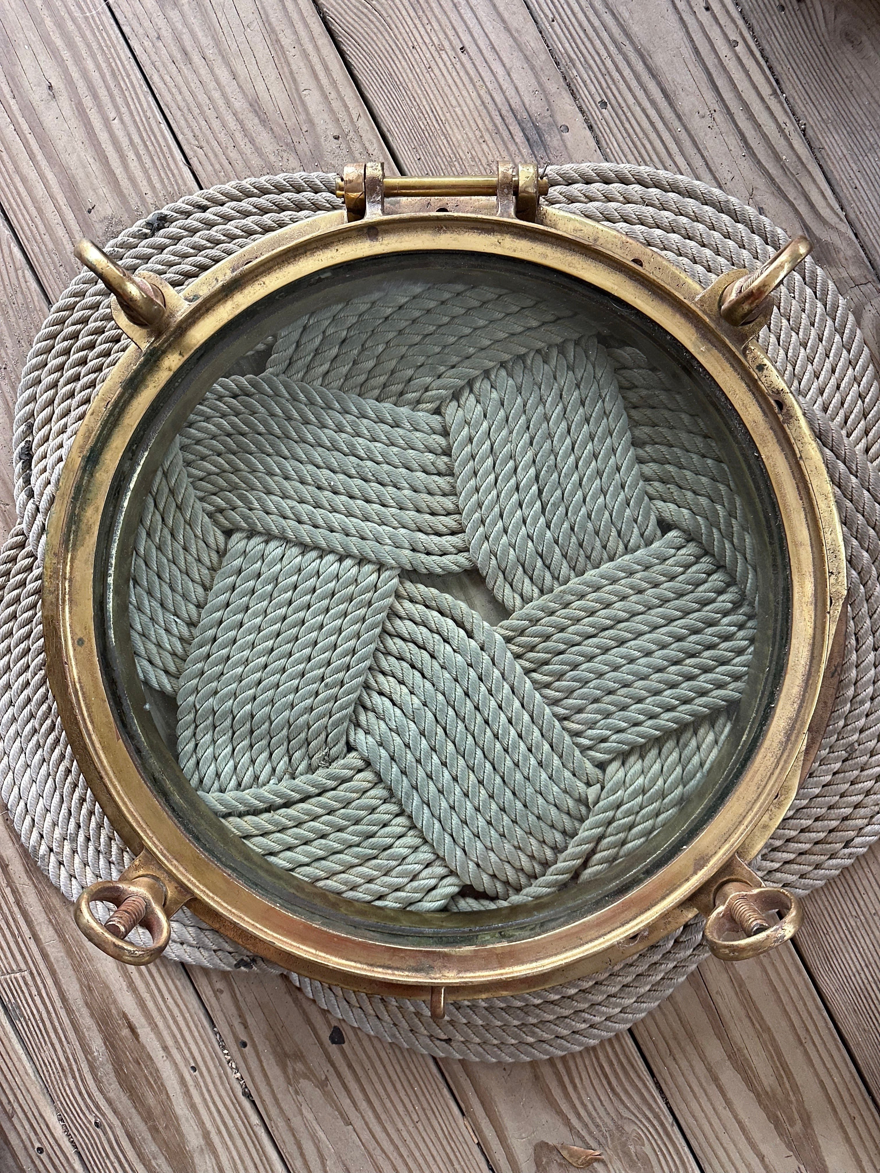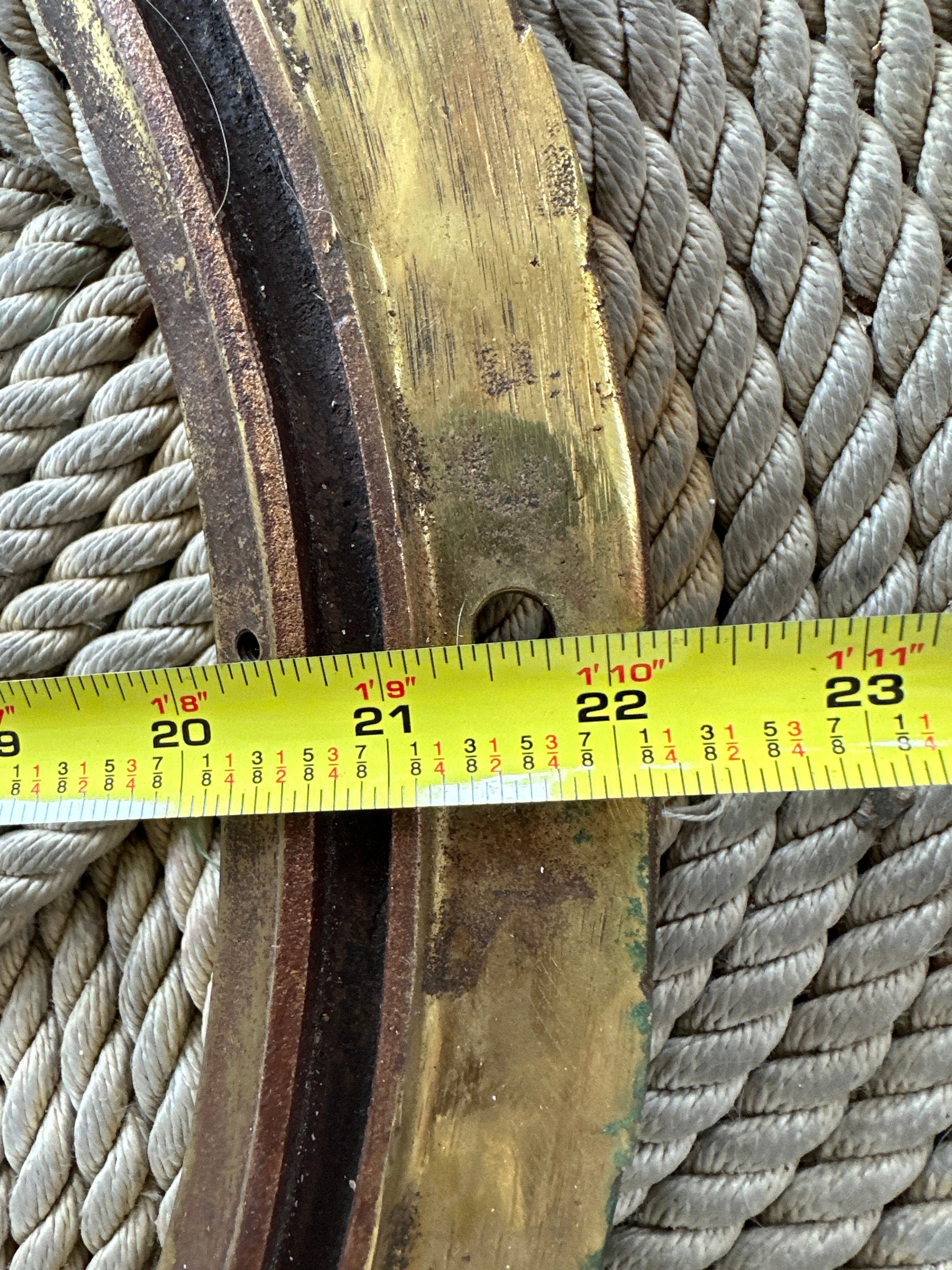 This large heavy brass port hole is in excellent condition. Has 4 functioning dogs. The glass is clean and has no damage. The ID of the glass is 17 7/8” while the OD of the whole port hole is about 22 1/8”. This is a very heavy duty authentic item.