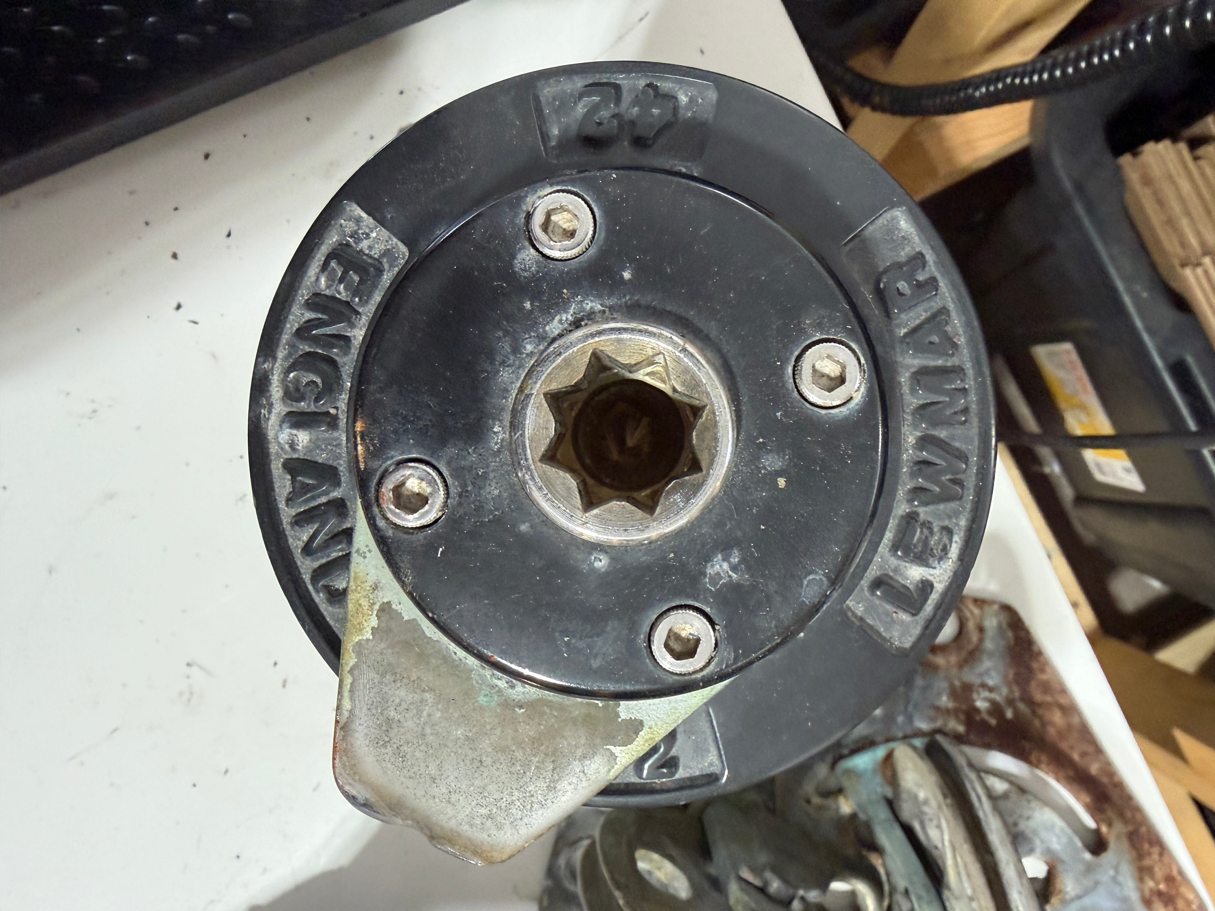 This lewmar 42 self tailing winch is in great condition. The body is chromed bronze with the plastic jaw. WILL NOT COME WITH THE MOUNTING BLOCKS.