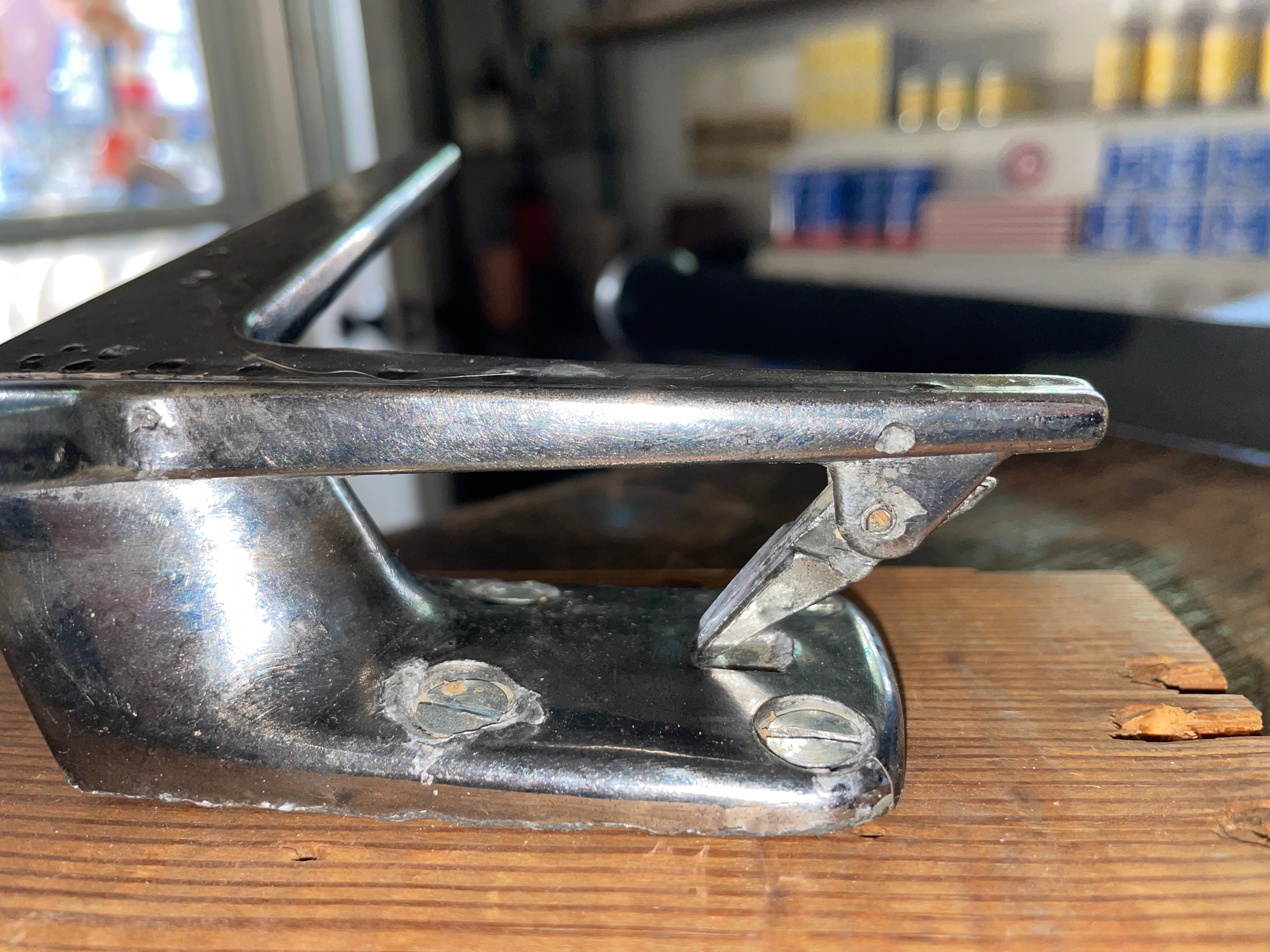 This unique locking bow cleat has a 1/2” width for line. It measures 7 1/4” tip to tip and 4 1/2” long. The base is 3 1/4” long x 1 1/2” wide with 4 bolt install. Stands 2” tall at the highest point. Not sure what kind of metal it is made out of but it is starting to pit at the top.