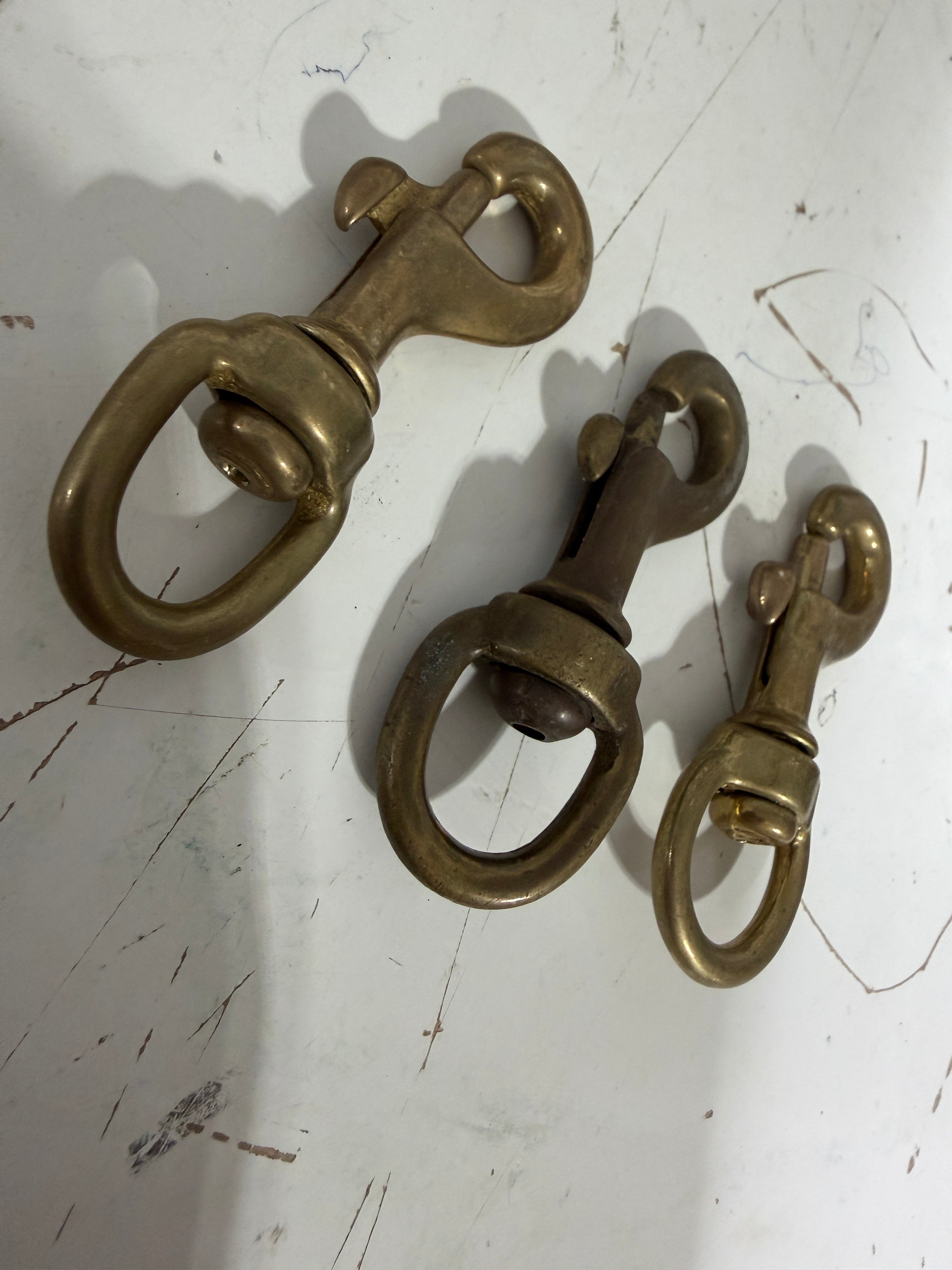 Set of 3 brass swivel clips. The bail is 5/8" diameter. All clips work as should. The clip is 3 1/8" total length.
