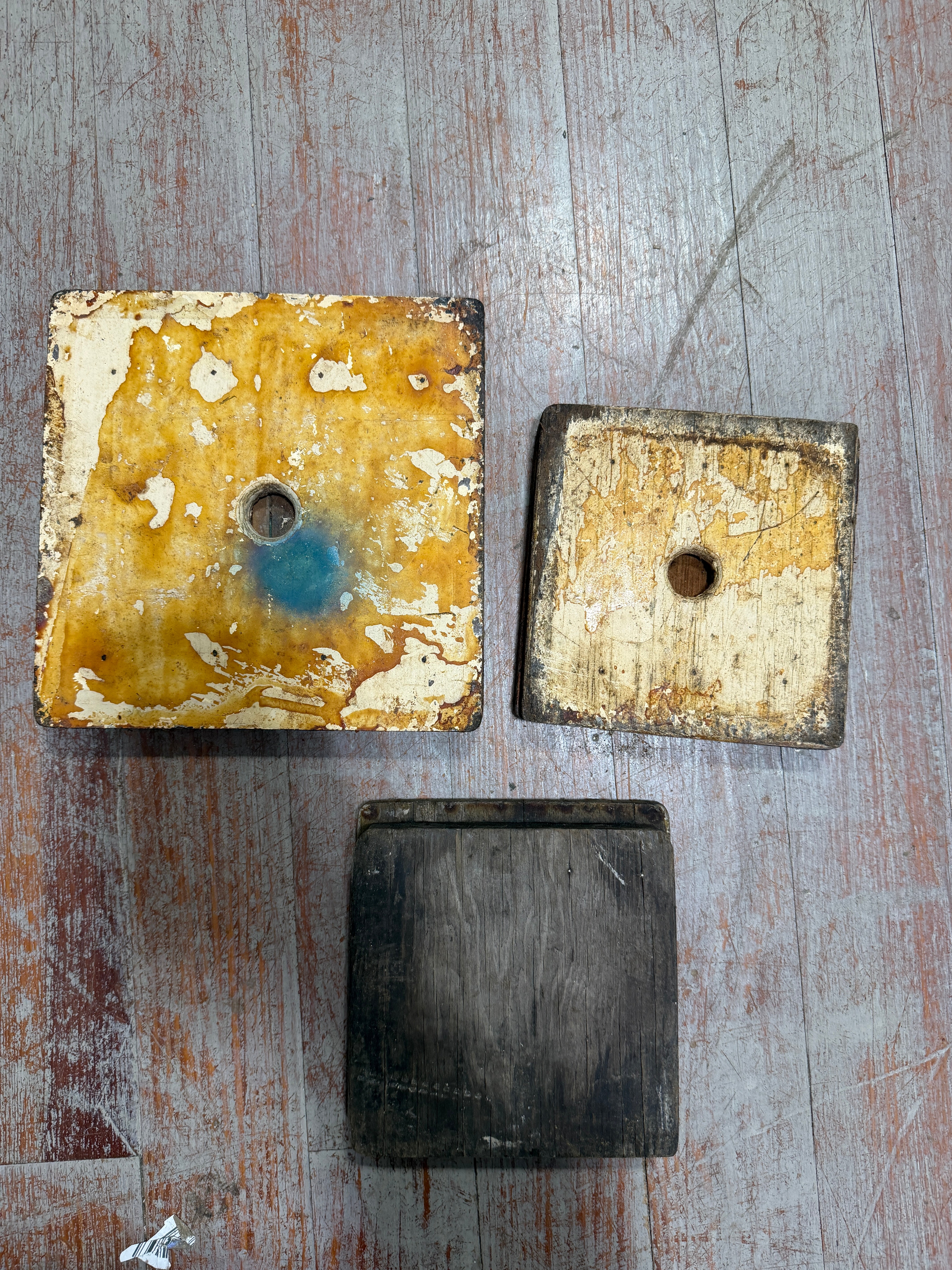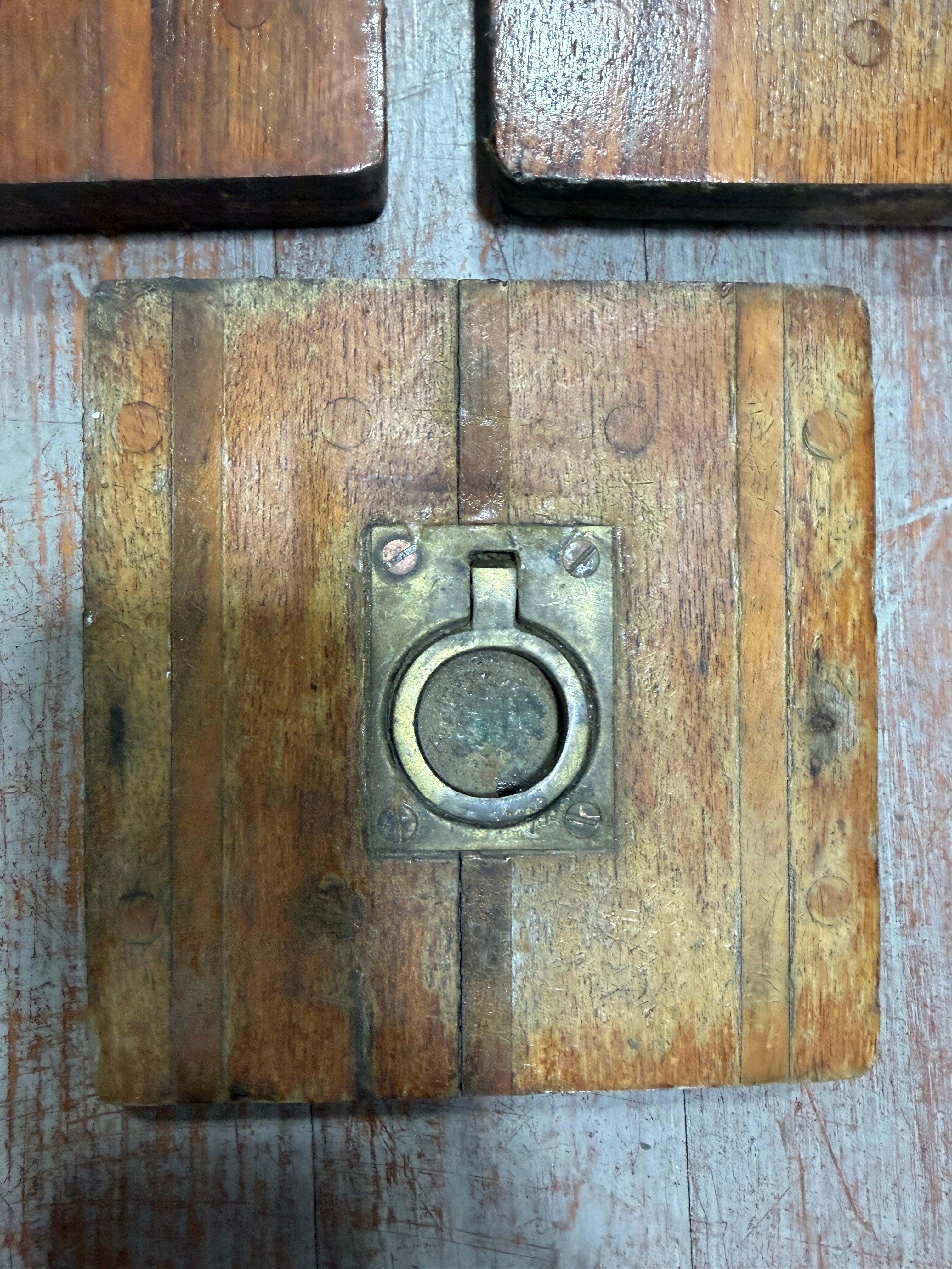 This is a lot of 3 small teak and holly floor boards. They are all well loved. The larger of the 3 measures 8 3/8" x 8 3/8" x 1" thick. The 2 smaller boards are the same size. 6" x6" x 1" thick. However one of these looks like the bottom was replaced and that board is shorter than the other ( see the last photo). This board is 6"x6" on the top and the insert is 5 3/4" x 1 1/8" thickness. Bronze rings all lift as should.
