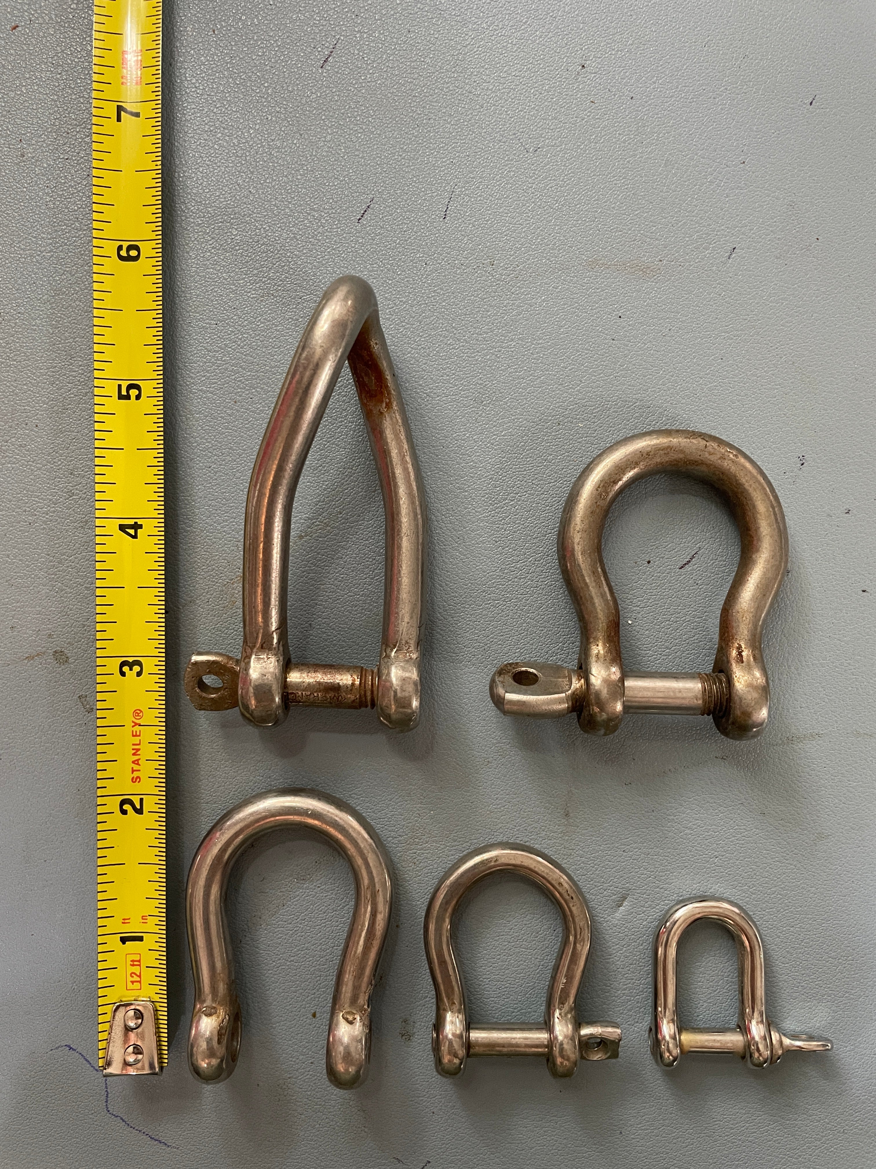This lot of 5 stainless steel shackles are in good condition. There are different widths for them - written on the second photo. The widths are 5/8" , 3/4" , 11/16" , 9/16" , 1/2".