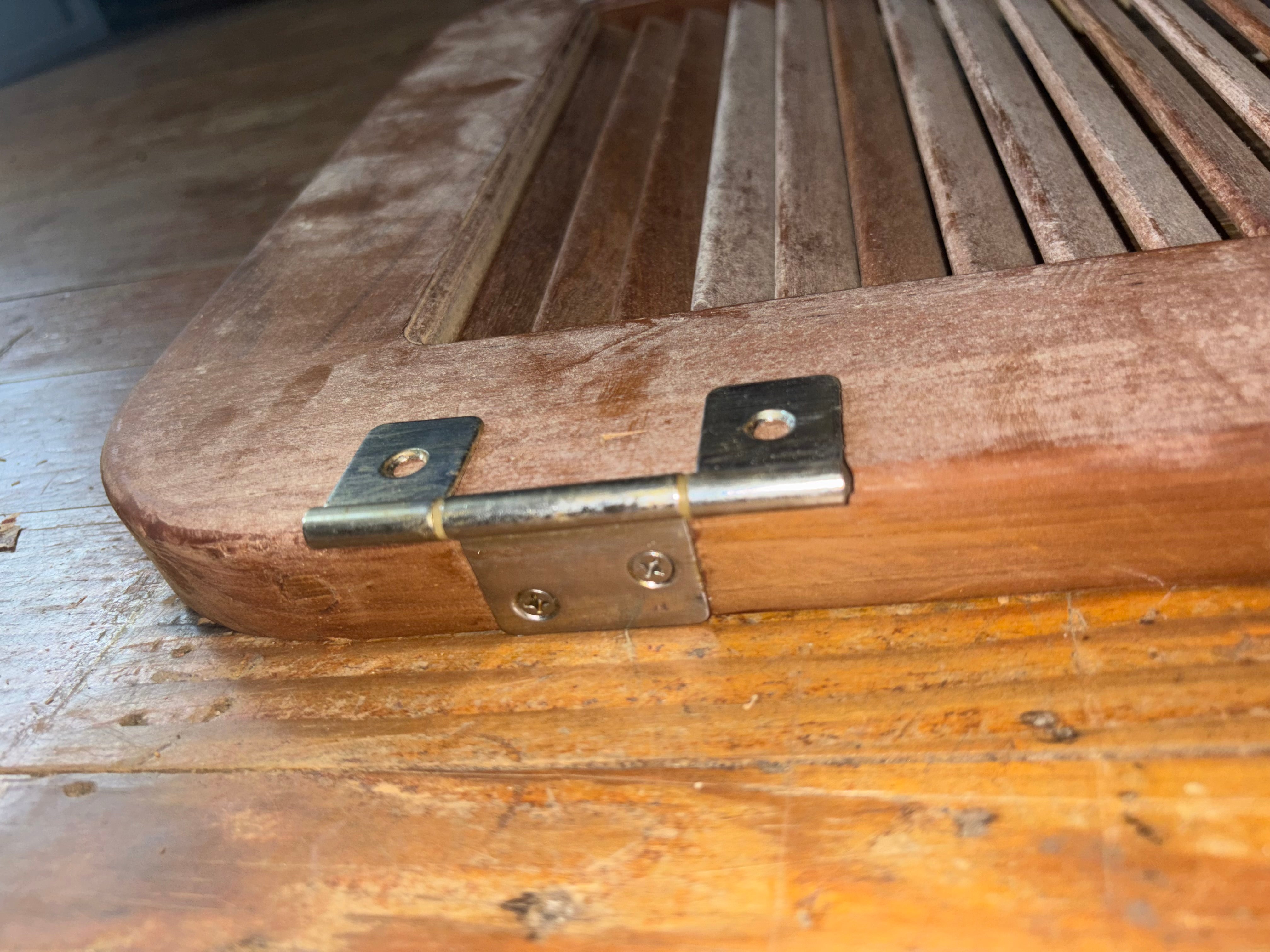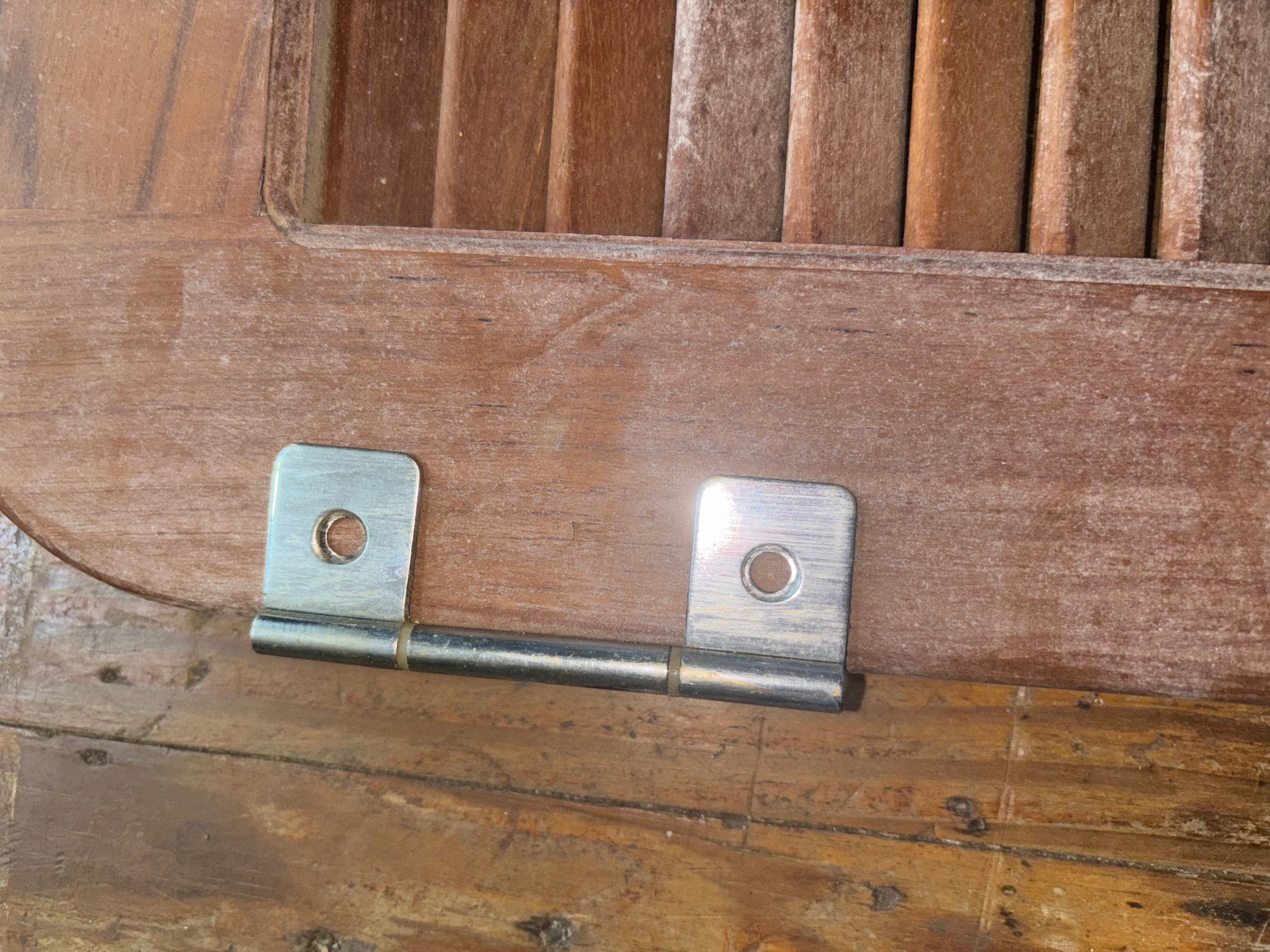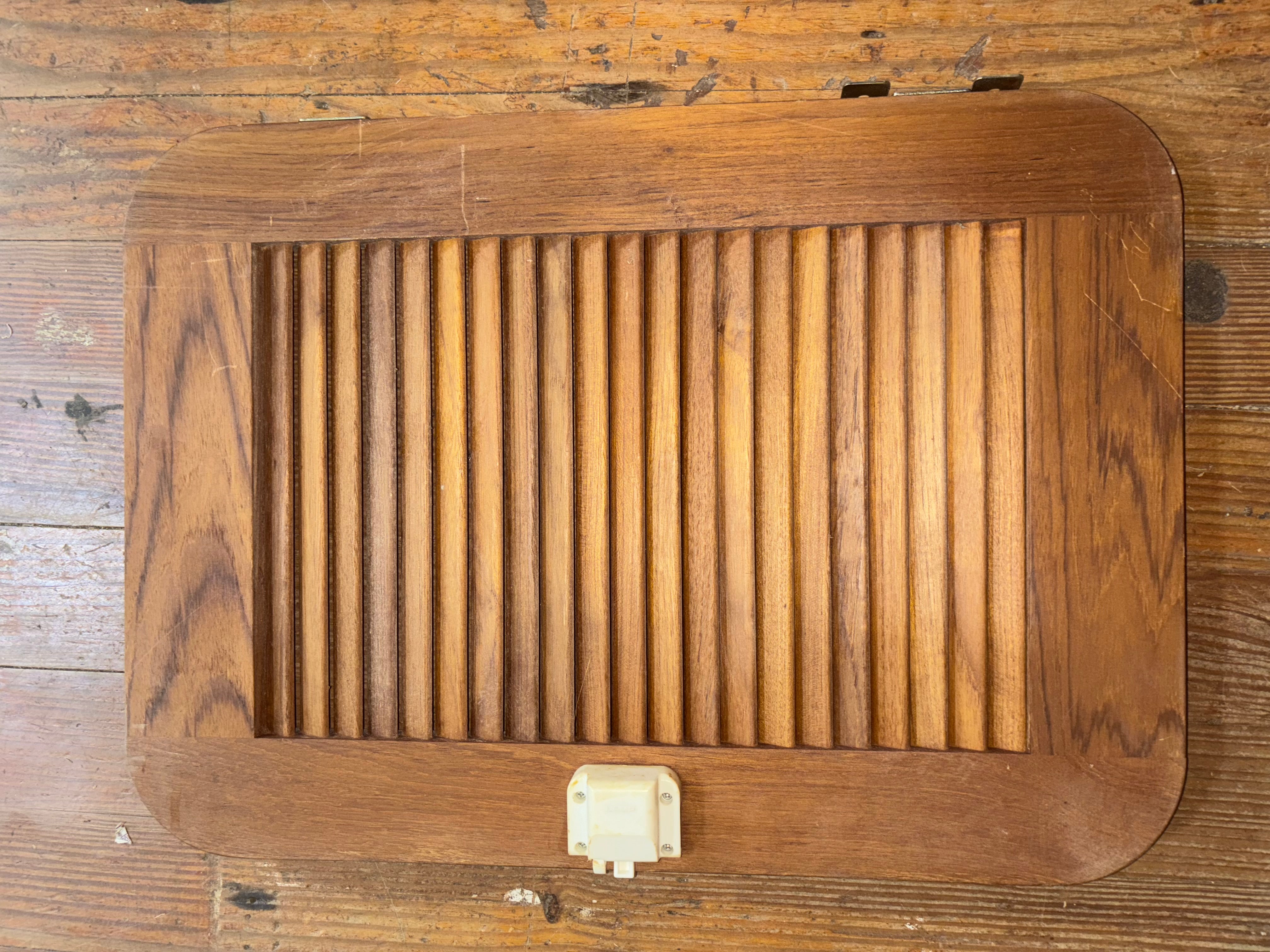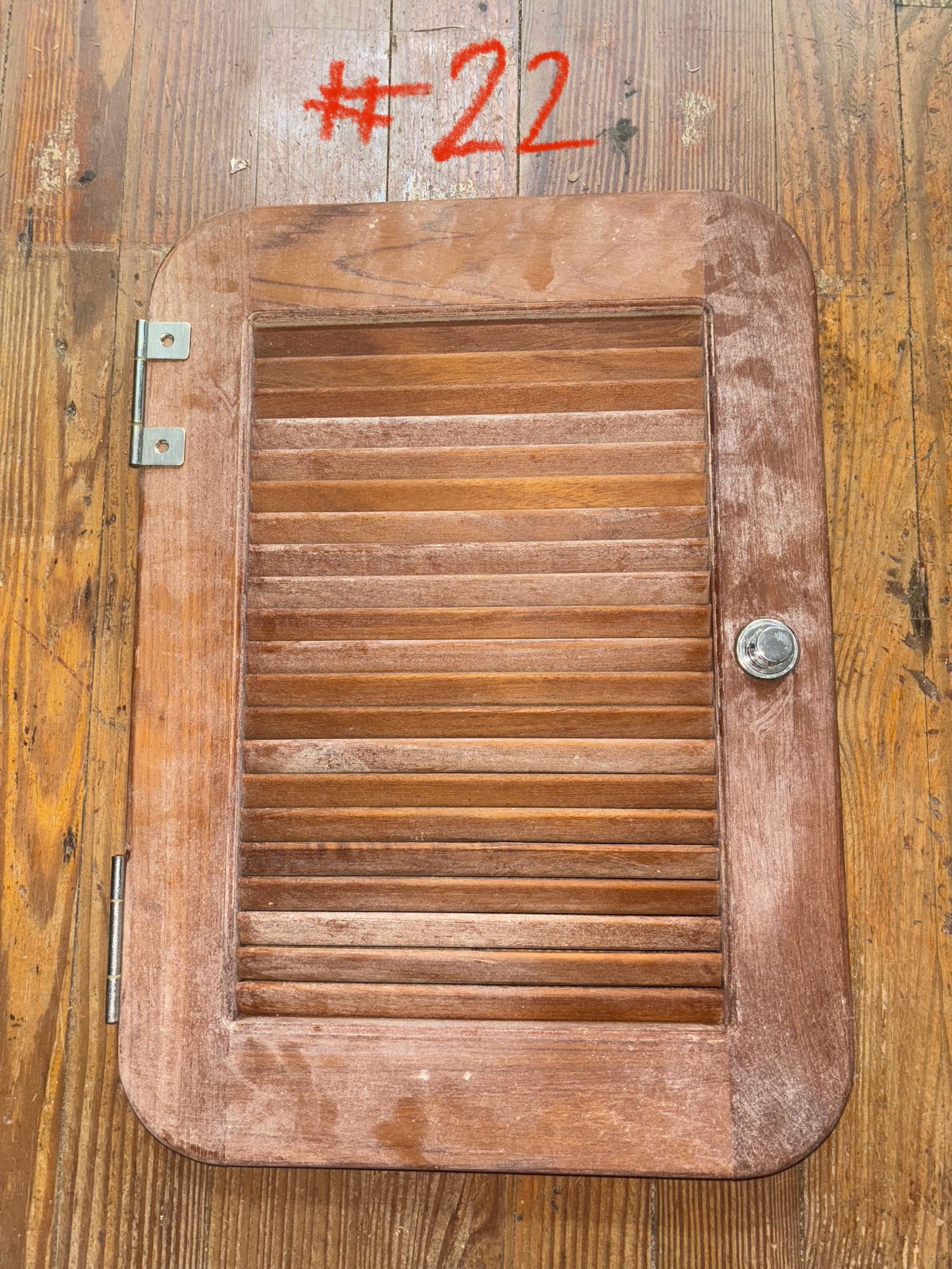 This louvered cabinet door is in good condition. The teak is very dull but would clean up. Hinges work as should and it has the nice push button handle. The door measures 21 1/2" long x 15 1/2" wide. It is rounded so these measurements are right now the center.