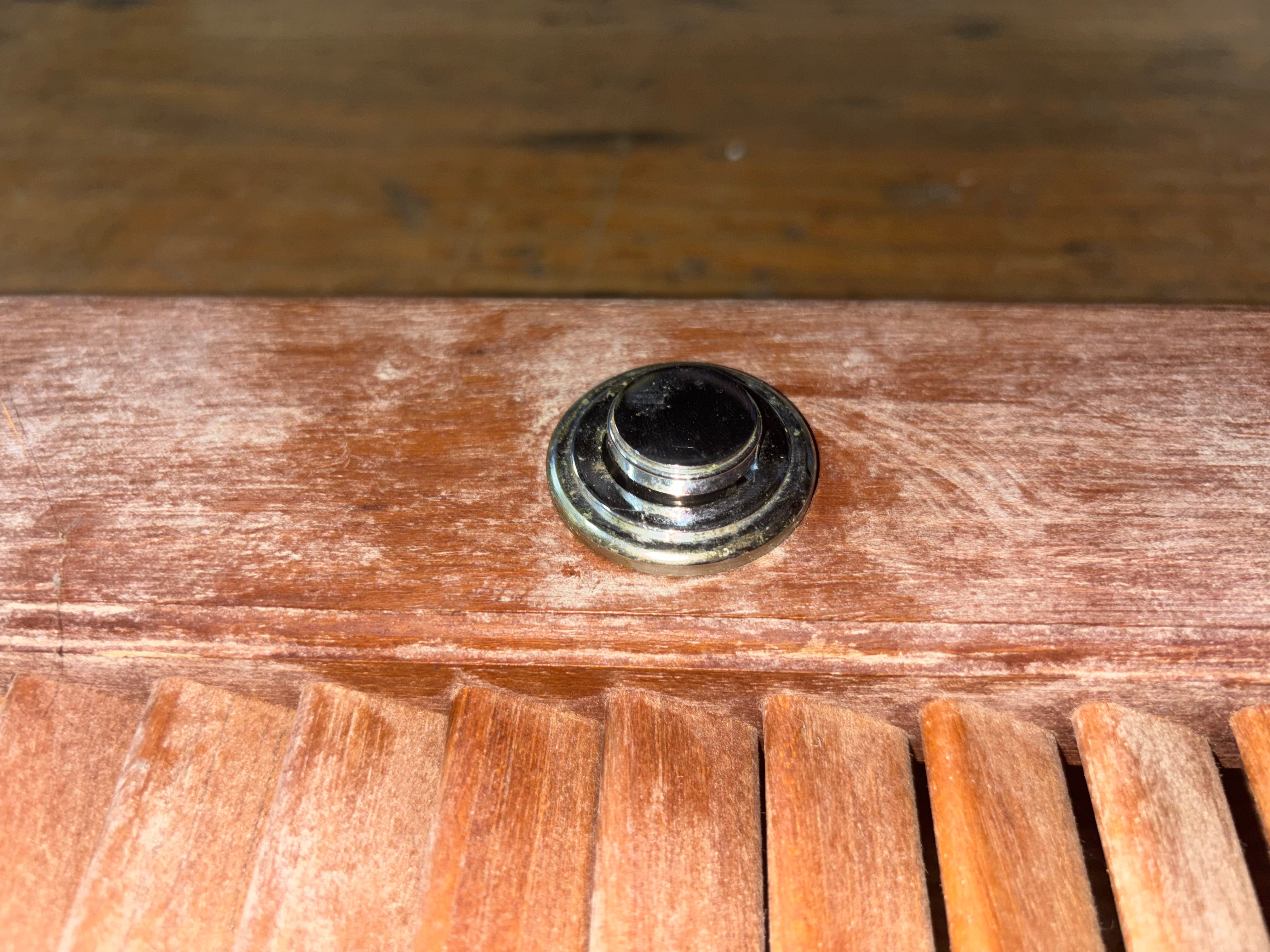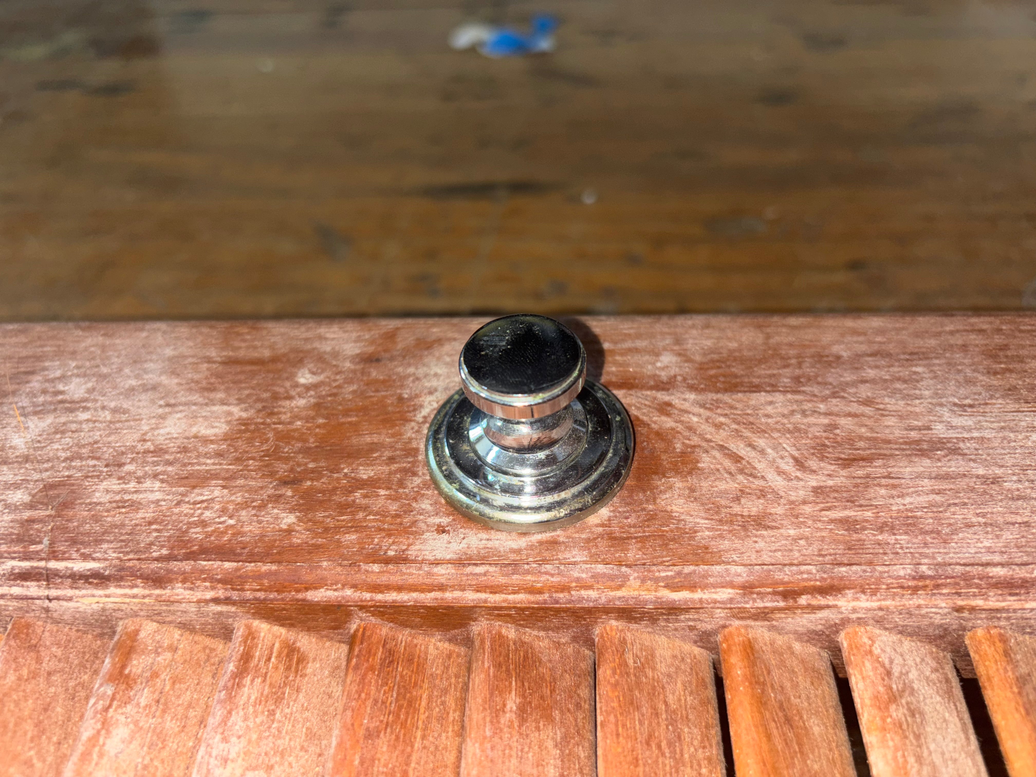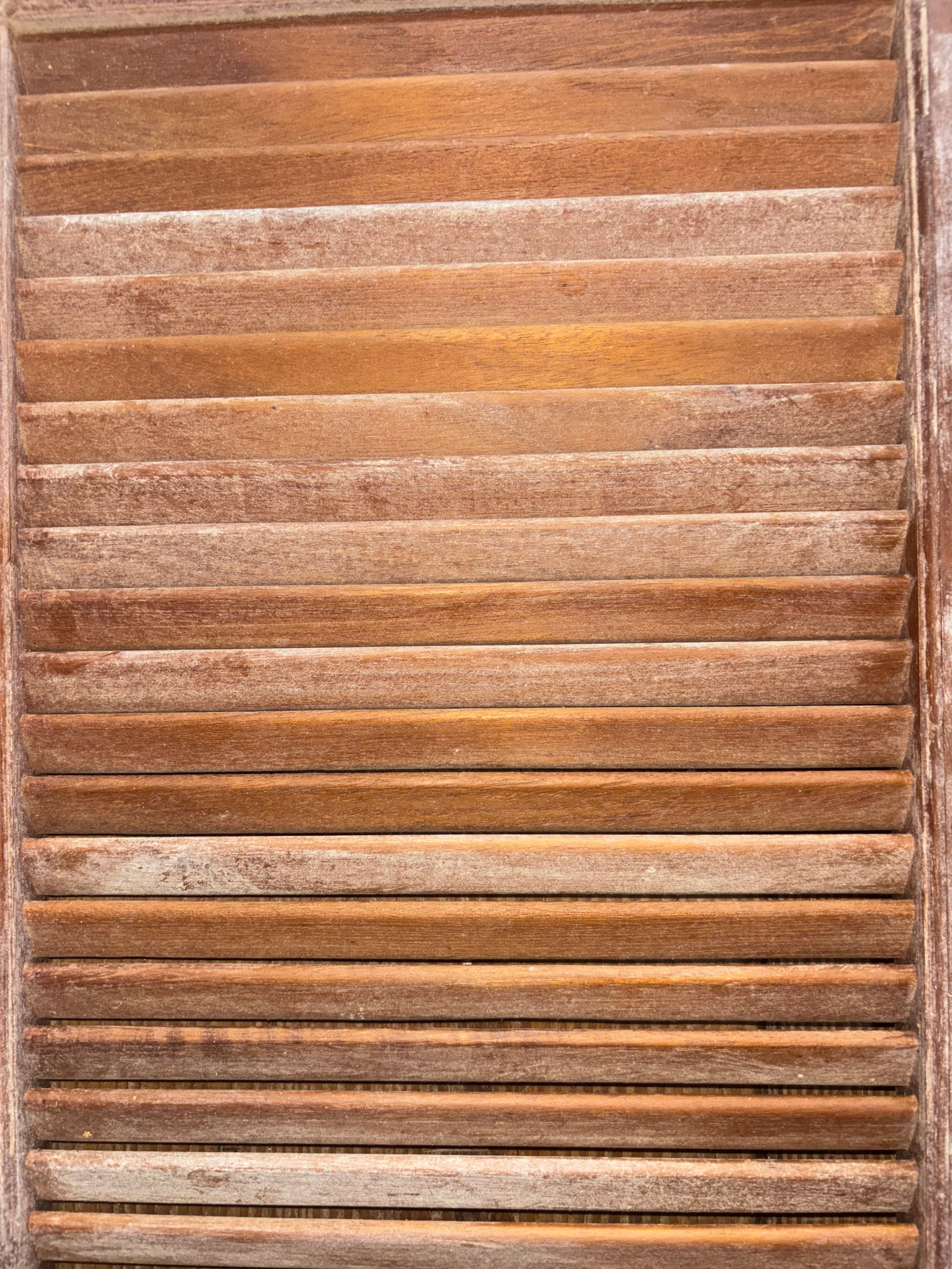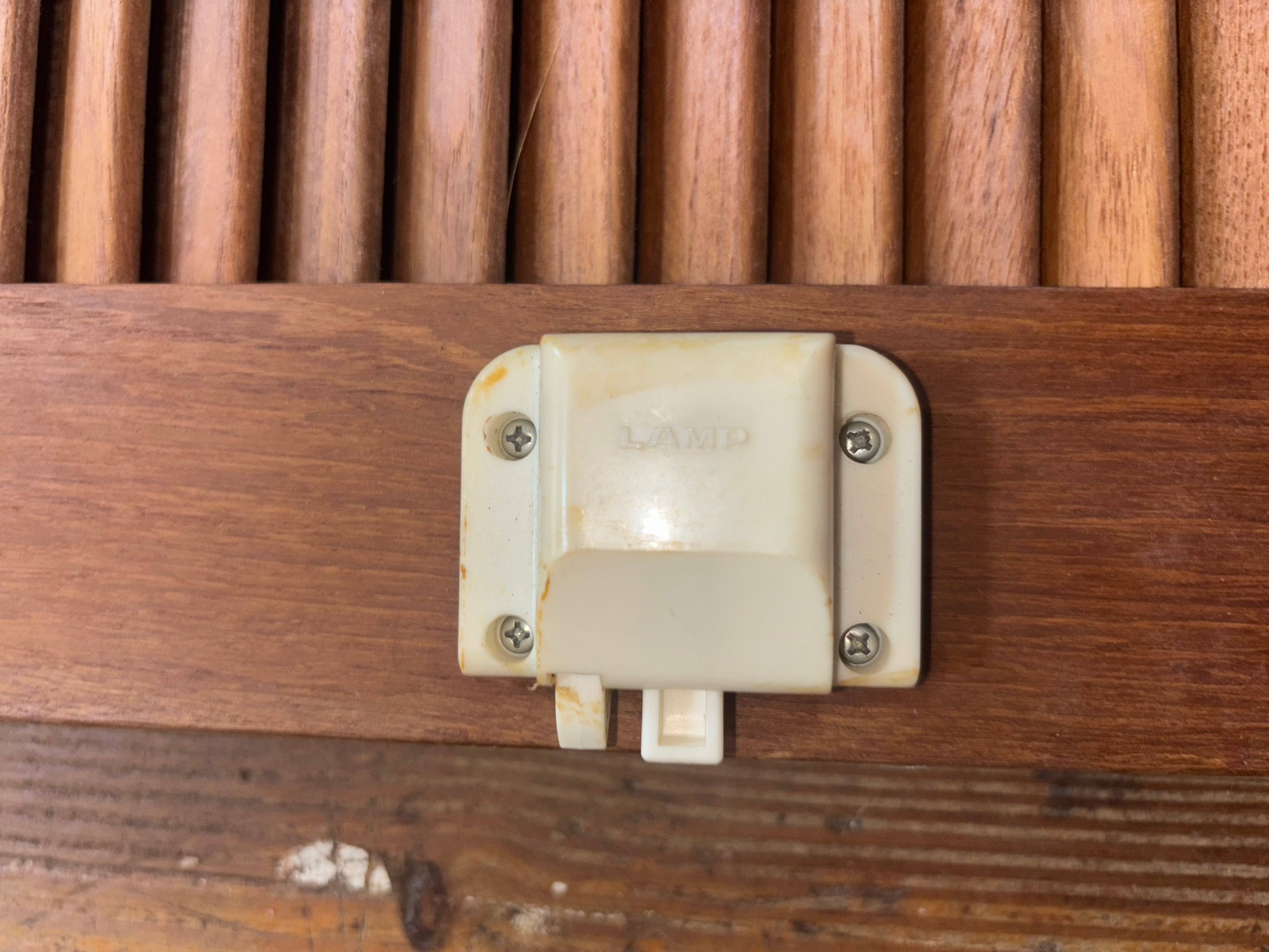 This louvered cabinet door is in good condition. The teak is very dull but would clean up. Hinges work as should and it has the nice push button handle. The door measures 21 1/2" long x 15 1/2" wide. It is rounded so these measurements are right now the center.