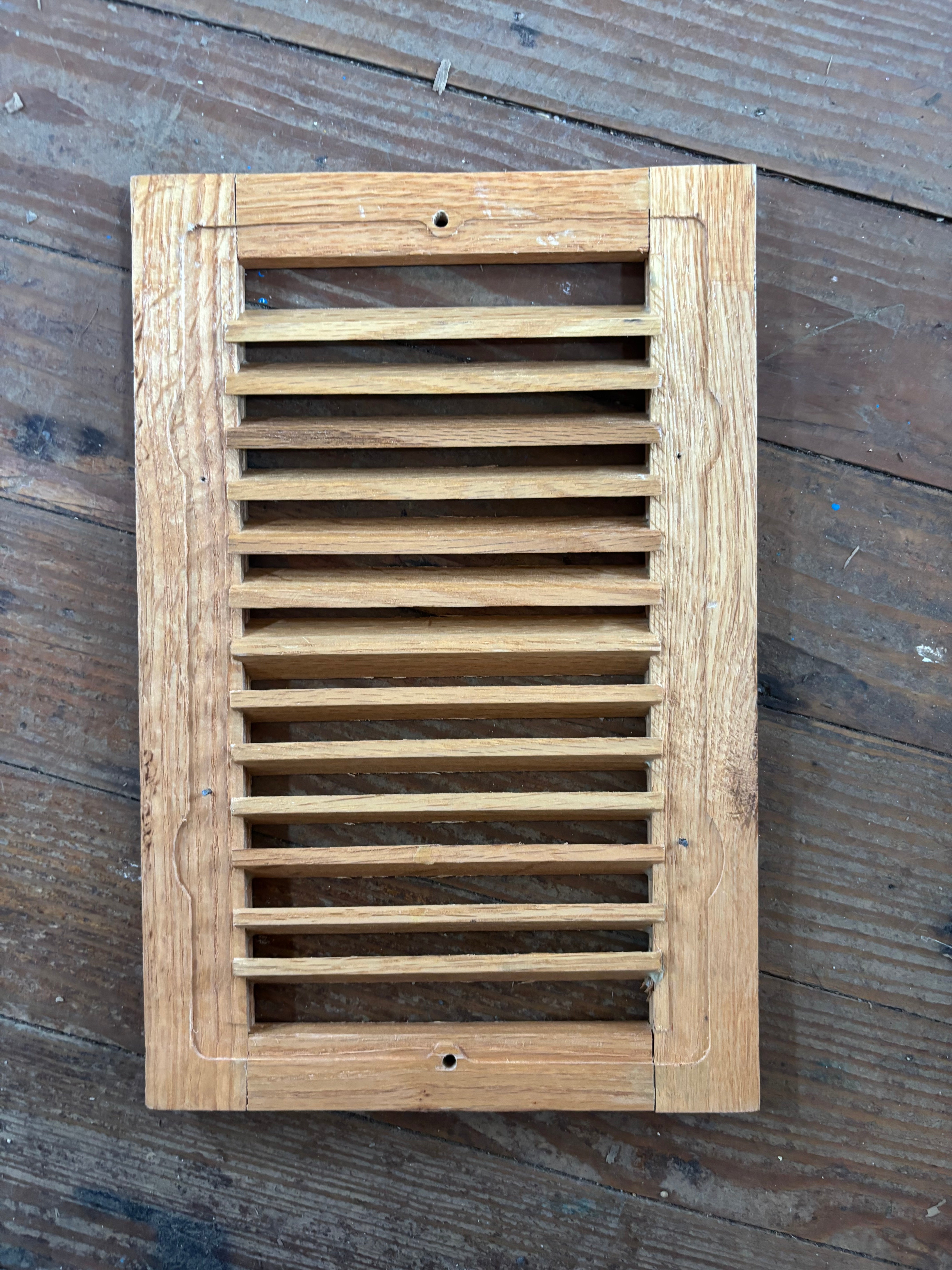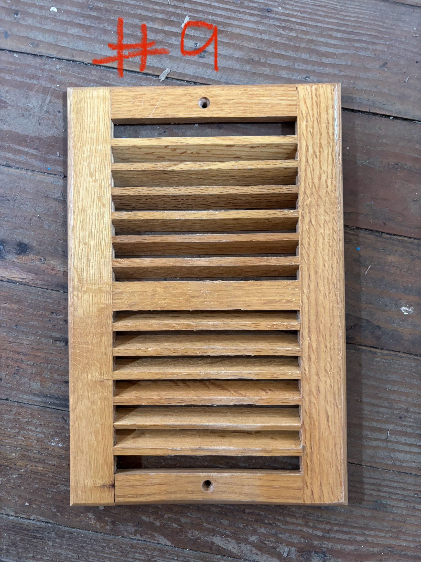 This louvered vent cover is in great condition. Natural wood finish. It measures 11 1/2" long x 7 1/2" wide. It mounts by being screwed through at the top and bottom. The mounting screws are 10 1/4" apart.